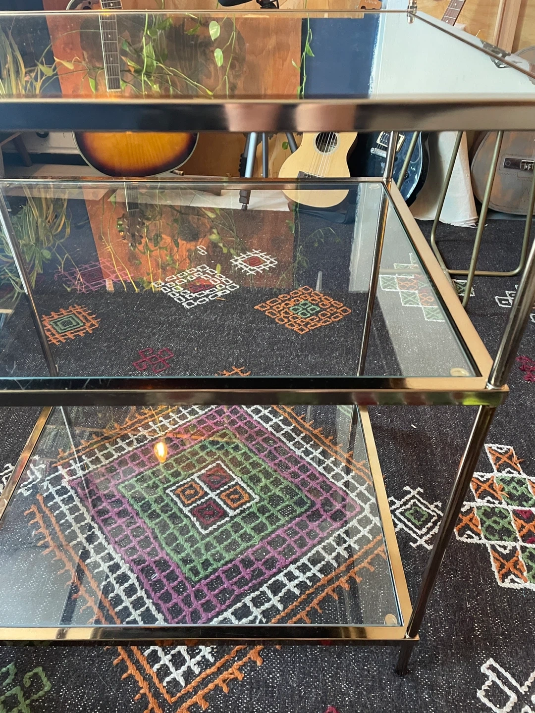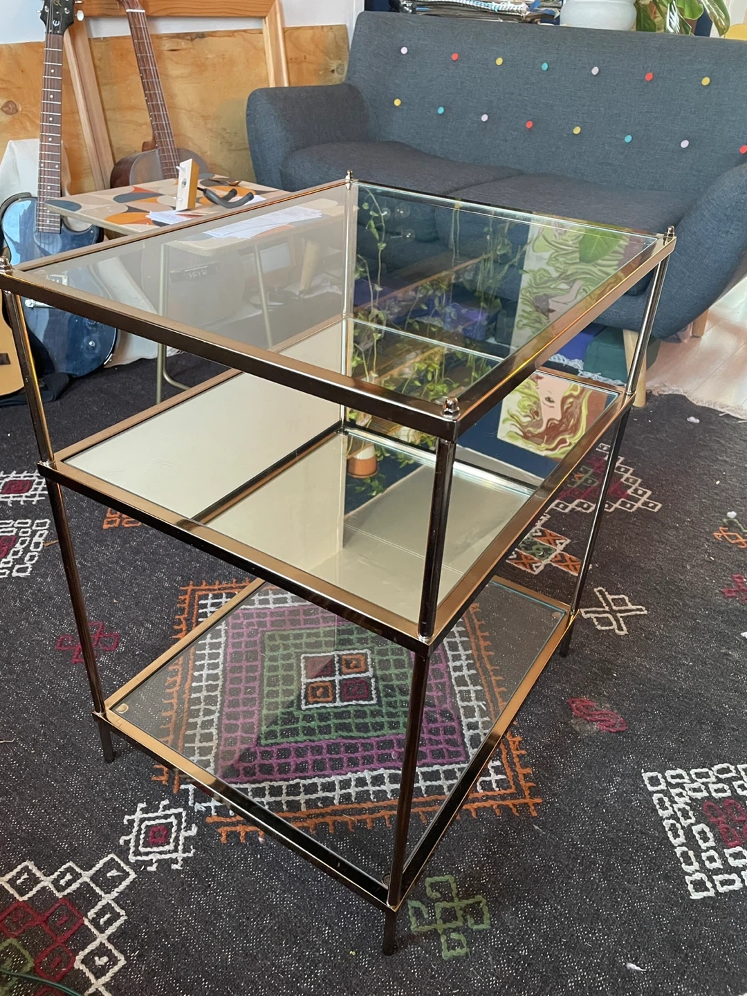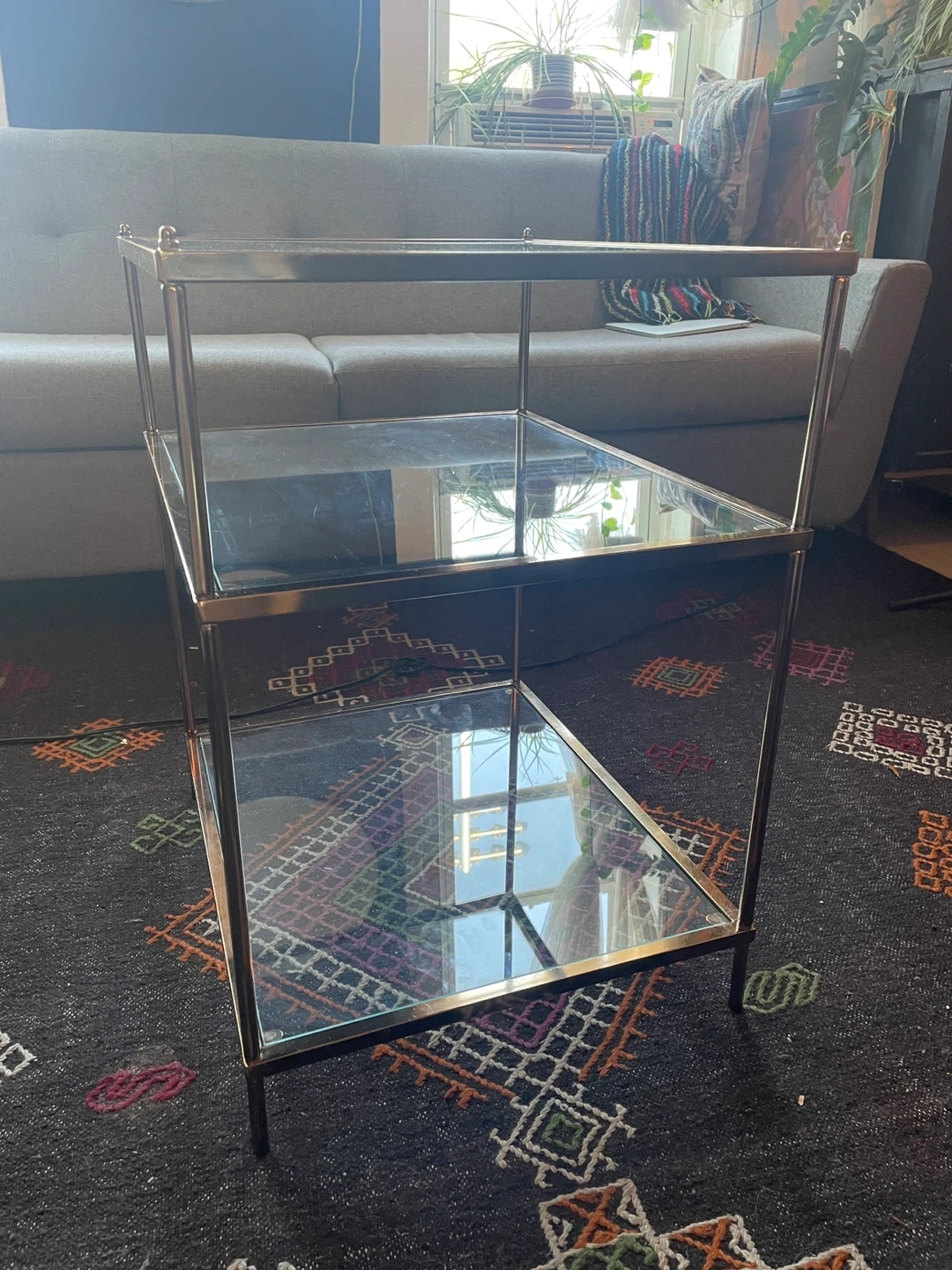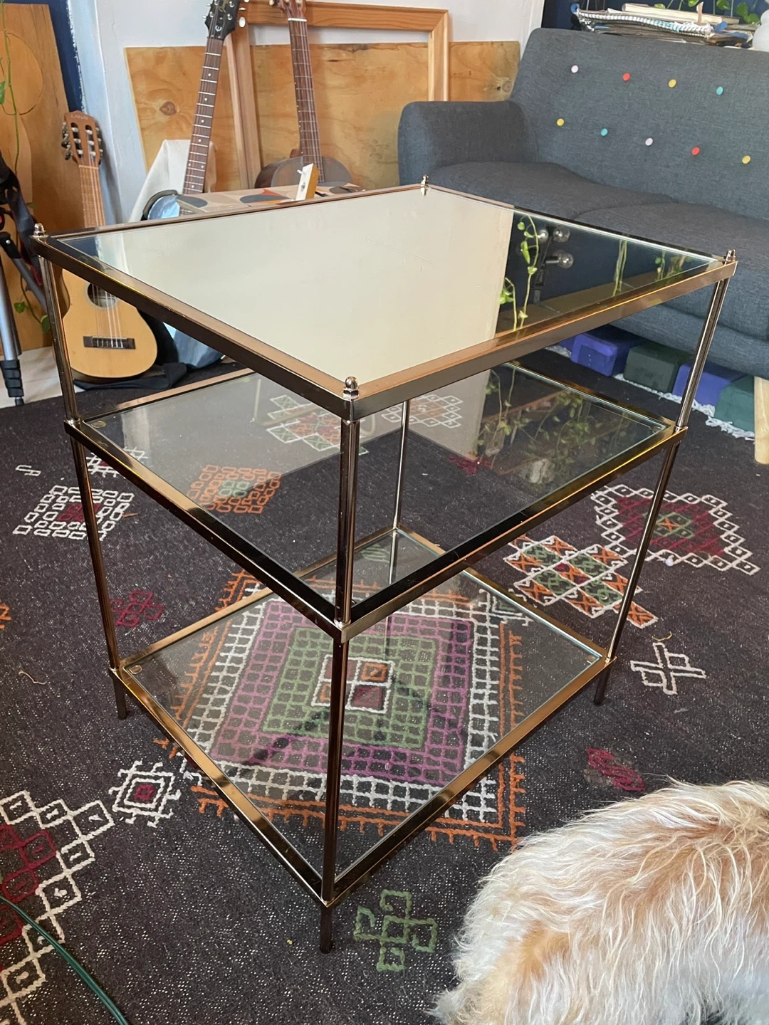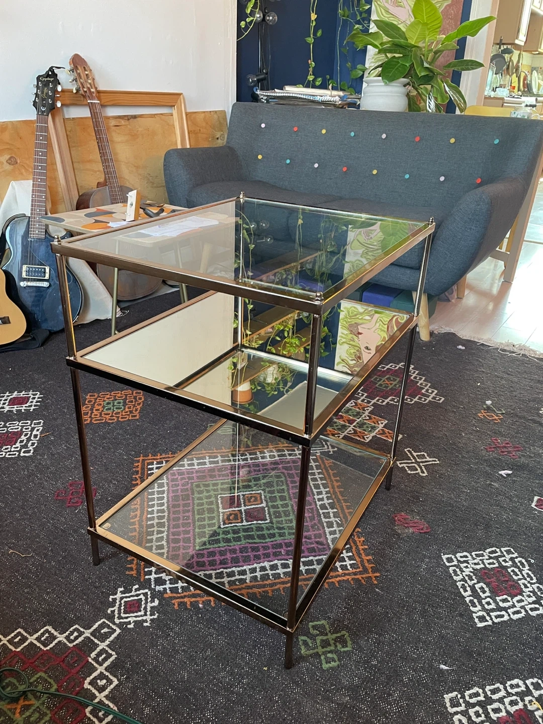 65Selling a stylish 3-tier side table featuring a gold metal frame and glass shelves! It's perfect for adding a touch of elegance to any room. Would work great as a side table or plant stand. Slight scratches on glass. Mirror is in good shape. Can be broken down into parts for easy moving. Easy to clean.