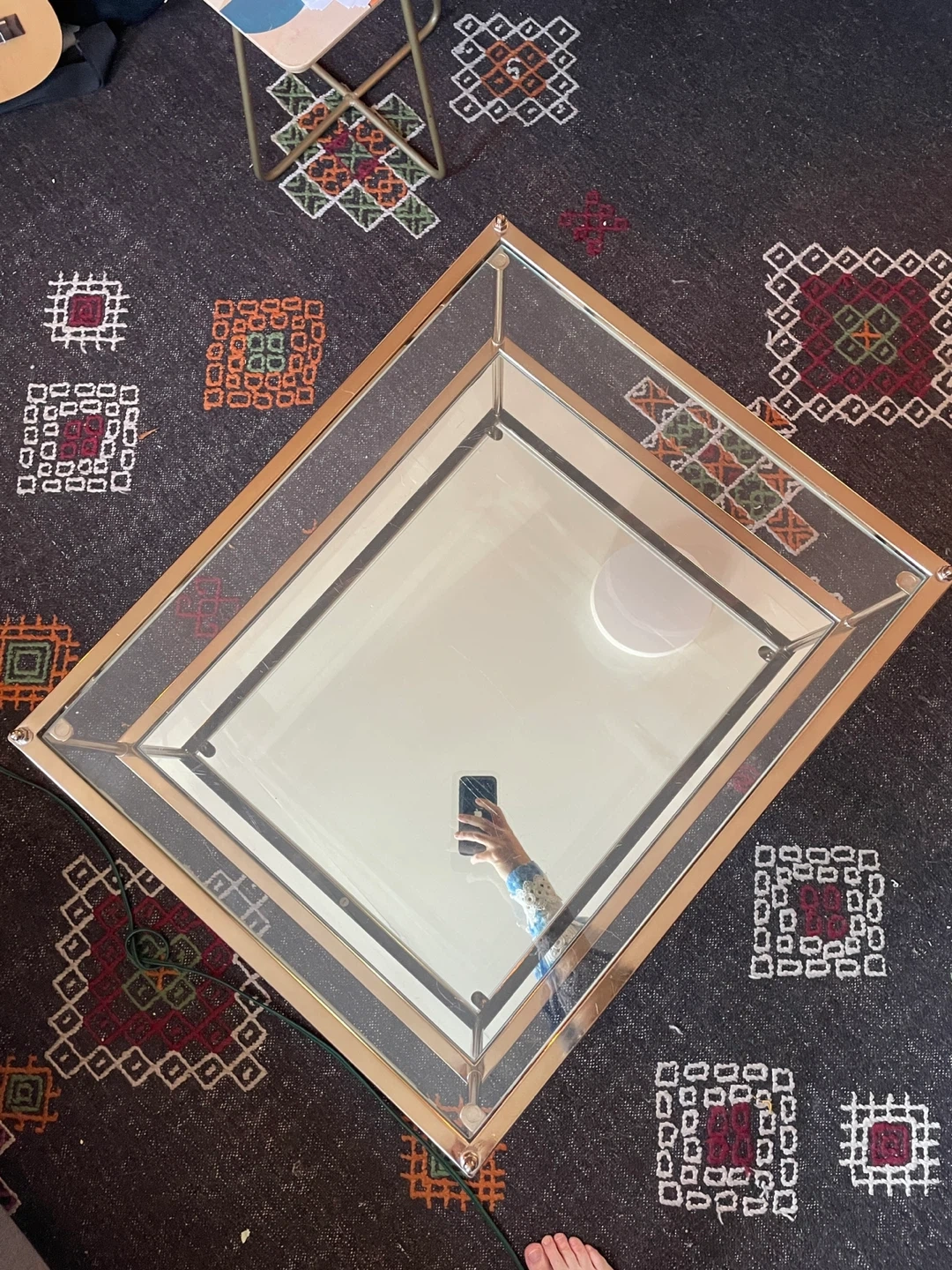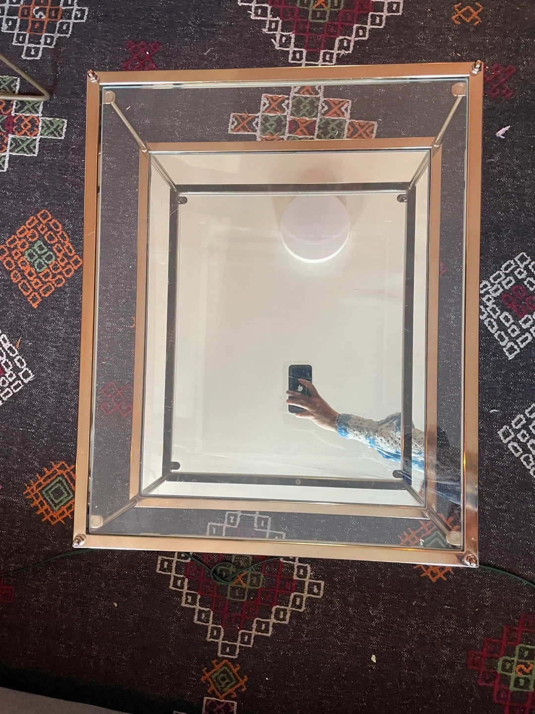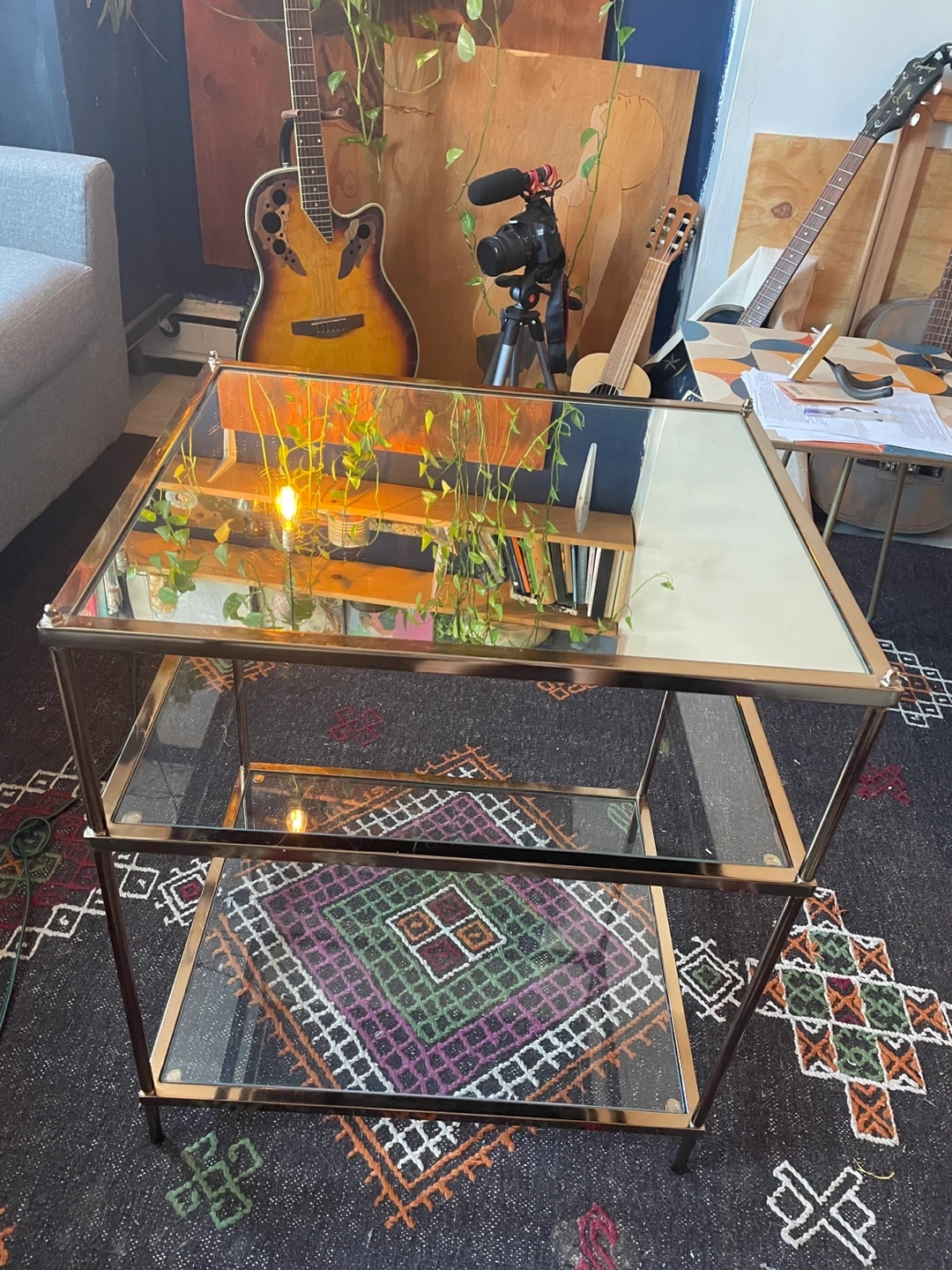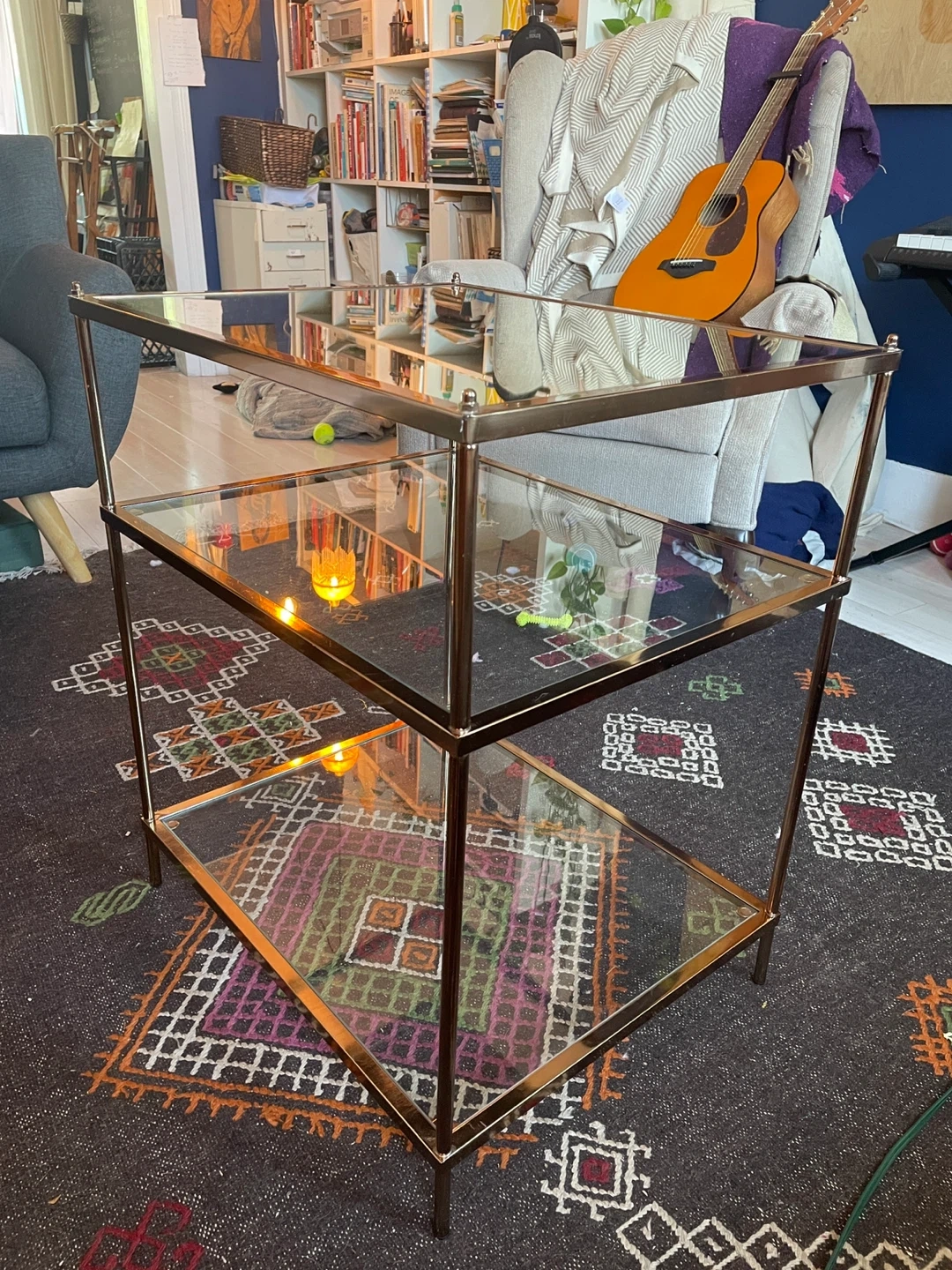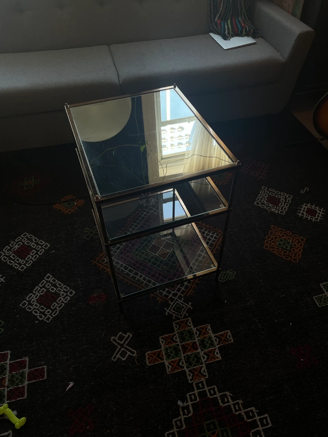 65Selling a stylish 3-tier side table featuring a gold metal frame and glass shelves! It's perfect for adding a touch of elegance to any room. Would work great as a side table or plant stand. Slight scratches on glass. Mirror is in good shape. Can be broken down into parts for easy moving. Easy to clean.