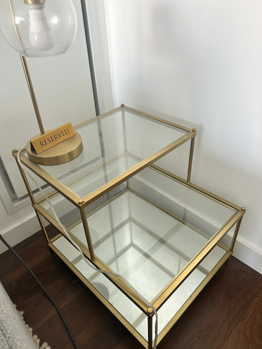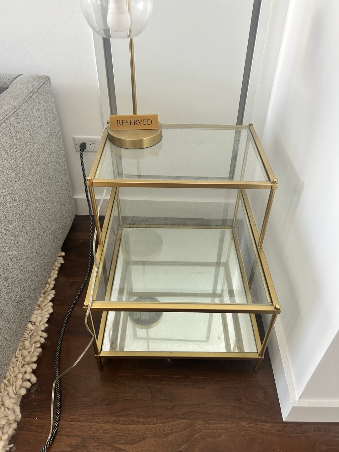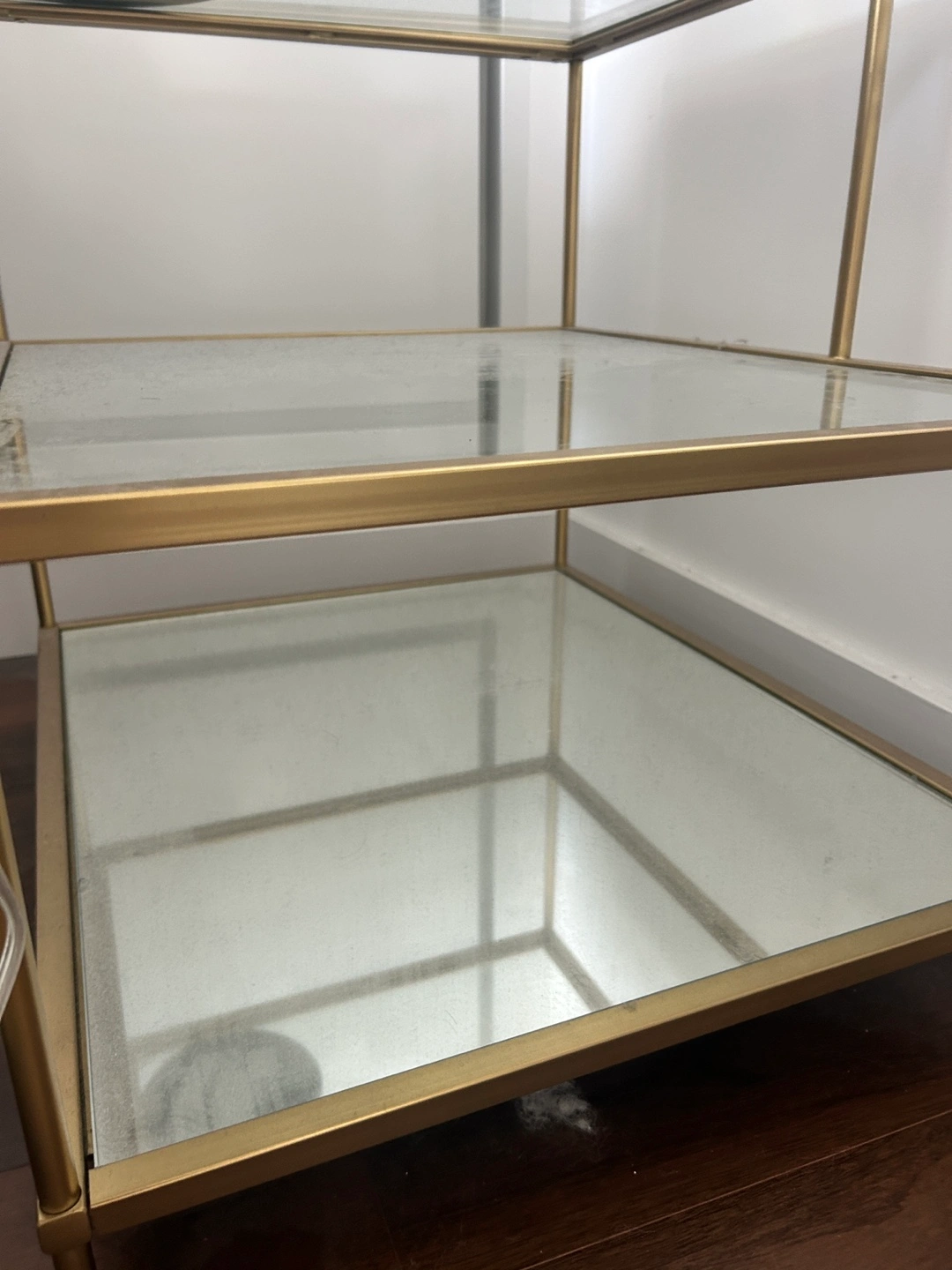 66Selling a stylish gold metal and glass side table with three tiers. It's perfect for adding a touch of elegance to any room! The table features a sturdy metal frame with glass shelves, offering both durability and a sleek look