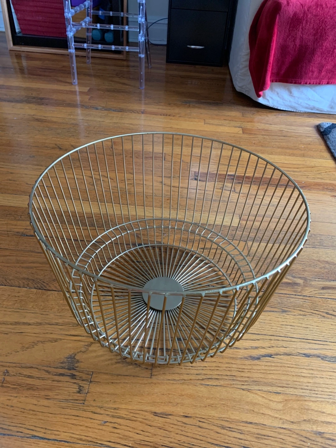 Large gold wire basket. Perfect for storage or decor. Measures approximately 18 inches in diameter and 11 inches tall. Heavy and sturdy.