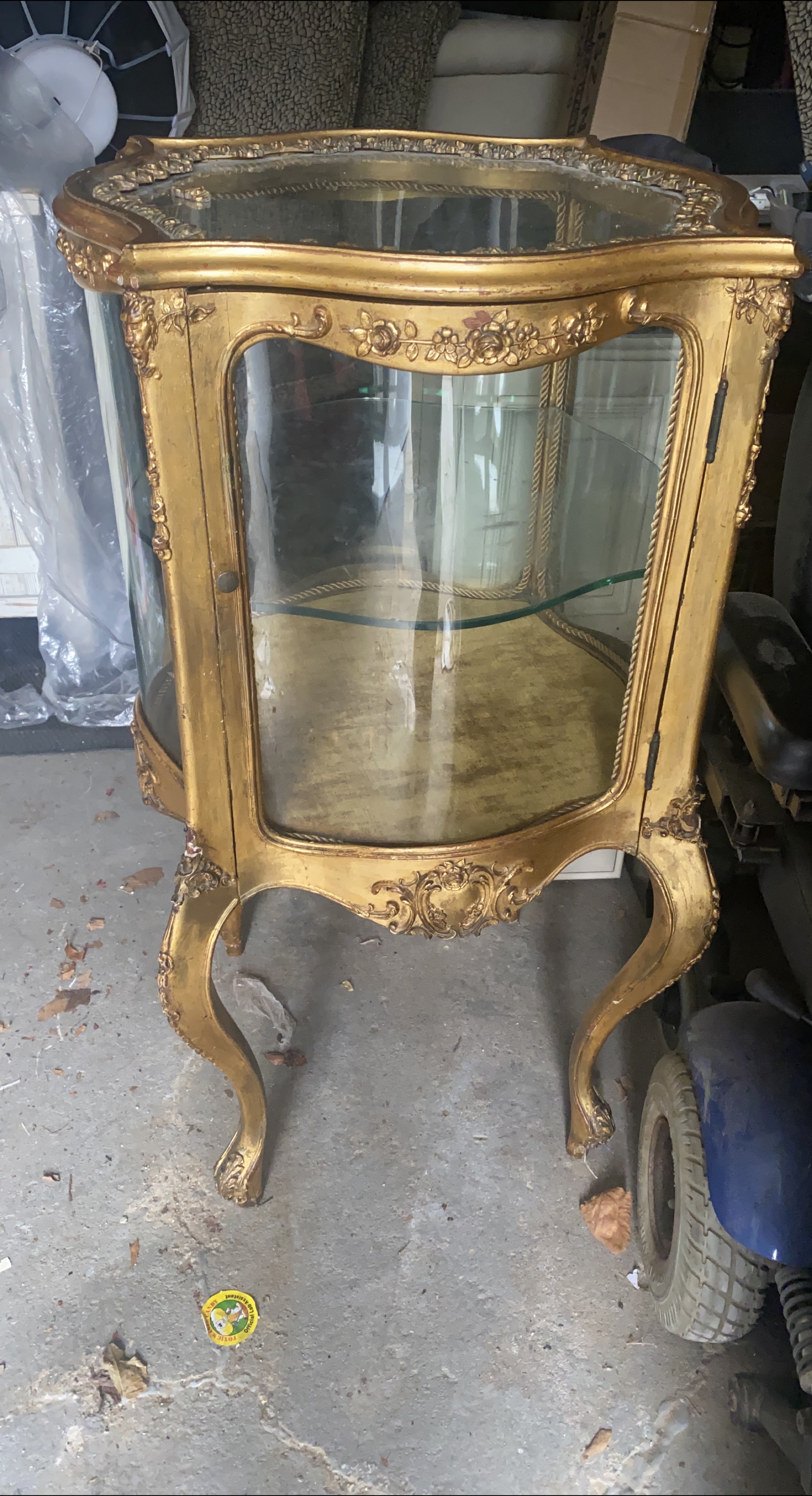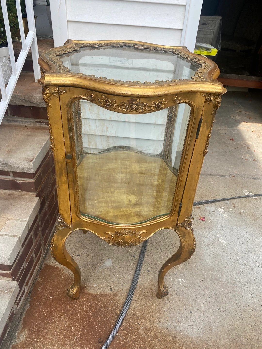 Selling a beautiful gold ornate display cabinet! It has a glass top and door, perfect for showcasing your favorite items. The cabinet features intricate detailing and a unique design that will add a touch of elegance to any room