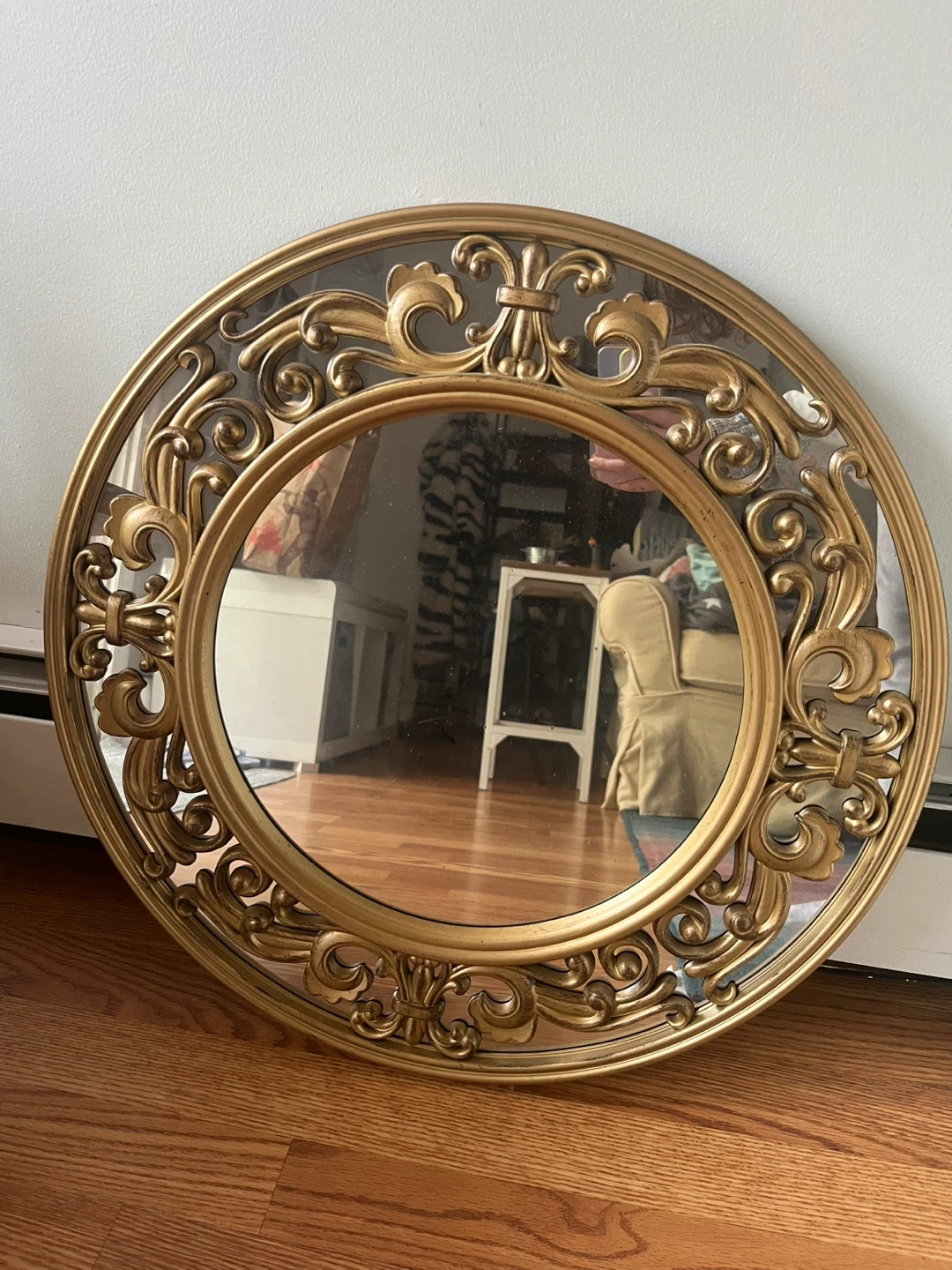 10Selling a beautiful vintage inspired, gold round decorative wall mirror! It has an ornate design around the frame, adding a touch of elegance to any room. It's in great condition and ready to brighten up your space