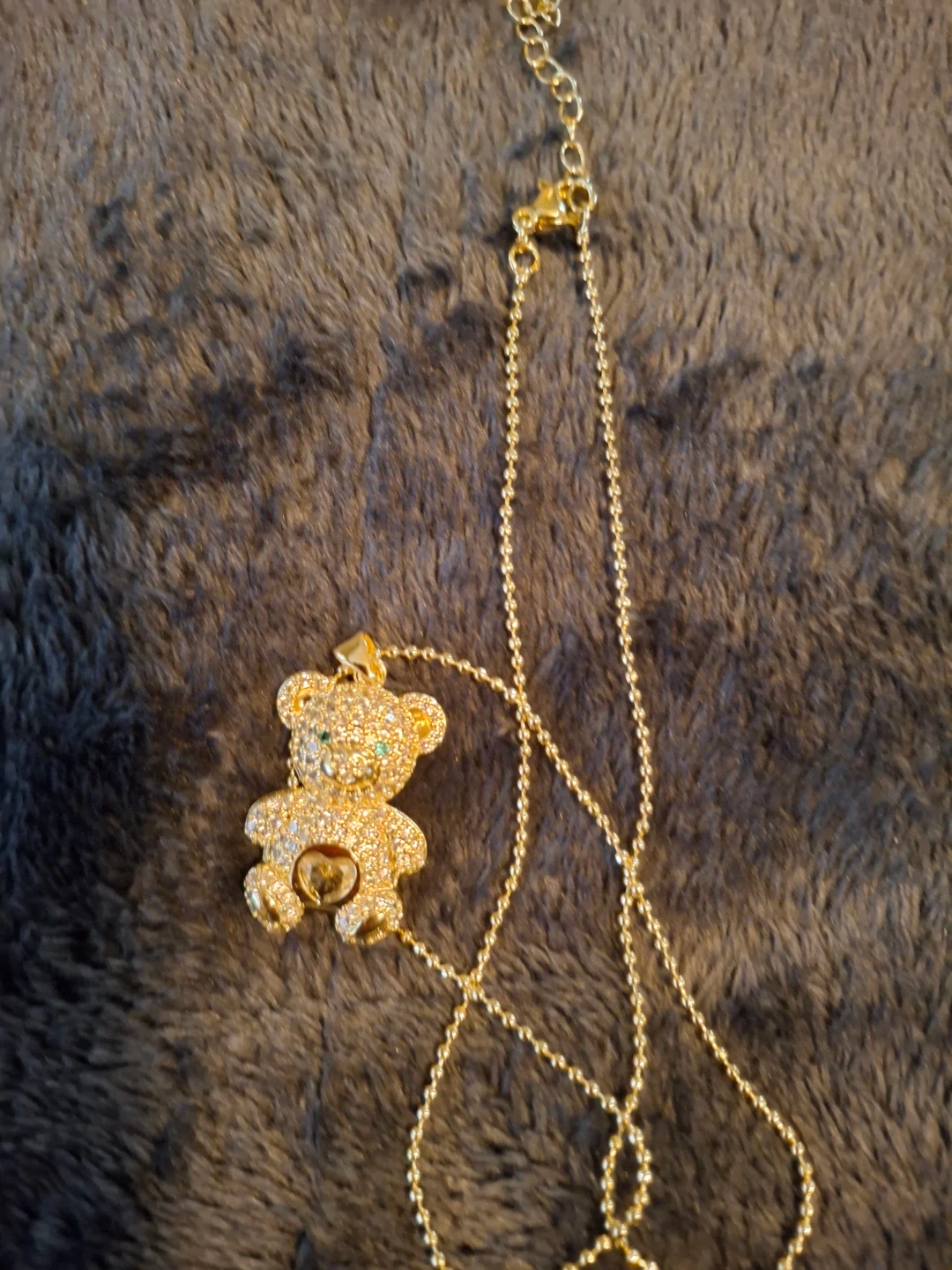 60Cute gold teddy bear pendant necklace! It has a heart on the belly and green eyes. Perfect for a gift or to treat yourself!