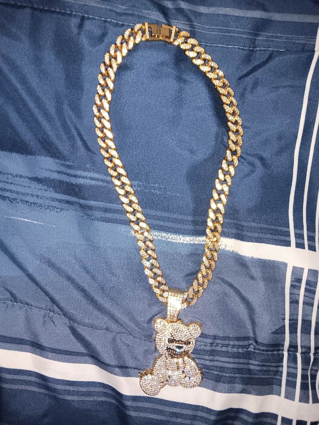 5Selling a gold-tone chain necklace featuring a teddy bear pendant. It's in great condition and ready to add some sparkle to your style!