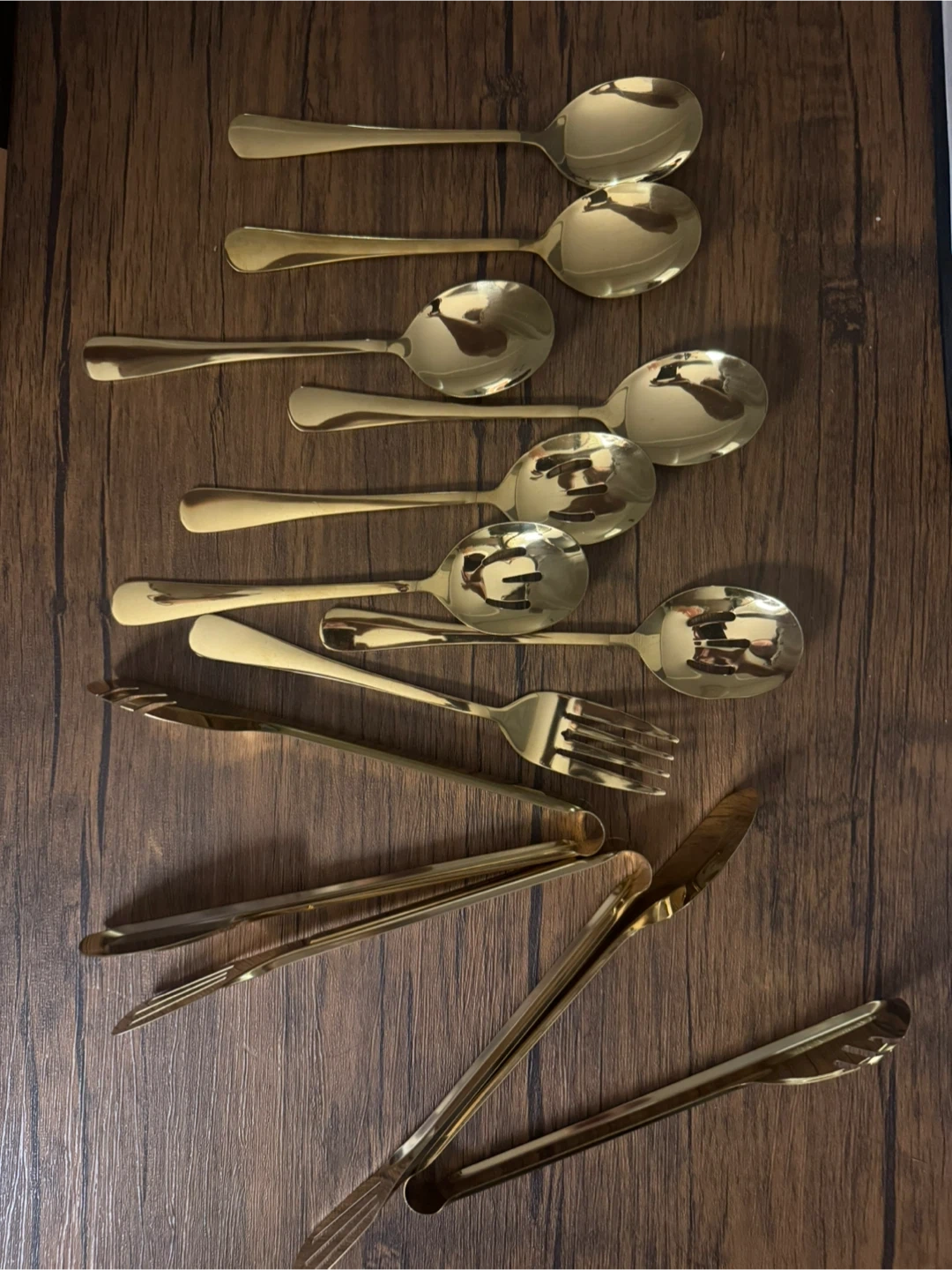 10Selling a 11 piece set of gold-tone servingware! Includes spoons, forks, and tongs. Perfect for adding a touch of elegance to your dining experience