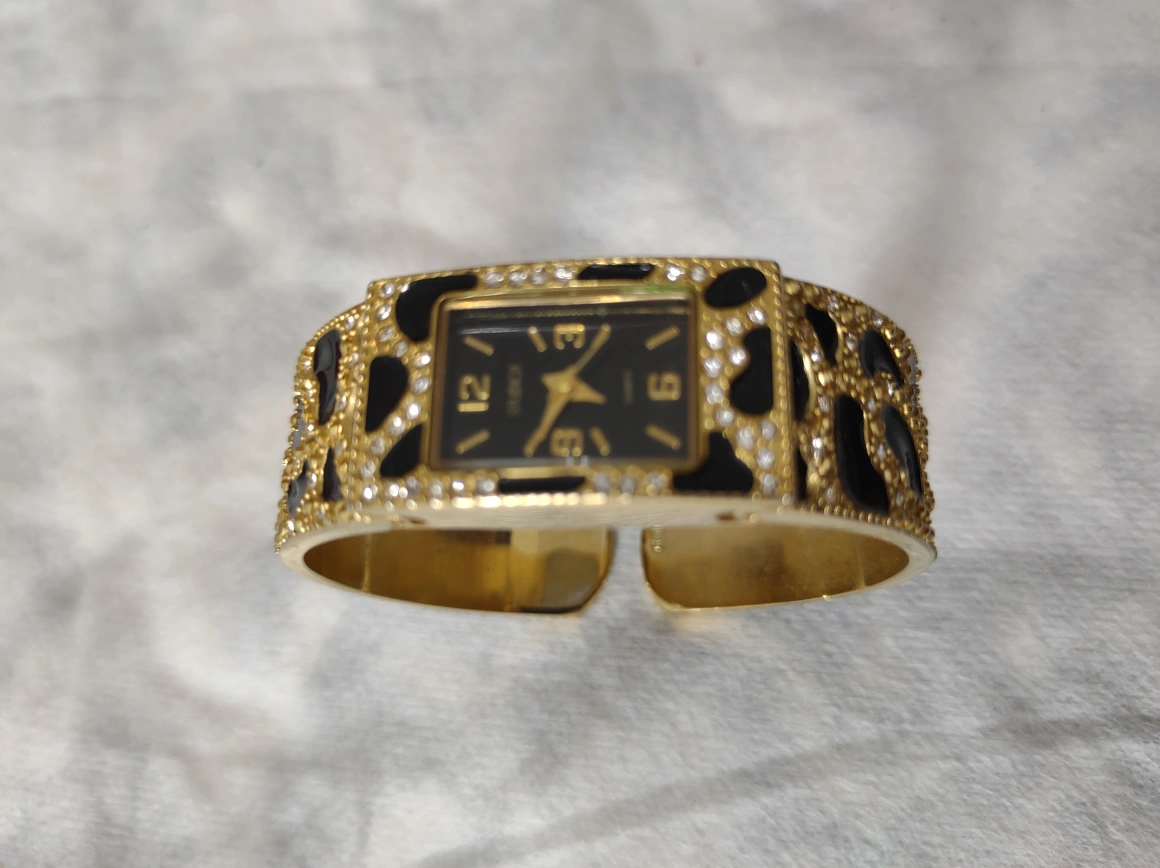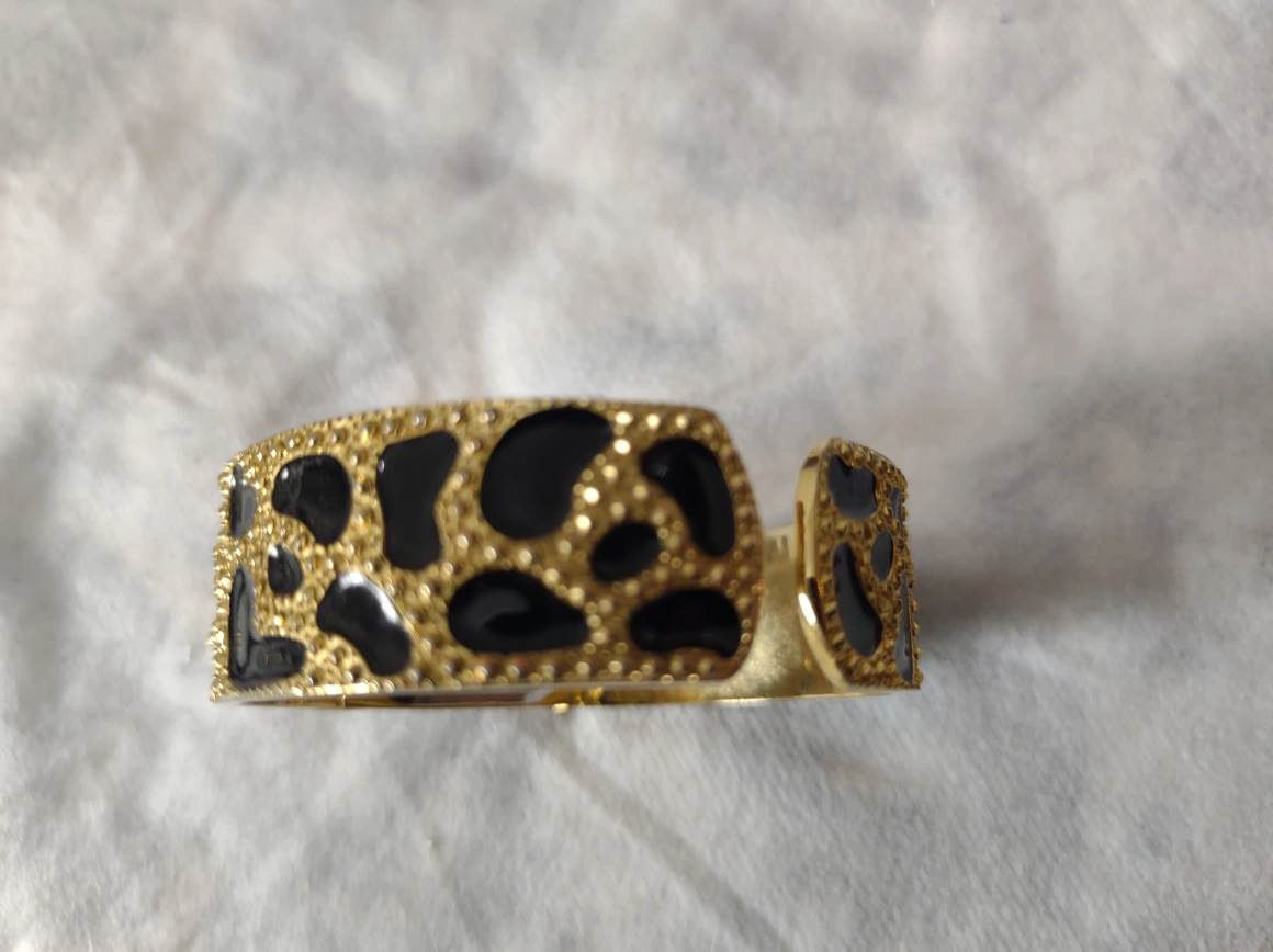 44Gold tone bangle watch with black and white leopard print face and band. The band is decorated with clear rhinestones.
