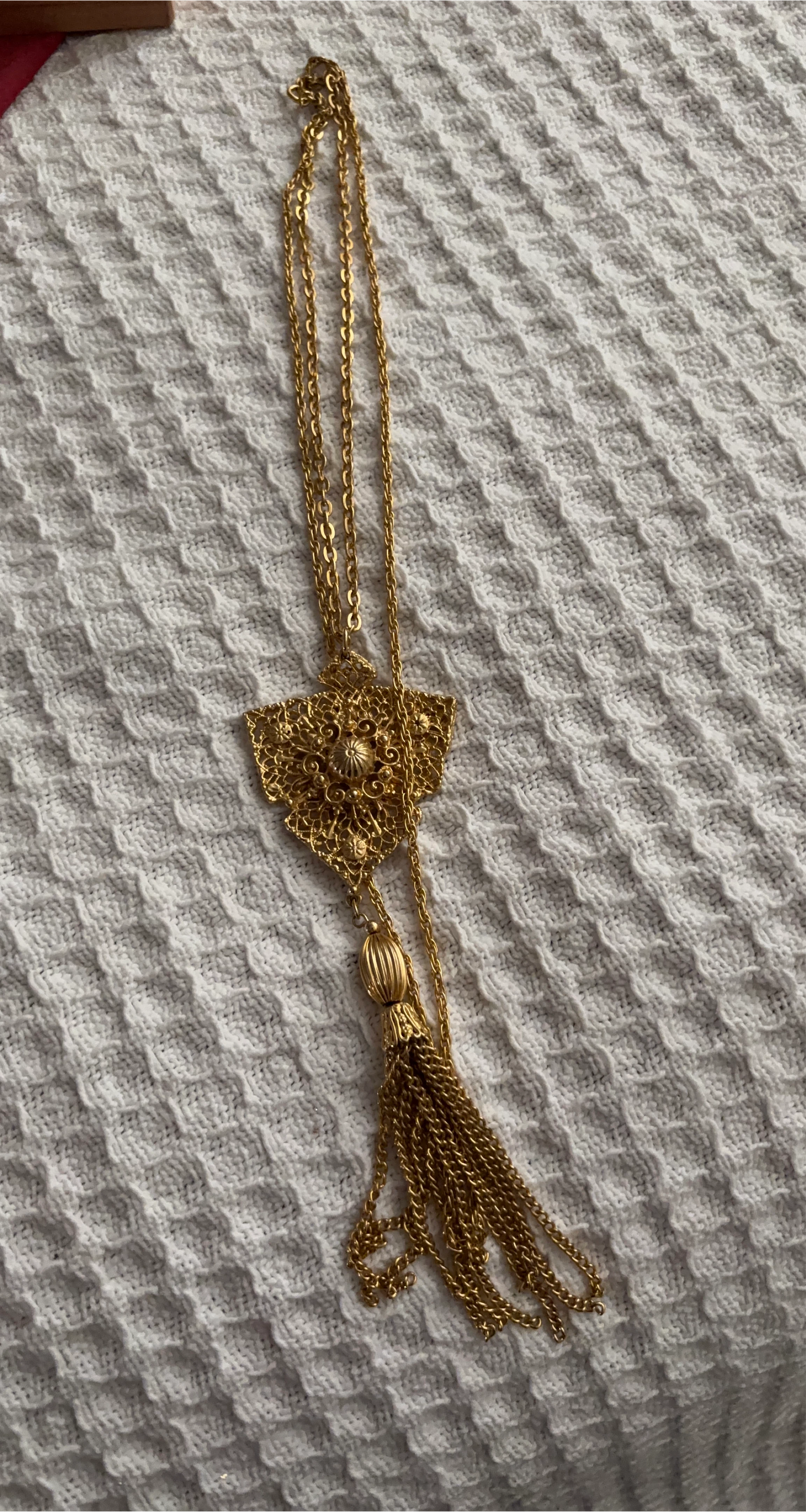 15This is a gold-tone necklace with a tassel pendant. It's in great condition and ready to add a touch of elegance to your outfit!