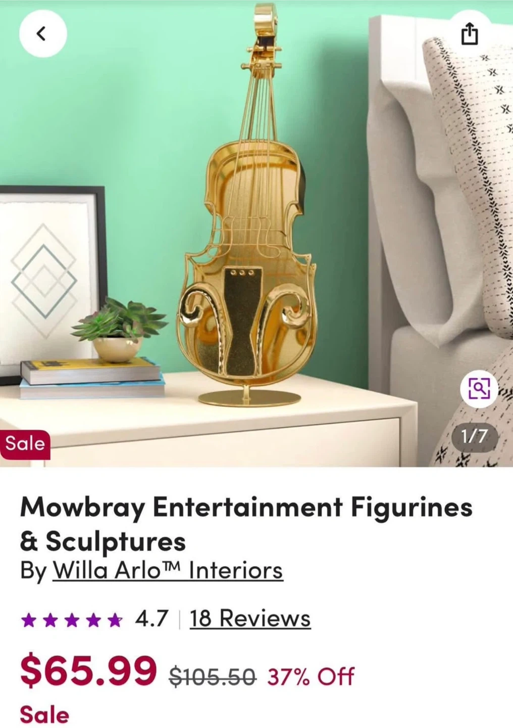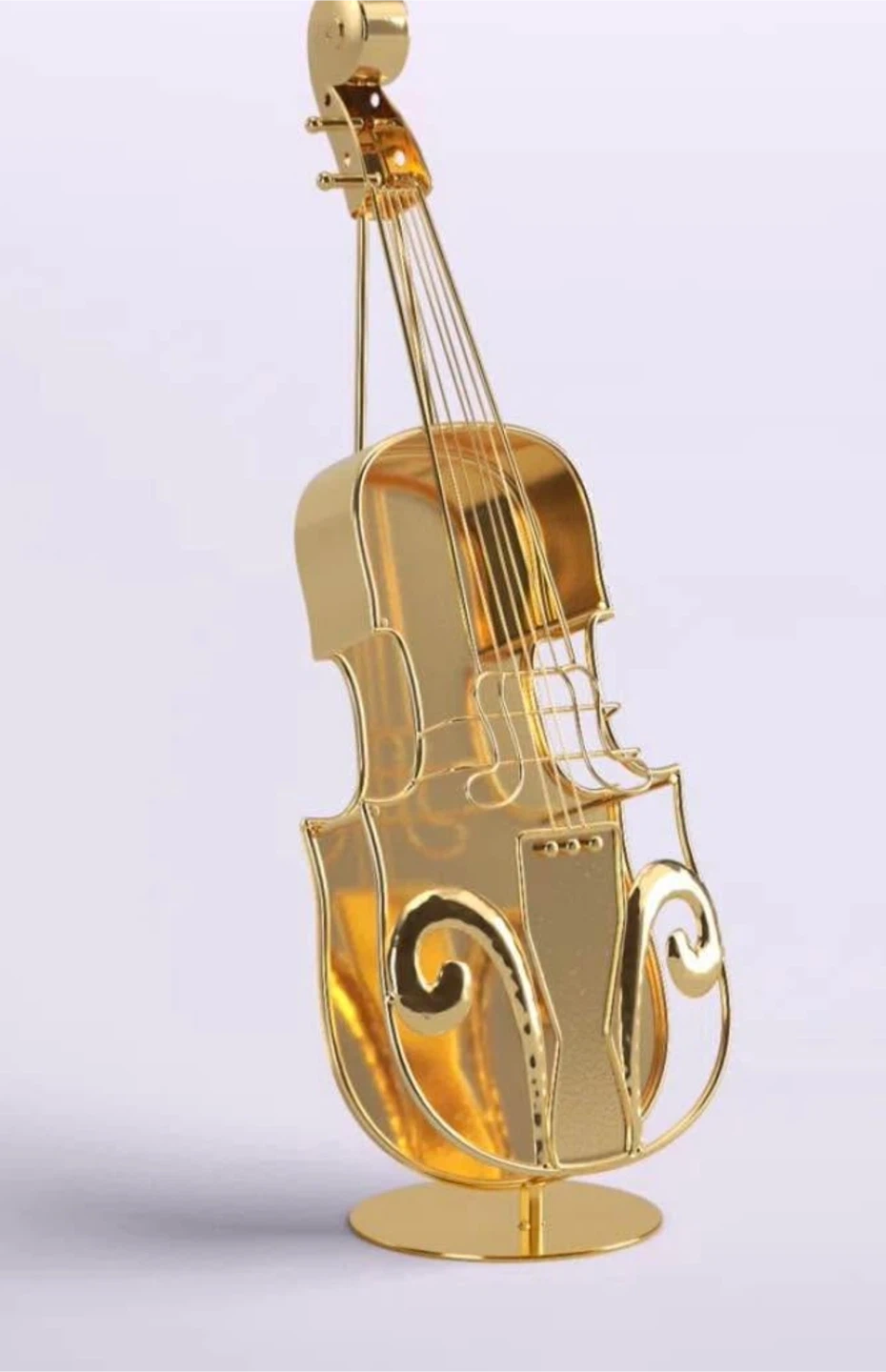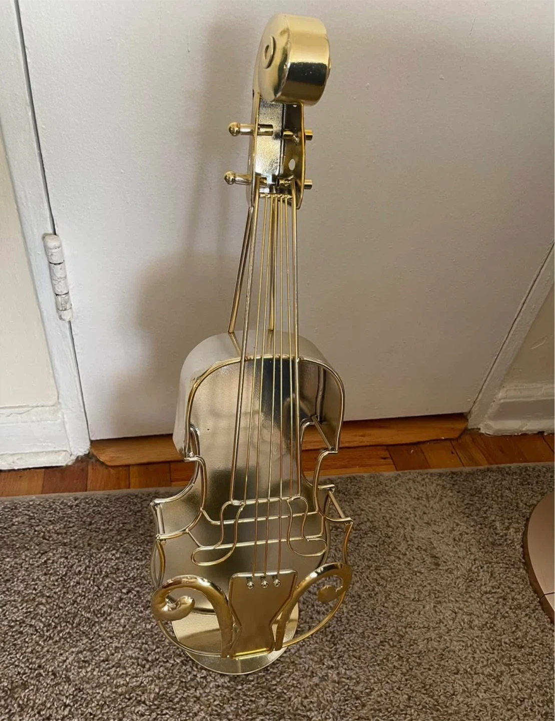 70Musical magnificence! This decorative violin sculpture is crafted from iron and features a simplified violin shape with thin metal strings and scrolling accents in a luminous metallic finish. It rests on a circular pedestal base and measures 23" high. It's designed with a lightweight feel, weighing nearly 3 lbs. Originally bought for $65.99