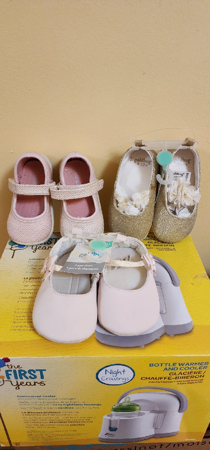 I have a few pairs of baby shoes for sale! One pair is gold glittery with flowers, and two pairs are pink. 2 are size 9-12 months and come with tags. 2 new 1 like new