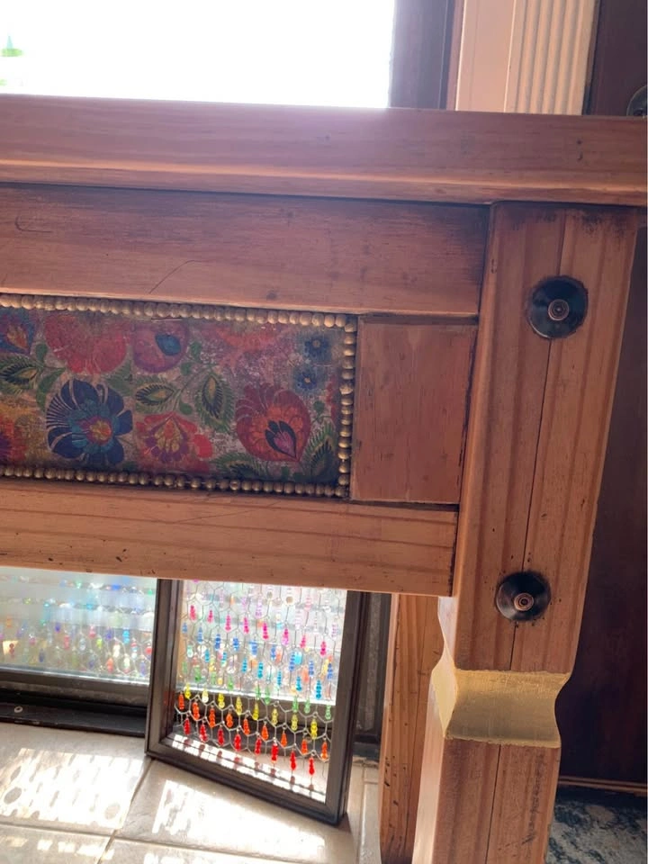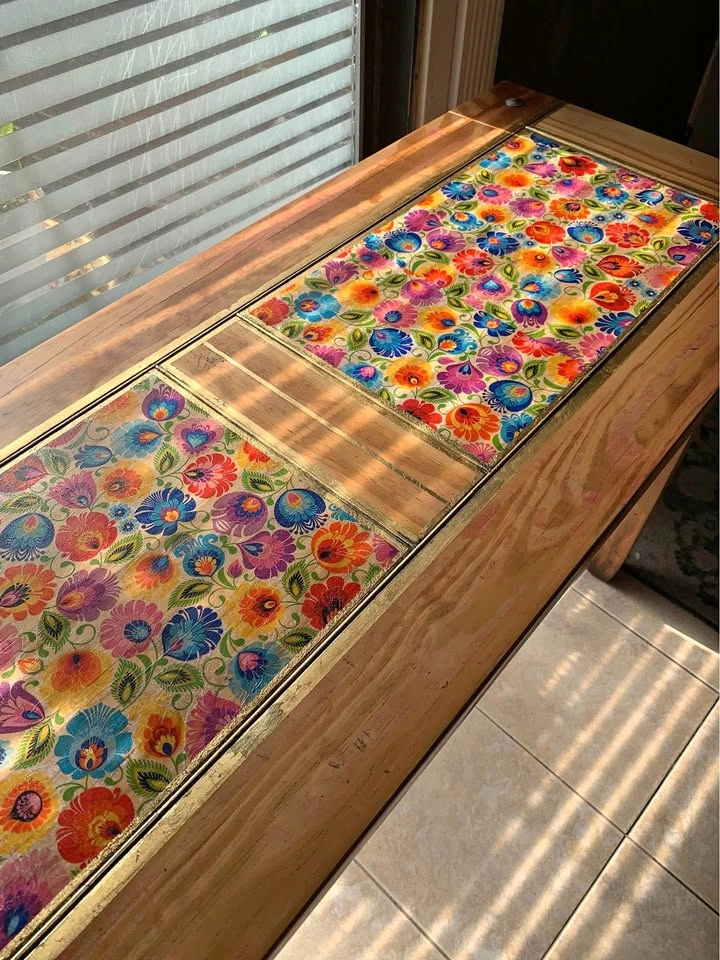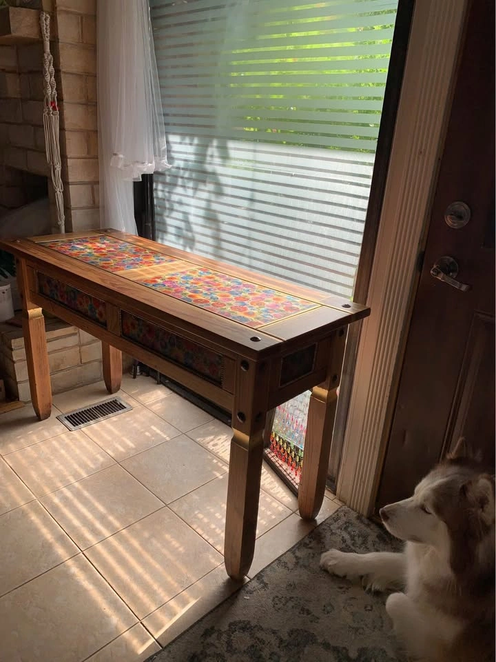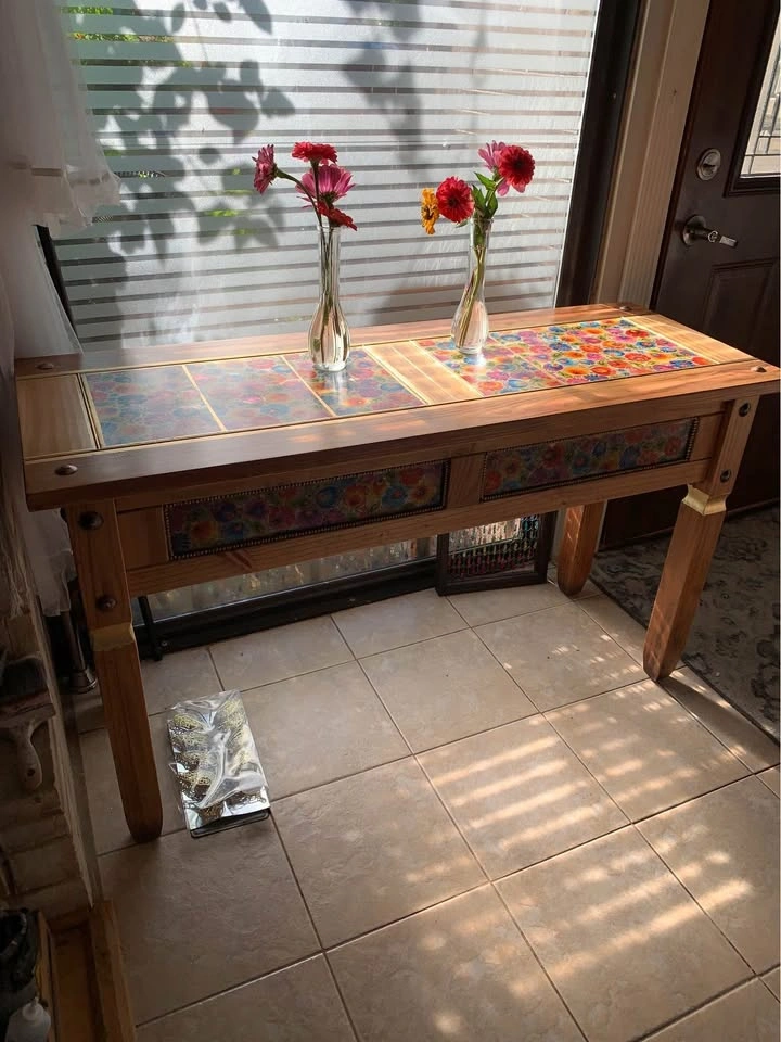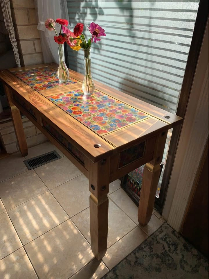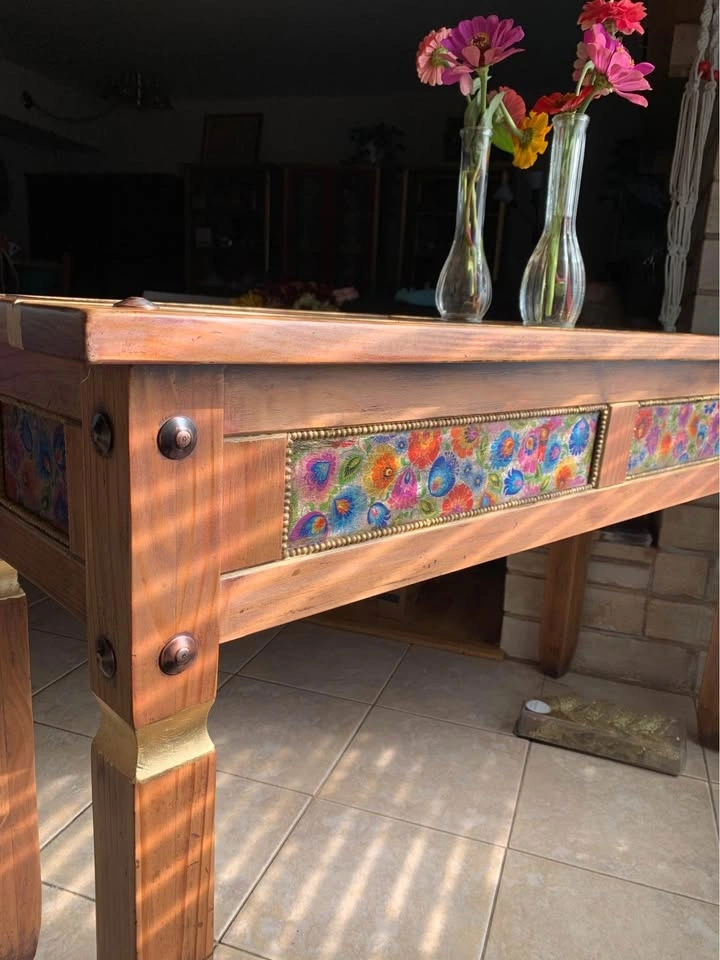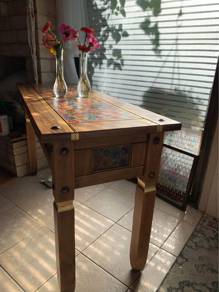 10A one-of-a-kind console table blending natural wood with vibrant folk florals and gold accents. Hand-crafted and finished under sunlight — a piece that feels alive with warmth and tradition. 50”L x 19”W x 29”H. Price is firm. Cash and pick up only!