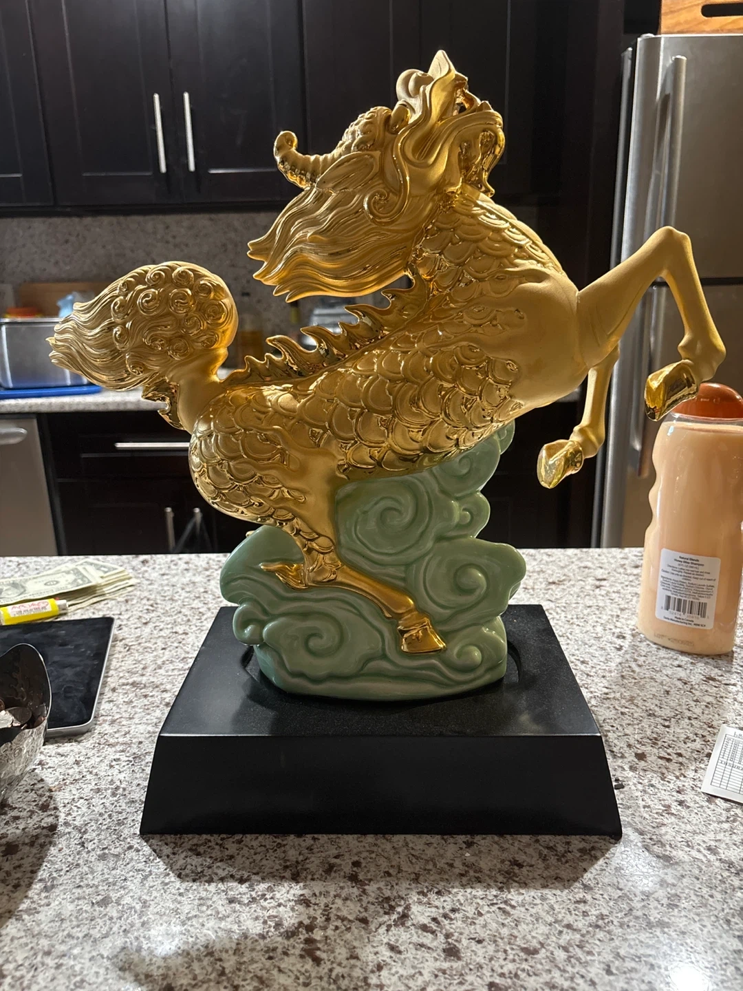 65Selling a golden dragon horse statue. It has a black base and a light green cloud.