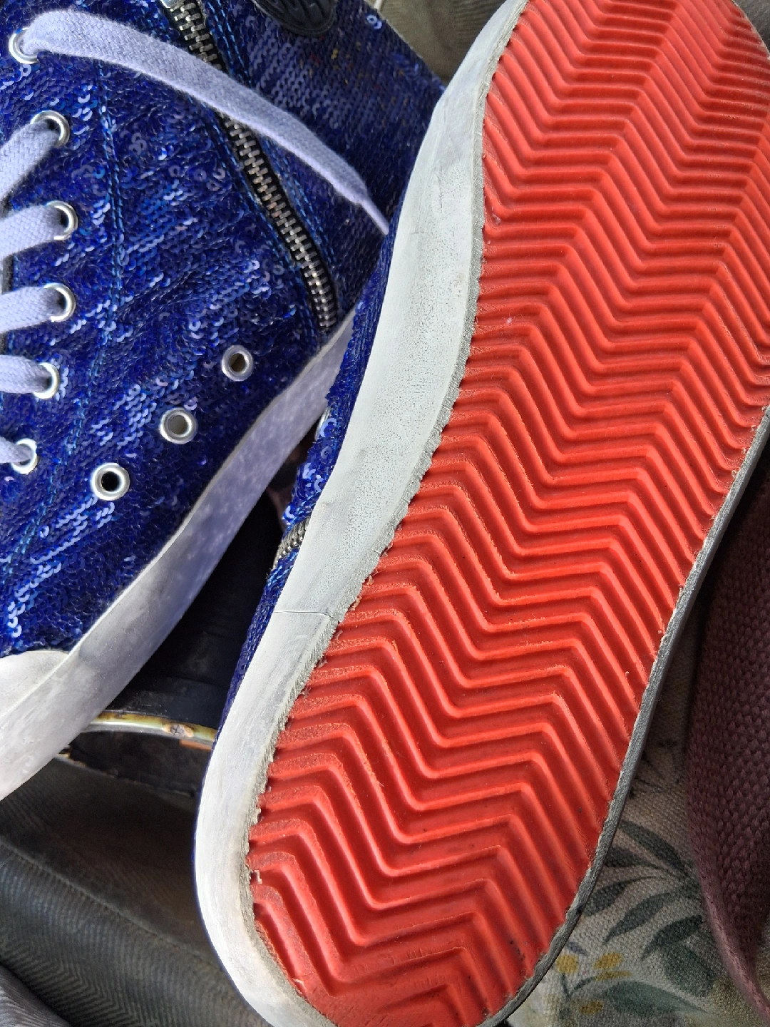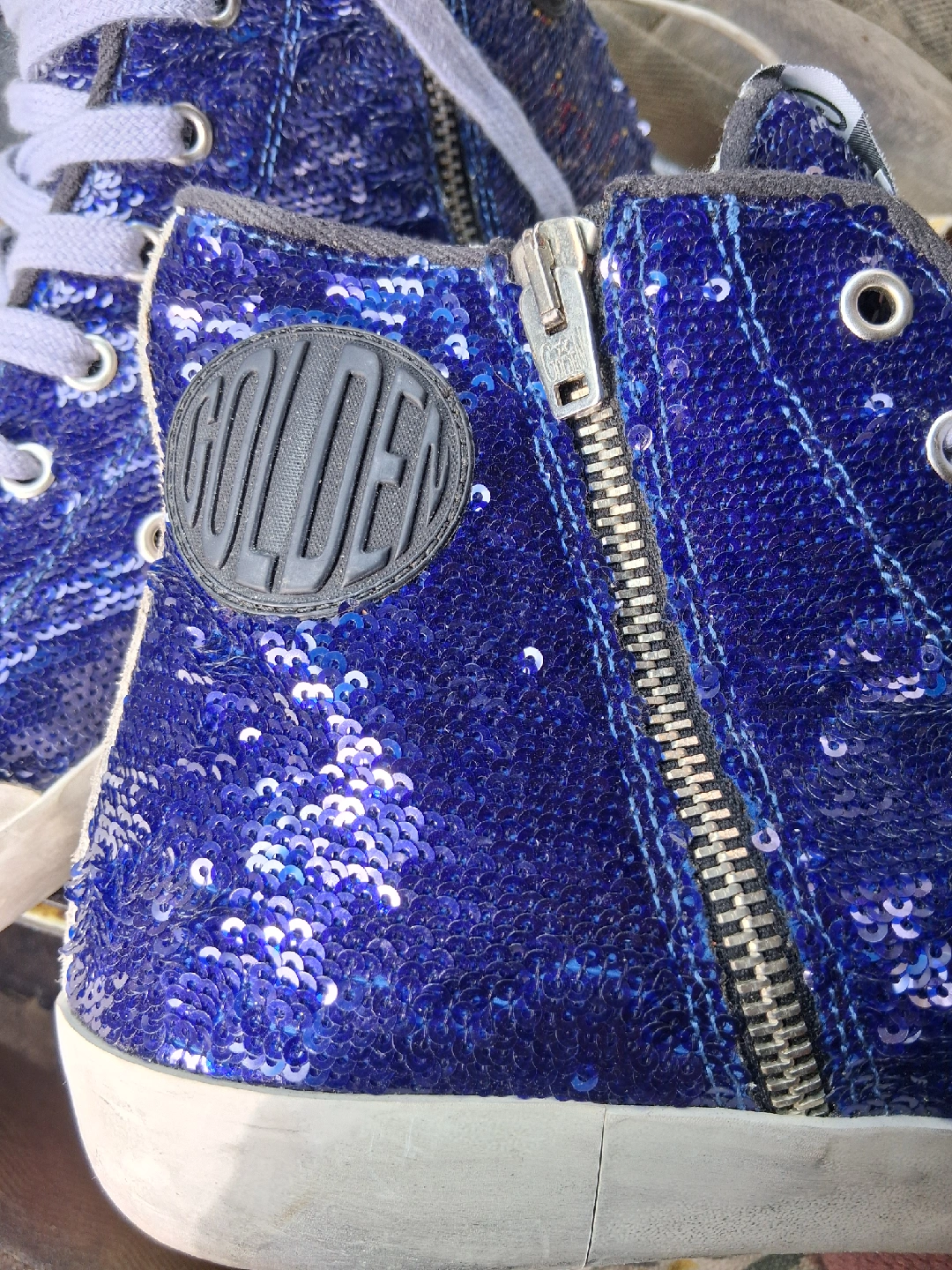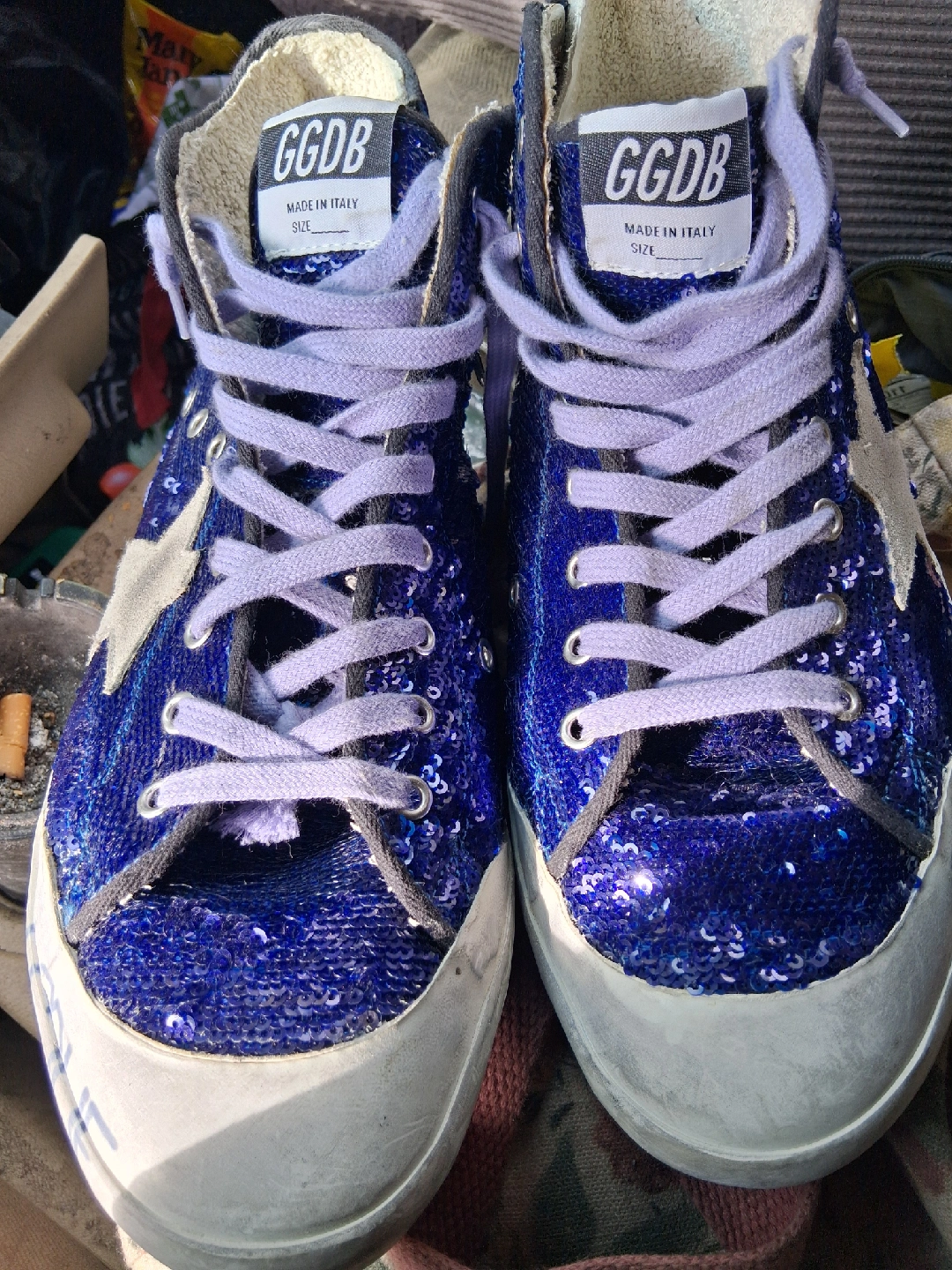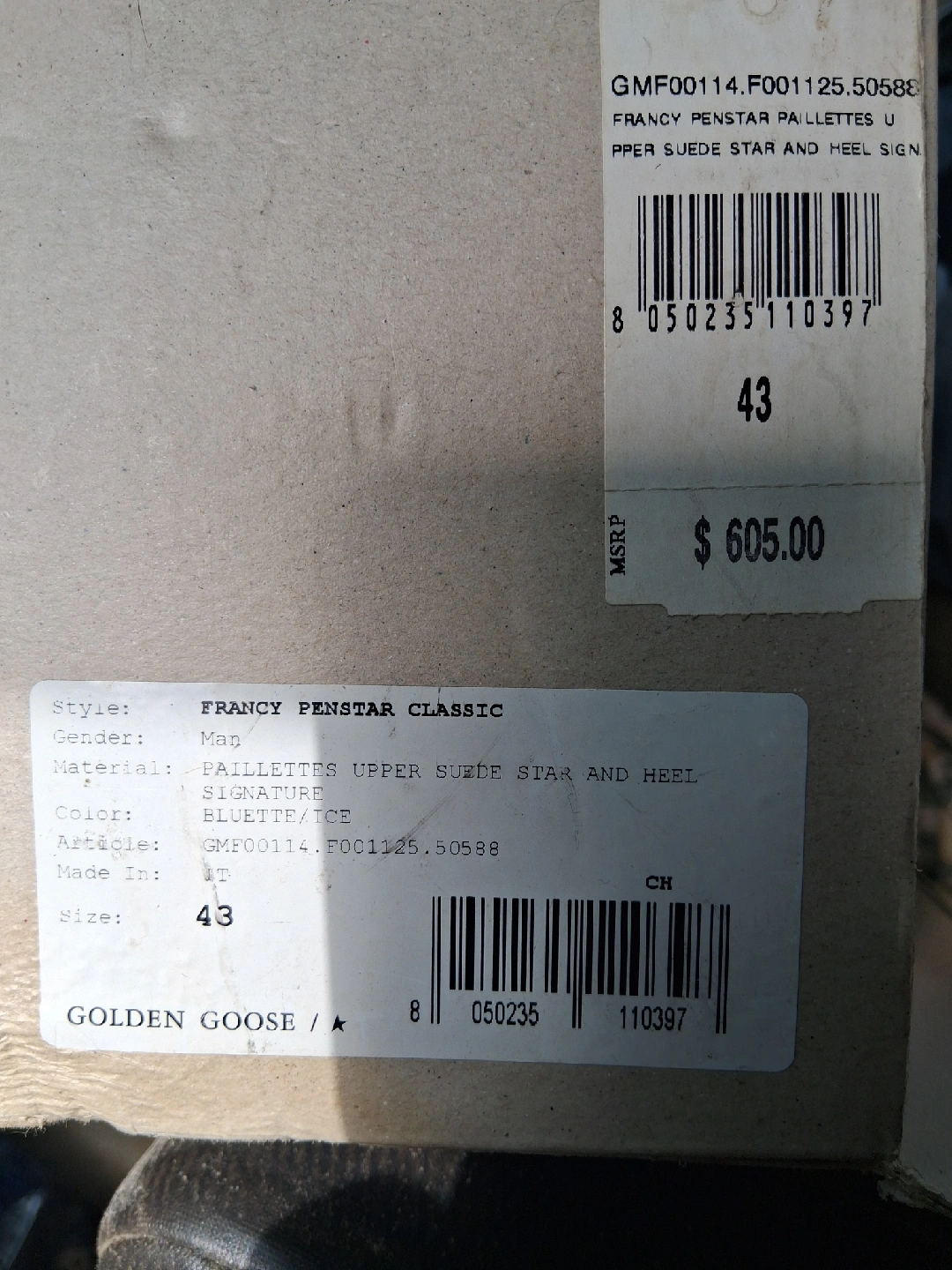 10Selling a pair of Golden Goose Francy Penstar Classic sneakers! These are a men's size 43, which translates to a US size 10. They feature a blue sequin upper with a suede star and heel. The original price was $605.00!