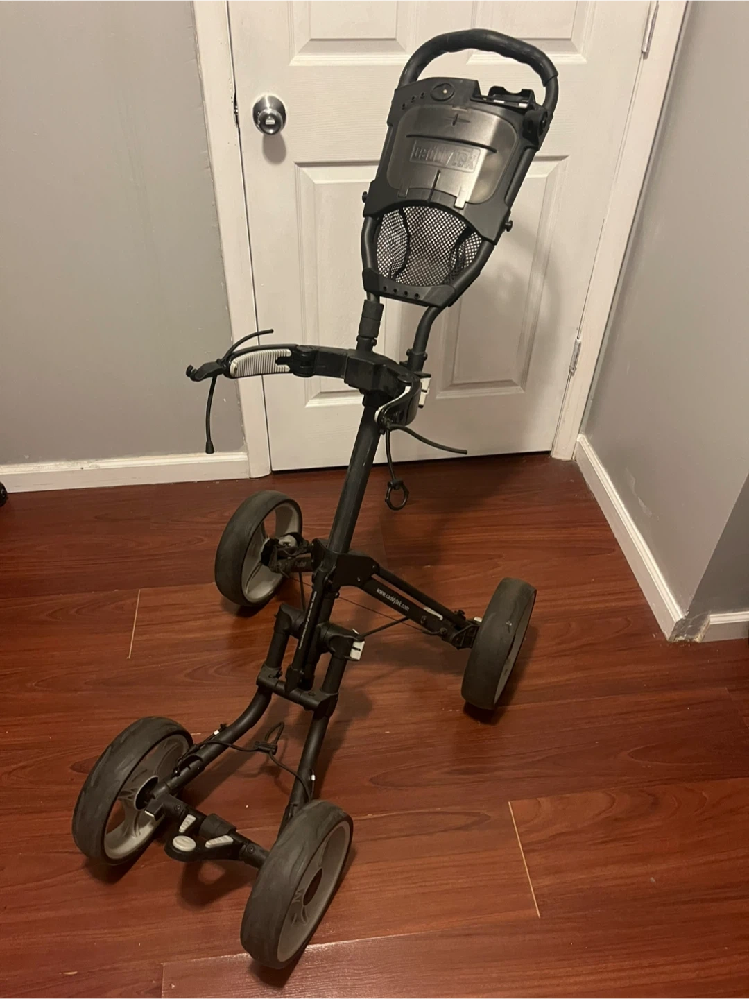 Collapsible golf bag push cart. Used but in good condition, works great.