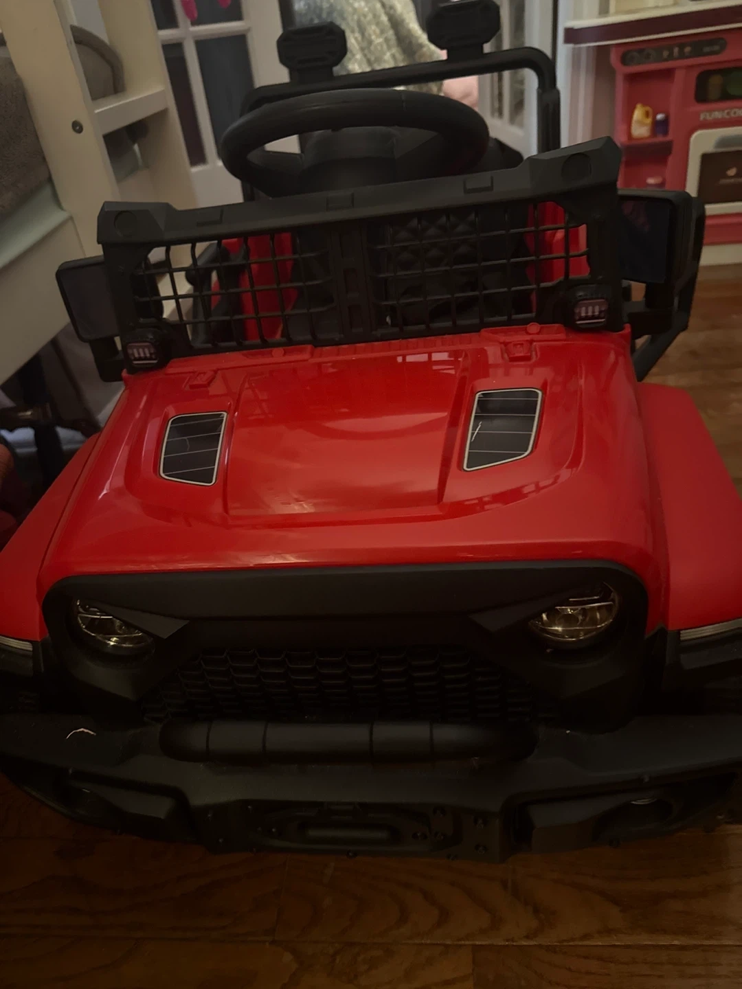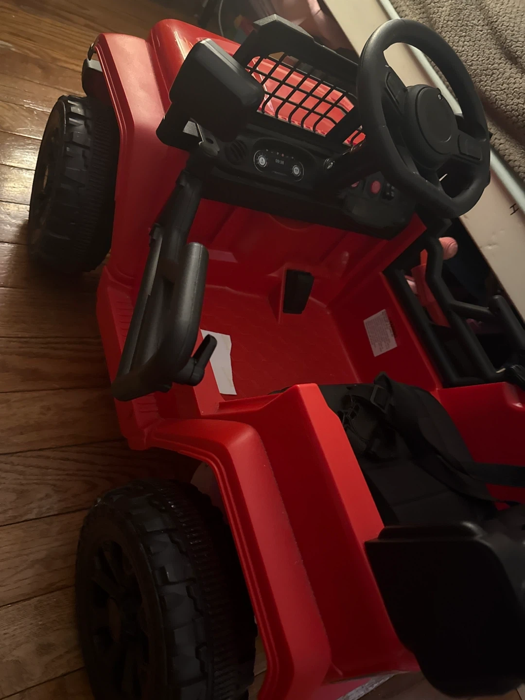 This is a red ride-on jeep for kids. It features a steering wheel and seat belt for safety. This toy car is suitable for outdoor play.