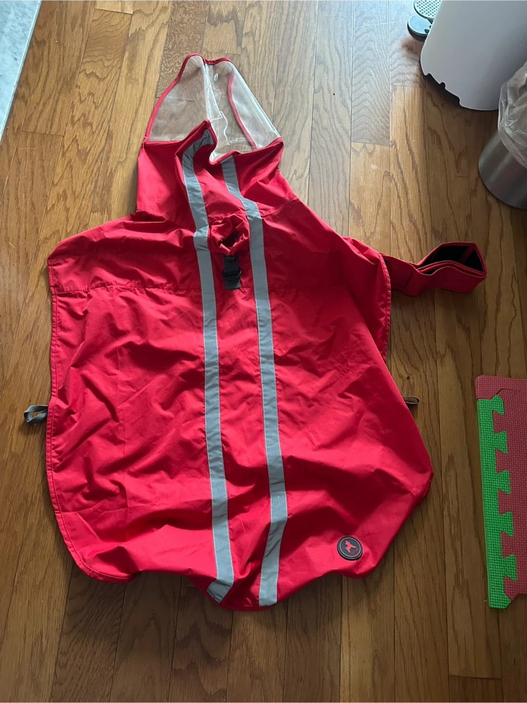 Red dog raincoat with reflective stripes, perfect for keeping your furry friend dry on walks! Great condition and ready for a new home. Originally paid over $70