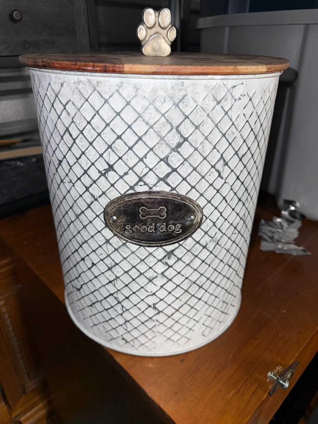 This is a cute "Good Dog" food storage container. It features a white, textured exterior with a wooden lid and a paw print handle. It's perfect for keeping your furry friend's food fresh and organized