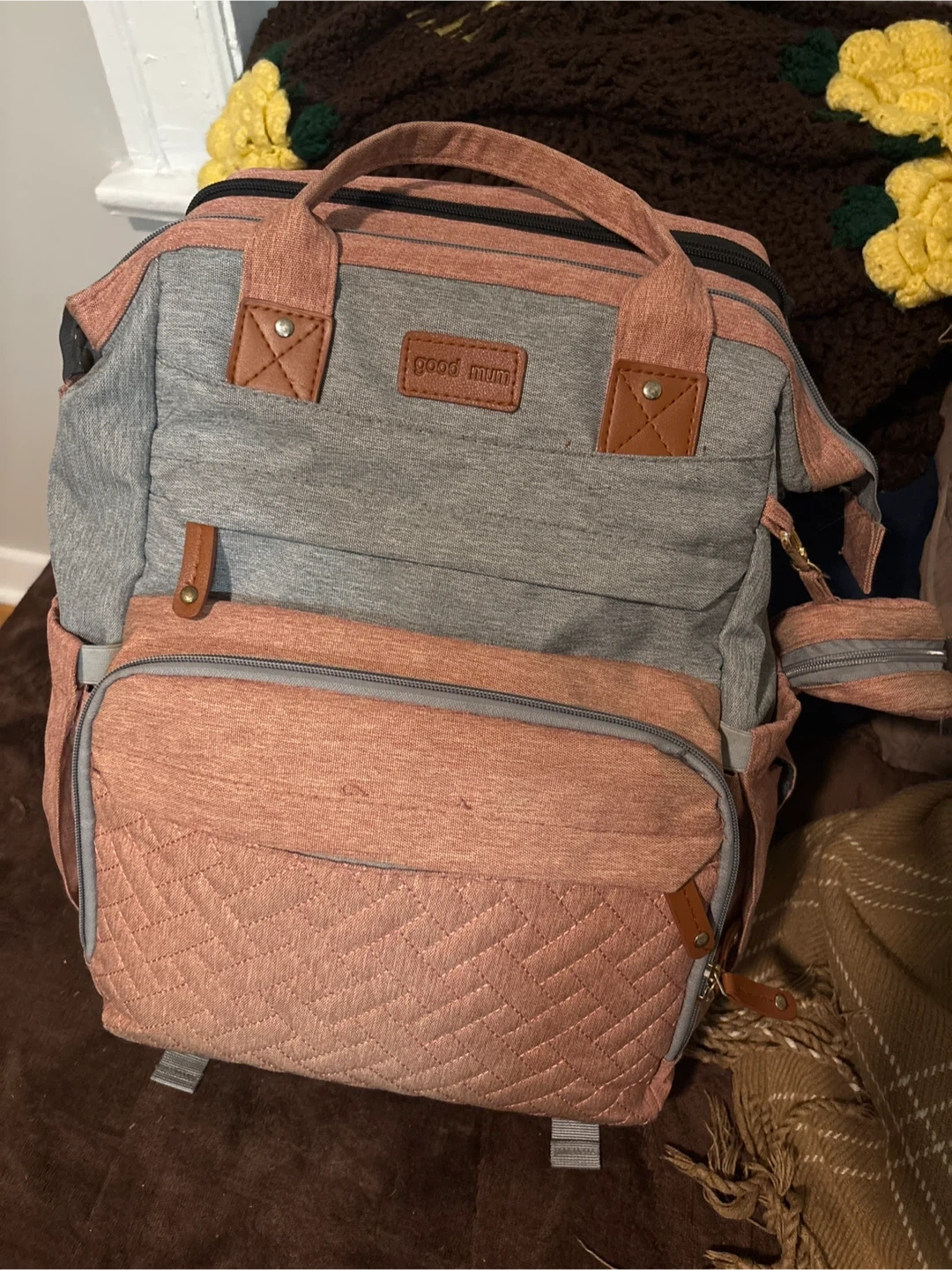20Selling a Good Mum diaper bag backpack! It features a stylish design with a gray and pink color scheme. Perfect for keeping all your baby essentials organized and easily accessible while you're on the go! Turns into a portable crib for naps or changing!