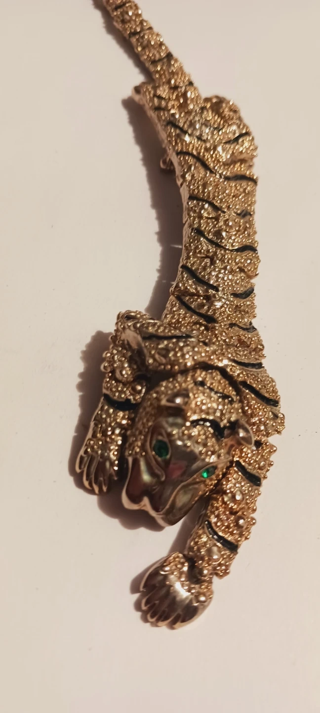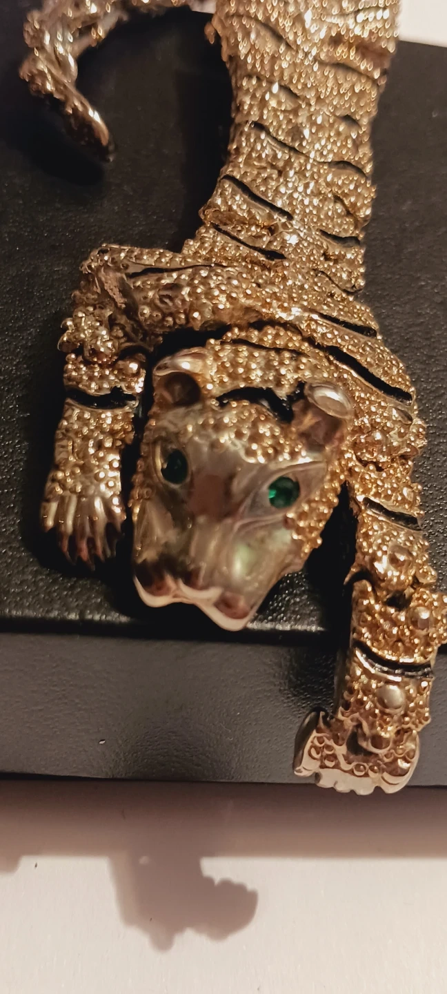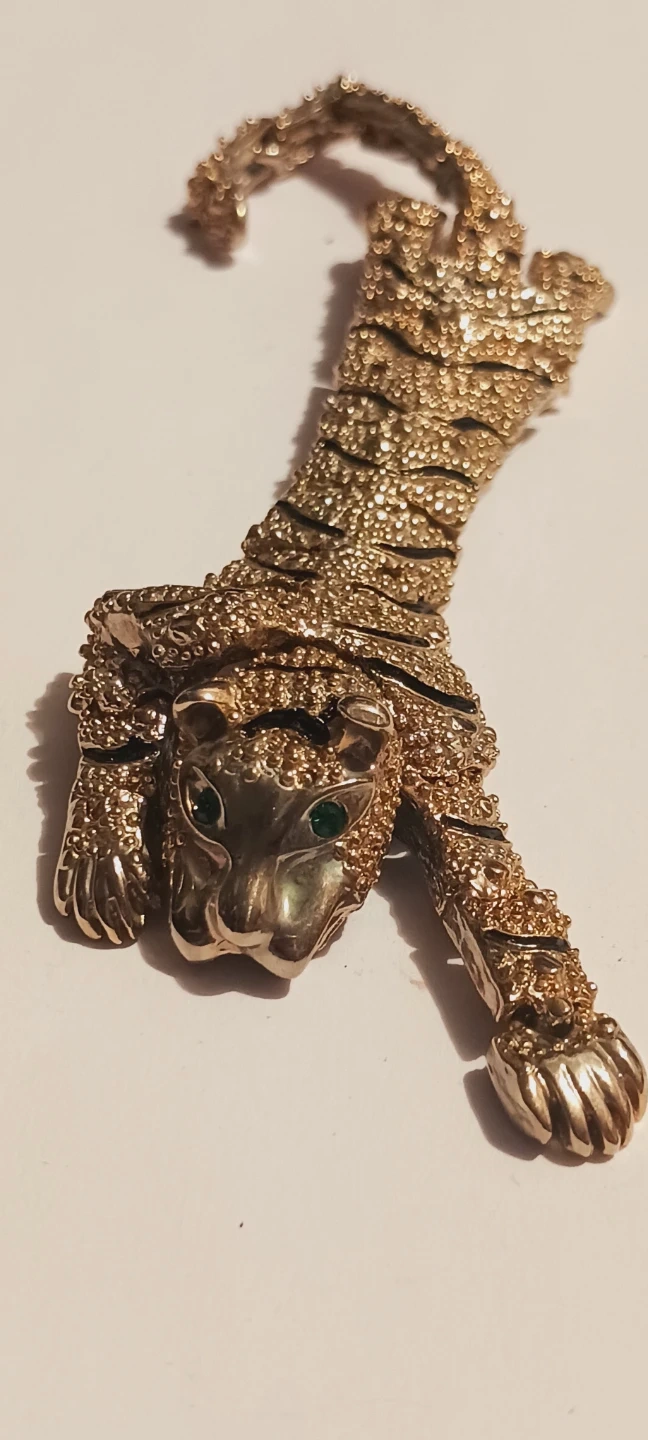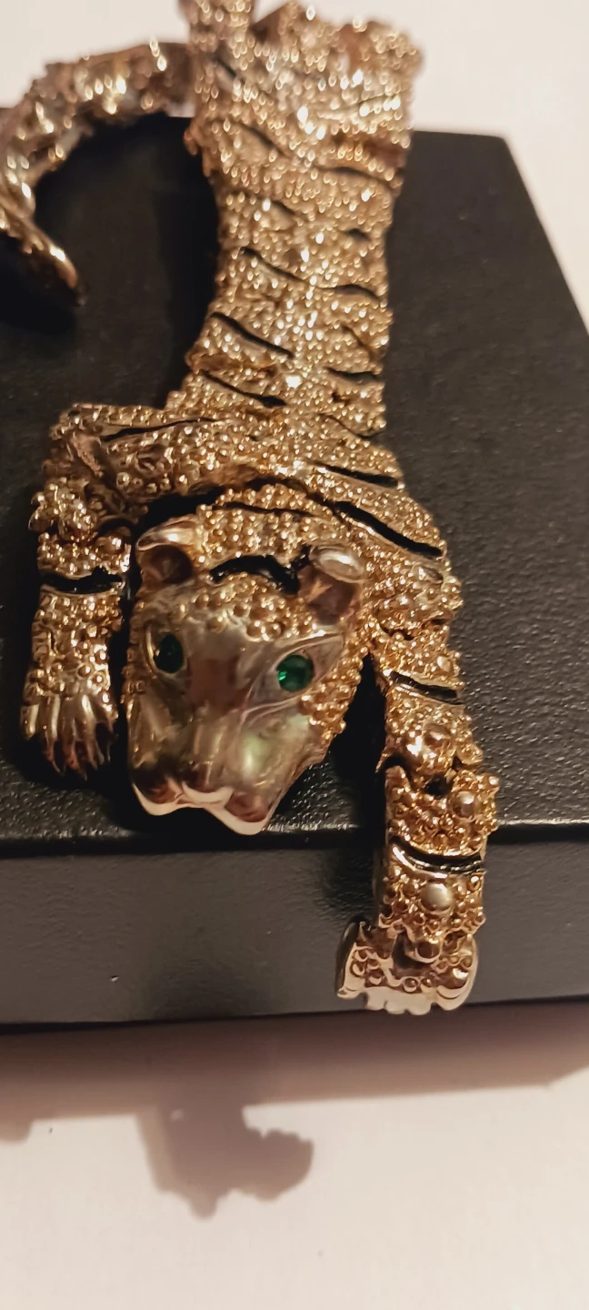 1000+ABSOLUTELY GORGEOUS LARGE VINTAGE ARTICULATED GREEN EYED STONES GOLD PLATED TIGER SHOULDER BROOCH. It has green eyes and black stripes. Great for jewelry collectors and for those who want to add a touch of WILDE style to your wardrobe !!!Excellent condition. 7.5"×2". ALL MY PRICES ARE NEGOTIABLE !!!