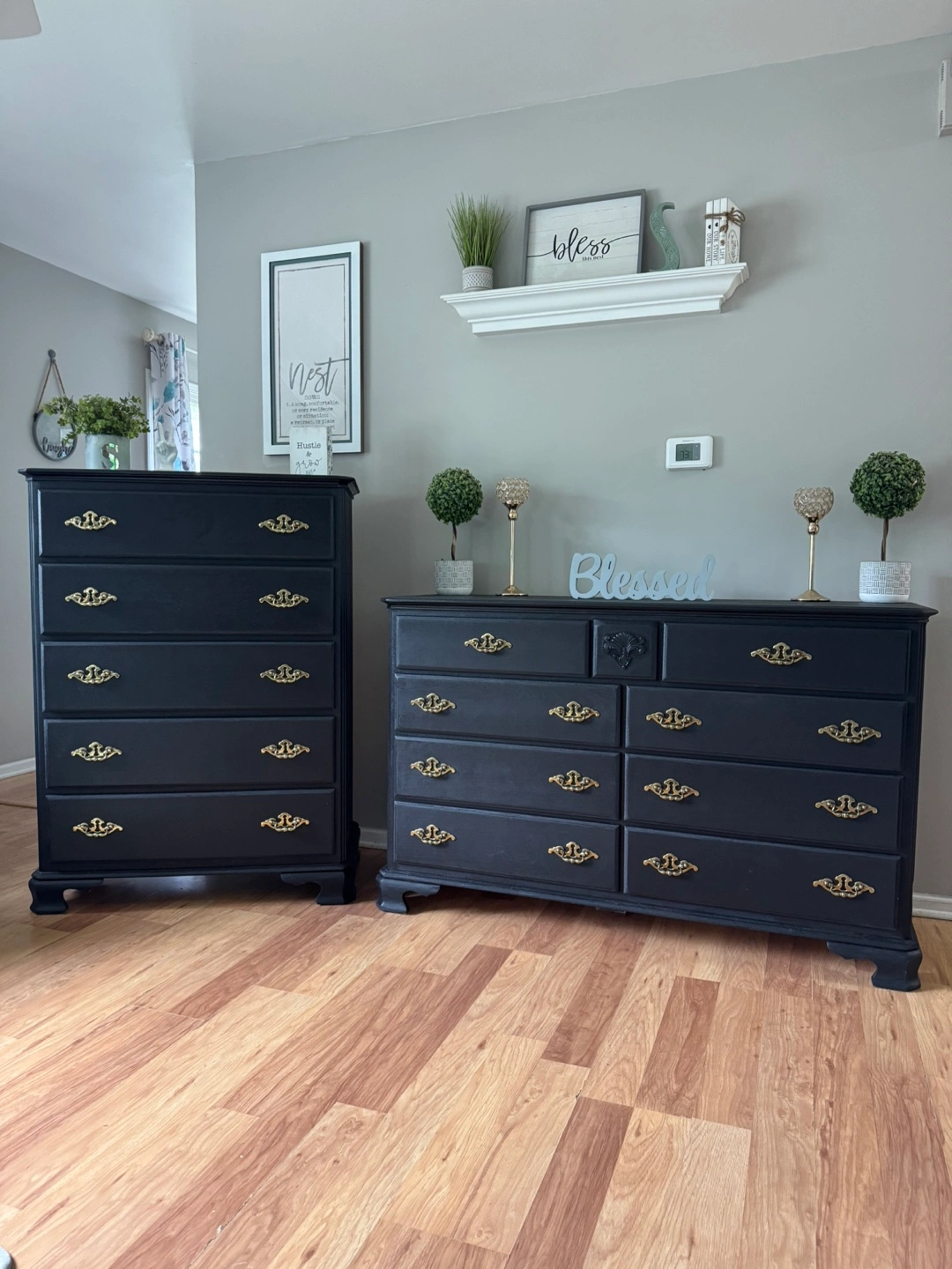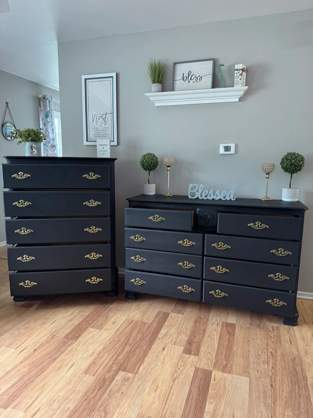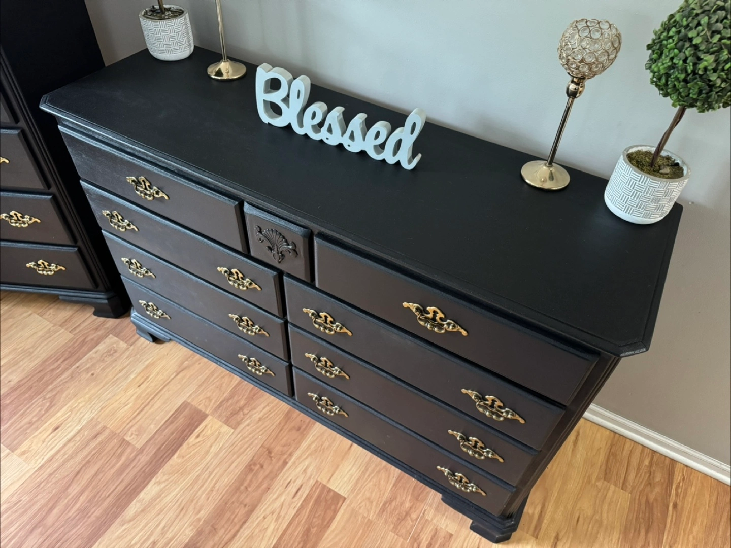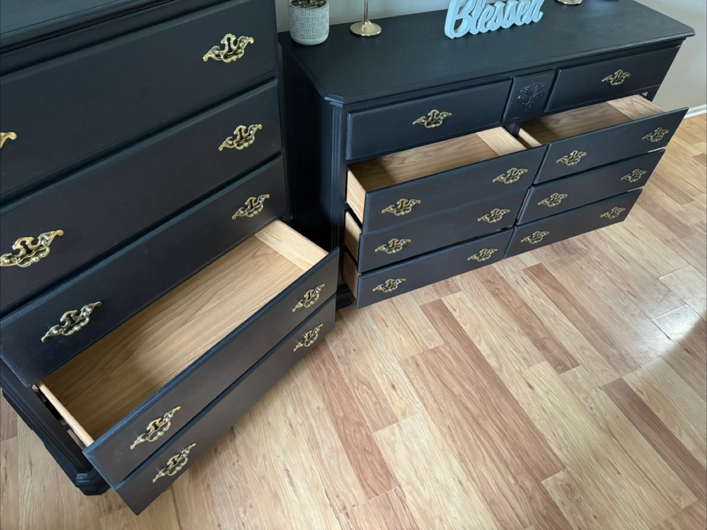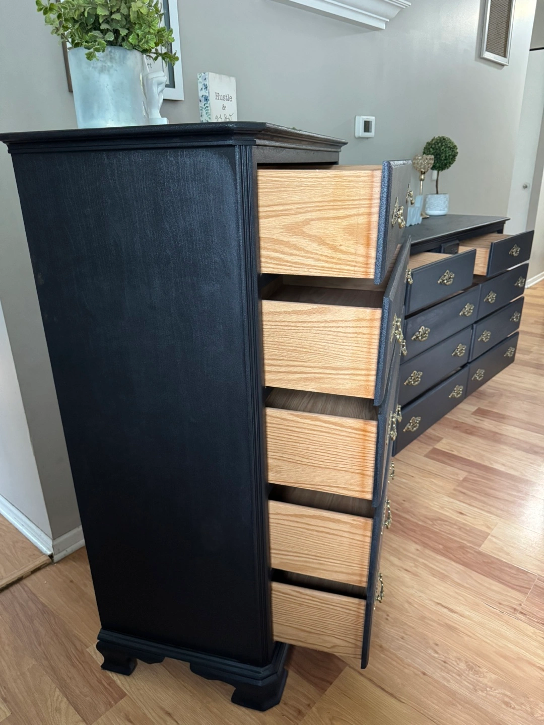 137Press “See more” to read full description‼️ ✨Gorgeous stunning✨ black solid refinished dresser set/ gold hardware, Made in Dublin, all 13 drawers pull out fine on tracks, solid pieces, 💪🏼, Clean & sturdy! This is NOT that cheap wayfair/Ikea furniture, this will last you FOREVERR, I sell good quality furniture & my prices are still better/cheaper than a furniture store. Please don’t ask to lower my price‼️MANY REQUESTS ON SETS, HERE IT IS 😘 Long dresser Measurements; $400 35 inches tall 56 inches wide 18 inches deep Tall dresser Measurements; $250 49 inches tall 36 inches wide 18 inches deep FAST & EASY DRIVEWAY PICKUP IN LOCKPORT✅ BRING HELP IF YOU HAVE IT💪🏼OR WE CAN ASSIST HELP AFTER 4P.M MON-FRI‼️DELIVERY AVAILABLE🚚, $100 DEPOSIT REQUIRED‼️ CASH ONLY‼️ BRING EXACT CHANGE PLEASE‼️$50 DEPOSIT WITH ZELLE & ITS COMPLETELY YOURS‼️ (DECOR NOT INCLUDED)‼️ CHECKOUT MY OTHER LISTINGS 😁 ✨Feel free to follow me for more upcoming furniture & I definitely appreciate you for following me! 🤝✨