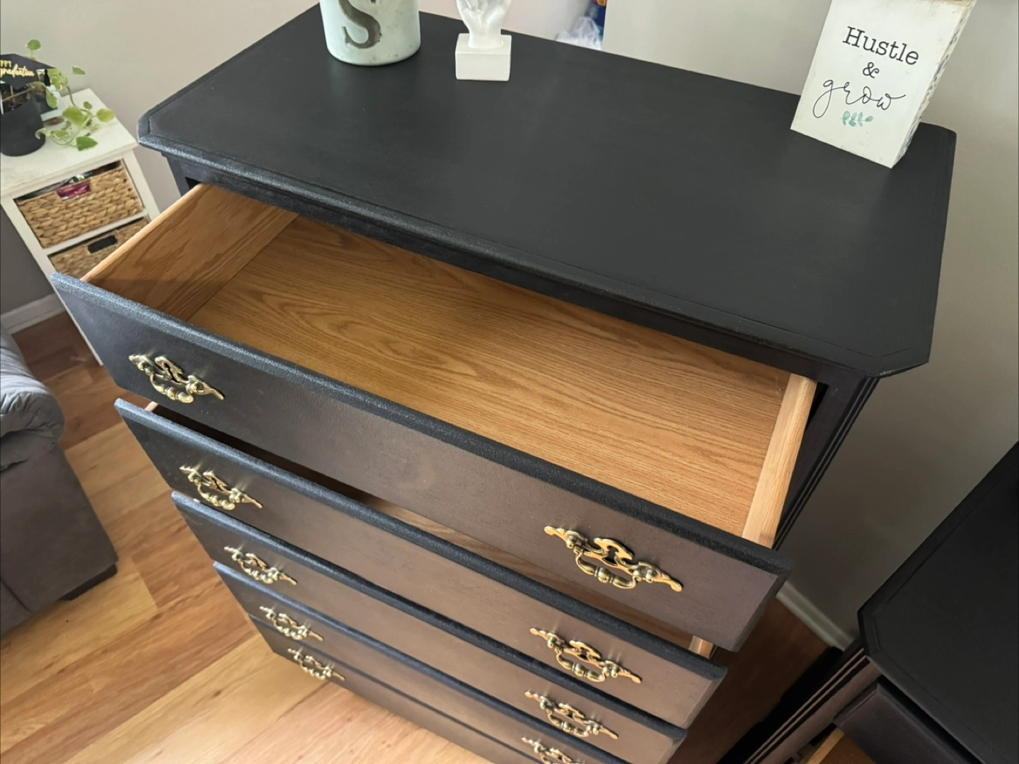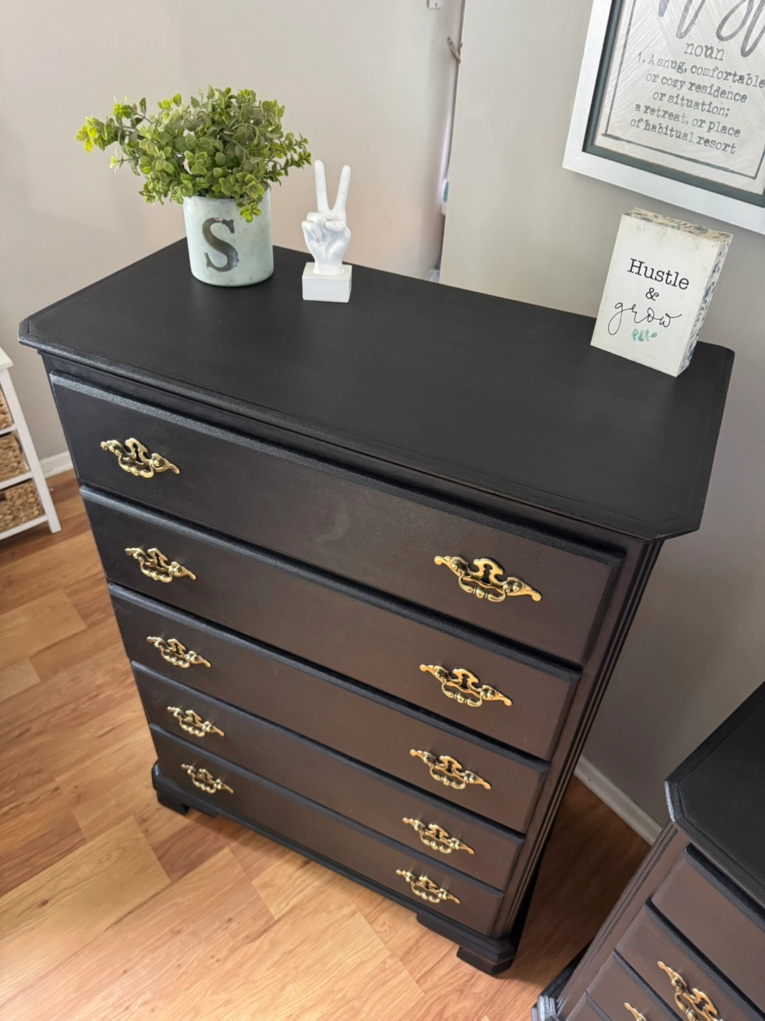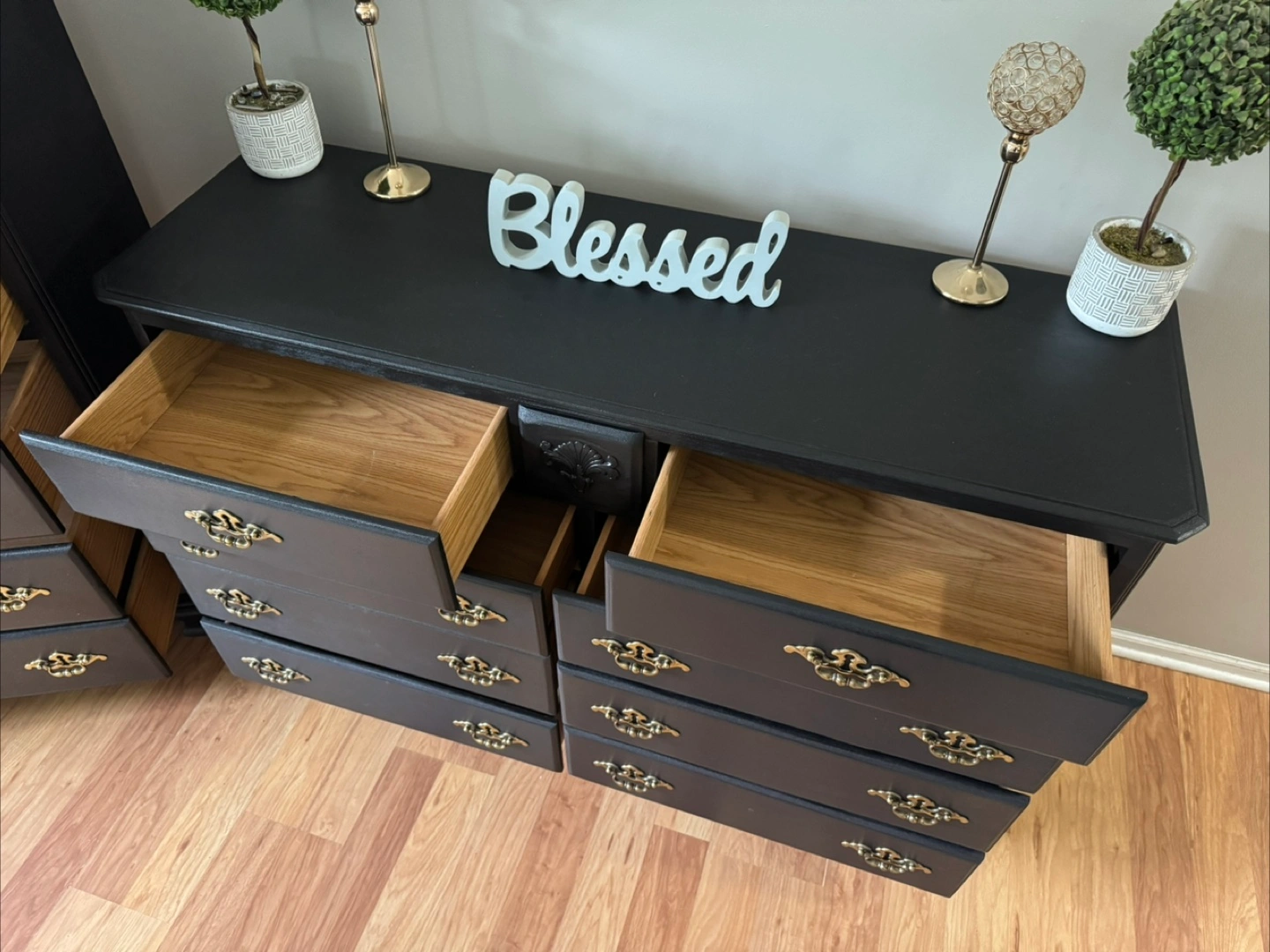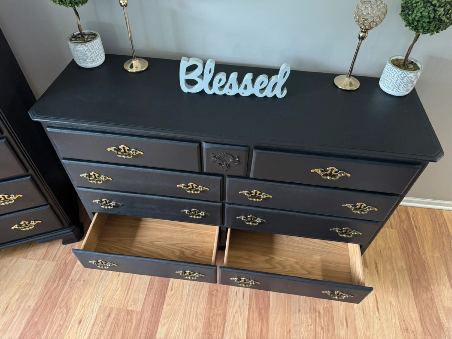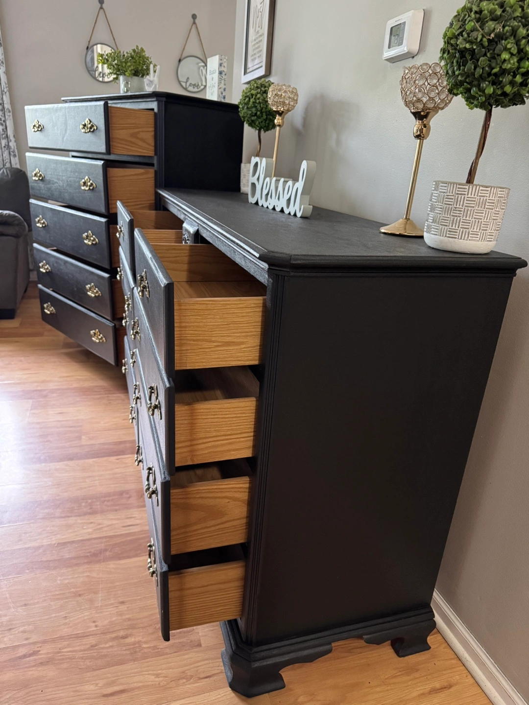 137Press “See more” to read full description‼️ ✨Gorgeous stunning✨ black solid refinished dresser set/ gold hardware, Made in Dublin, all 13 drawers pull out fine on tracks, solid pieces, 💪🏼, Clean & sturdy! This is NOT that cheap wayfair/Ikea furniture, this will last you FOREVERR, I sell good quality furniture & my prices are still better/cheaper than a furniture store. Please don’t ask to lower my price‼️MANY REQUESTS ON SETS, HERE IT IS 😘 Long dresser Measurements; $400 35 inches tall 56 inches wide 18 inches deep Tall dresser Measurements; $250 49 inches tall 36 inches wide 18 inches deep FAST & EASY DRIVEWAY PICKUP IN LOCKPORT✅ BRING HELP IF YOU HAVE IT💪🏼OR WE CAN ASSIST HELP AFTER 4P.M MON-FRI‼️DELIVERY AVAILABLE🚚, $100 DEPOSIT REQUIRED‼️ CASH ONLY‼️ BRING EXACT CHANGE PLEASE‼️$50 DEPOSIT WITH ZELLE & ITS COMPLETELY YOURS‼️ (DECOR NOT INCLUDED)‼️ CHECKOUT MY OTHER LISTINGS 😁 ✨Feel free to follow me for more upcoming furniture & I definitely appreciate you for following me! 🤝✨