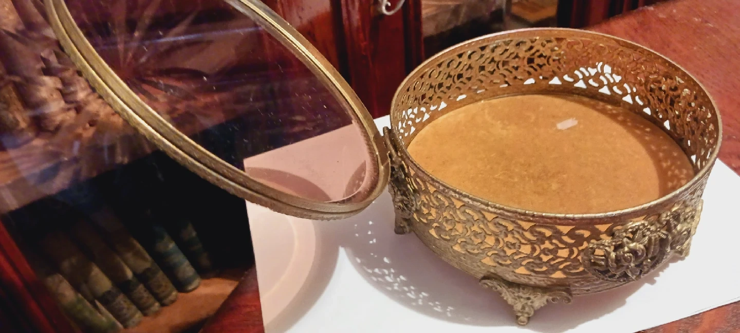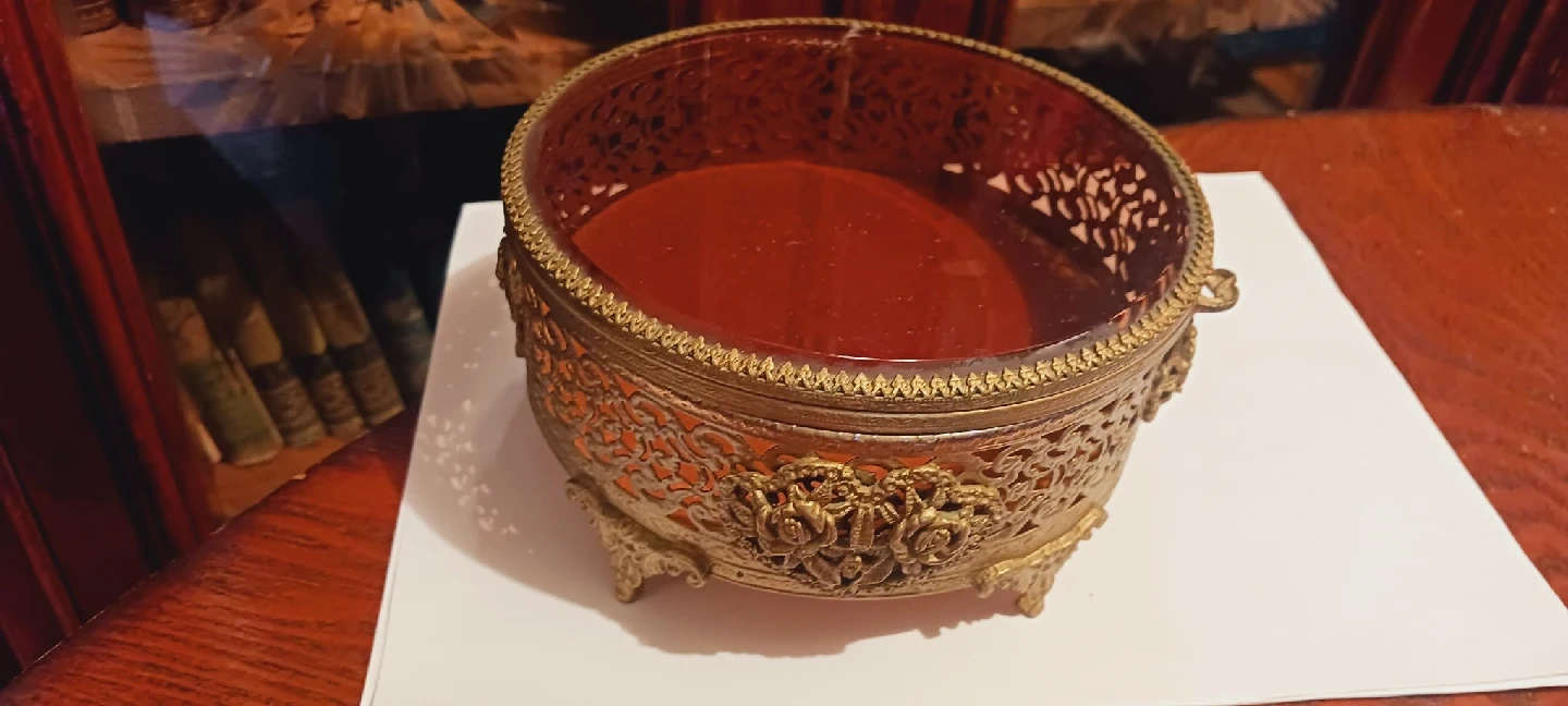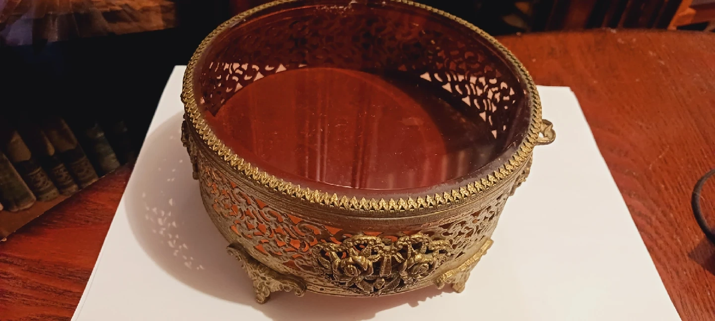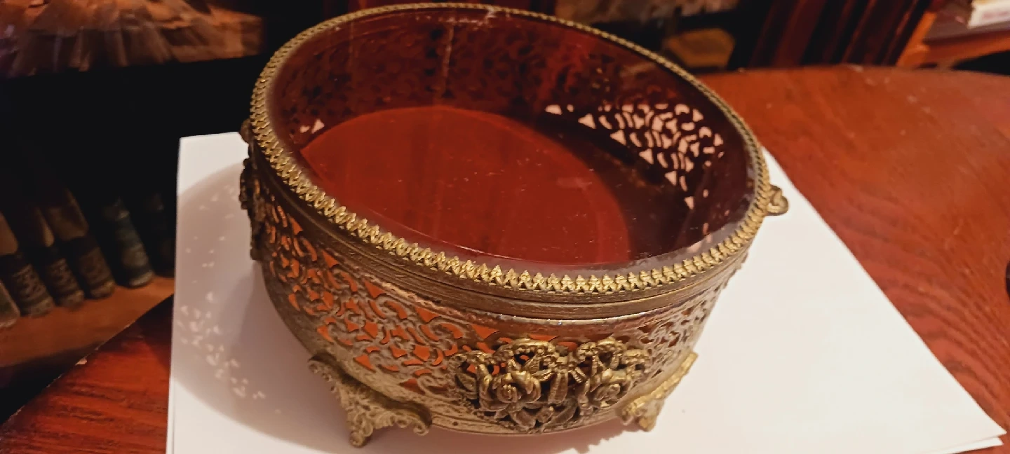 1000+Gorgeous Vintage Gold Gilt Filigree Large Vanity Keepsake/ Jewelry Box.It has a beautiful gold filigree design with rose accents and a amber glass insert on the lead.. It would be a lovely addition to any vanity or dresser! Excellent condition. 7" diameter. 3" tall. ALL MY PRICES ARE NEGOTIABLE !!