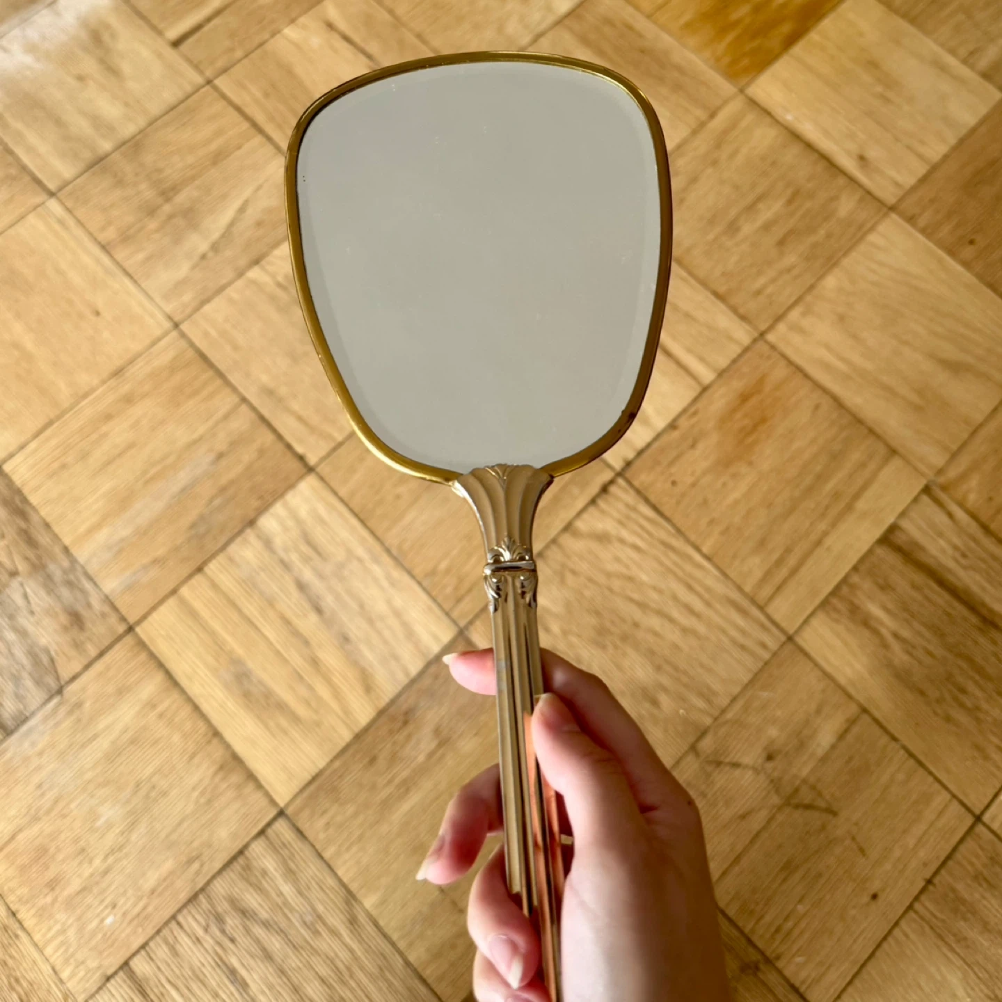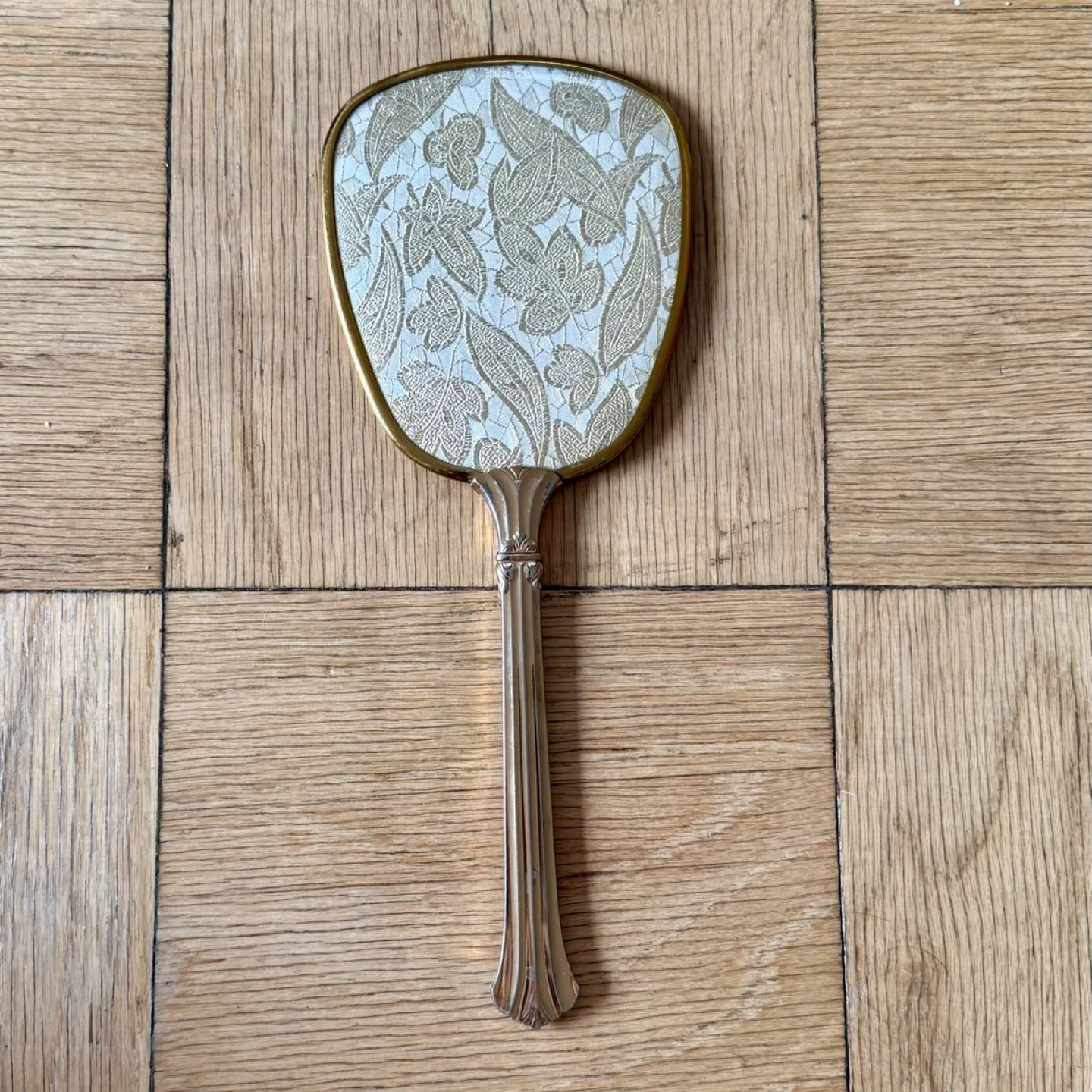 A beautiful vintage handheld mirror with golden embroidered detailing.