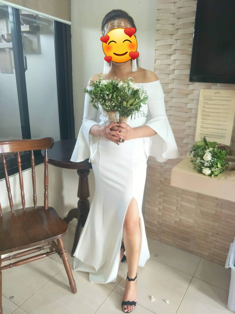 Flattering off-shoulder design for a chic, timeless look 3/4 sleeves that add elegance and comfort Lightweight, flowy fabric with a side slit for easy movement Ideal for maids of honor, bridesmaids, or formal occasions Classic white color that pairs beautifully with any wedding palette Worn only once