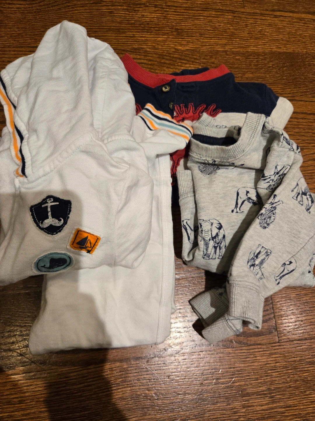 Three piece baby boy clothing bundle including a white hooded jacket with nautical patches, a navy long sleeve shirt with red trim, and a gray long sleeve shirt with an elephant print. Cotton material.