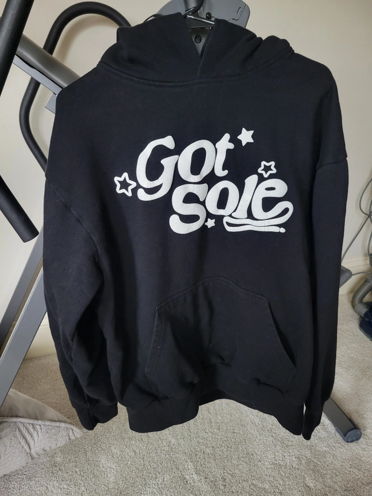 Black hoodie. Features a white graphic print. Kangaroo pocket. Long sleeves.