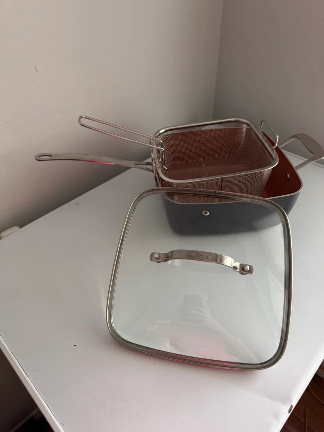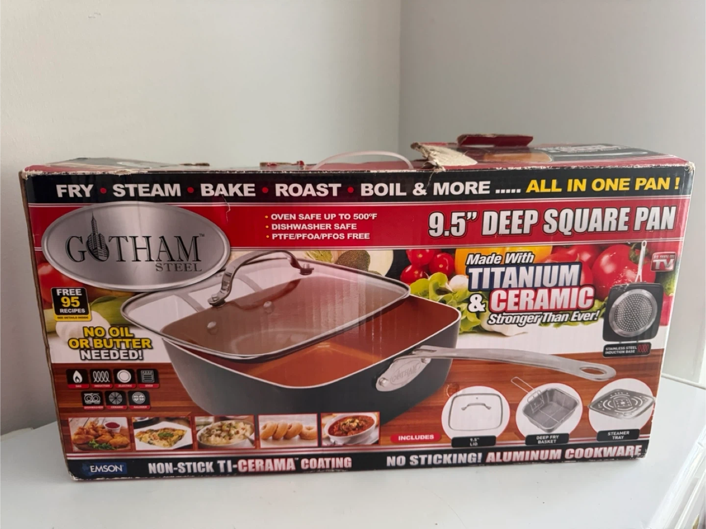 10Selling a Gotham Steel 9.5" Deep Square Pan! It's an all-in-one pan that can fry, steam, bake, roast, boil, and more. It's oven safe up to 500°F and dishwasher safe. The pan is made with titanium and ceramic, making it stronger than ever. It also includes a 9.5" lid and a deep fry basket.