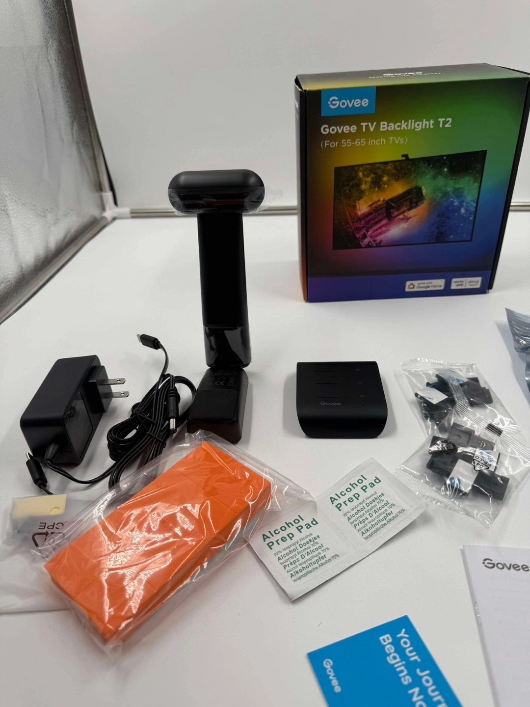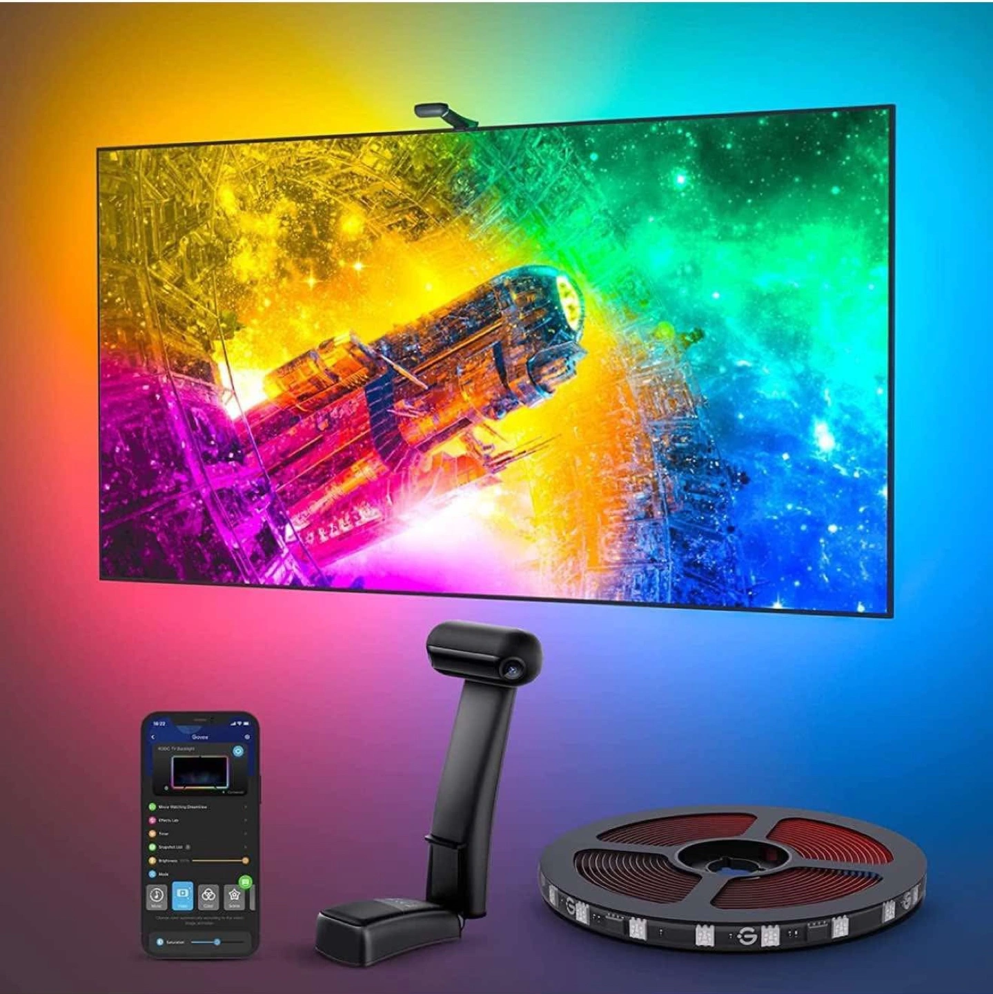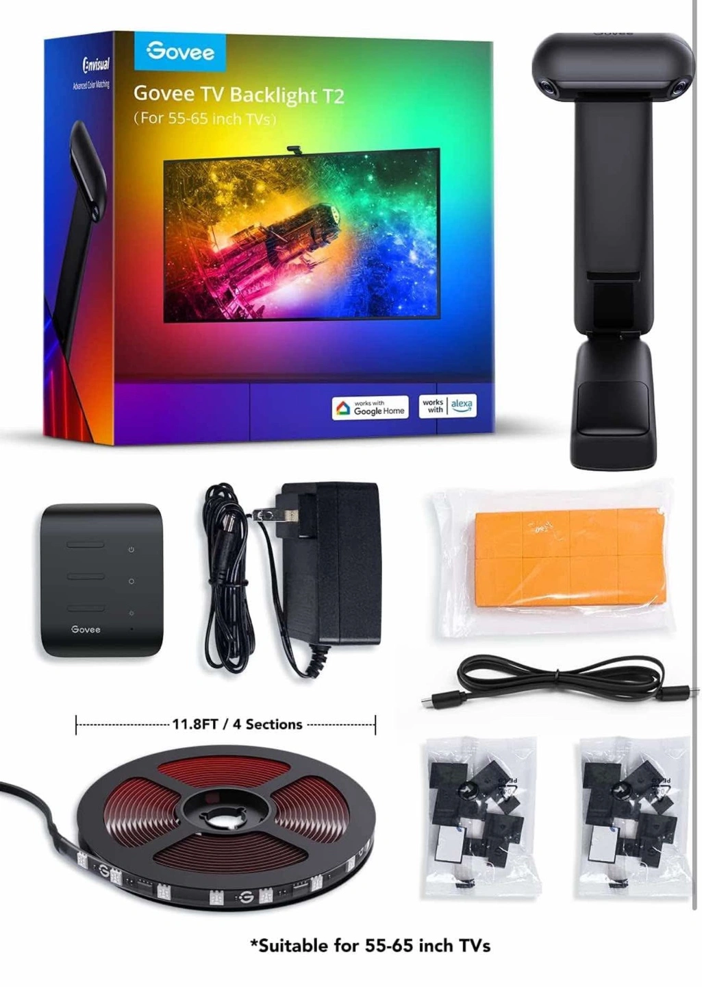83Govee smart TV backlight. Includes camera, LED strip, power adapter, and mounting accessories. Works with 55-65 inch TVs. Easy setup with app control. Great for enhancing your home theater experience.