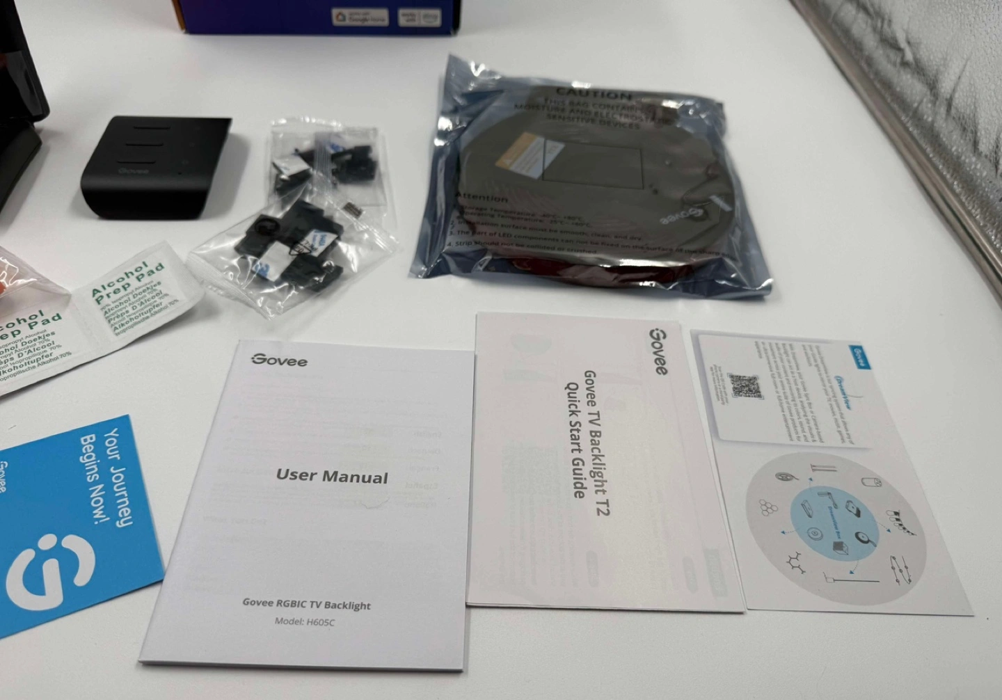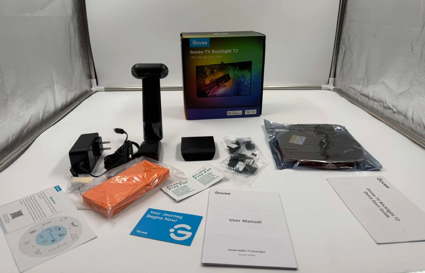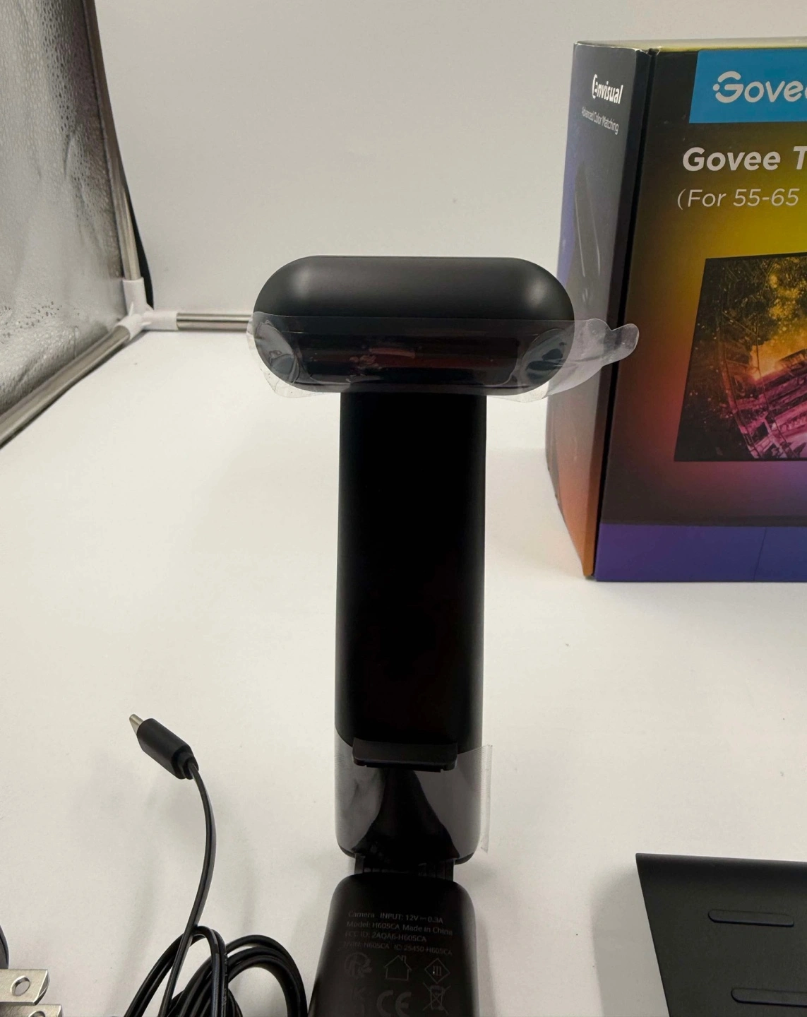 83Govee smart TV backlight. Includes camera, LED strip, power adapter, and mounting accessories. Works with 55-65 inch TVs. Easy setup with app control. Great for enhancing your home theater experience.
