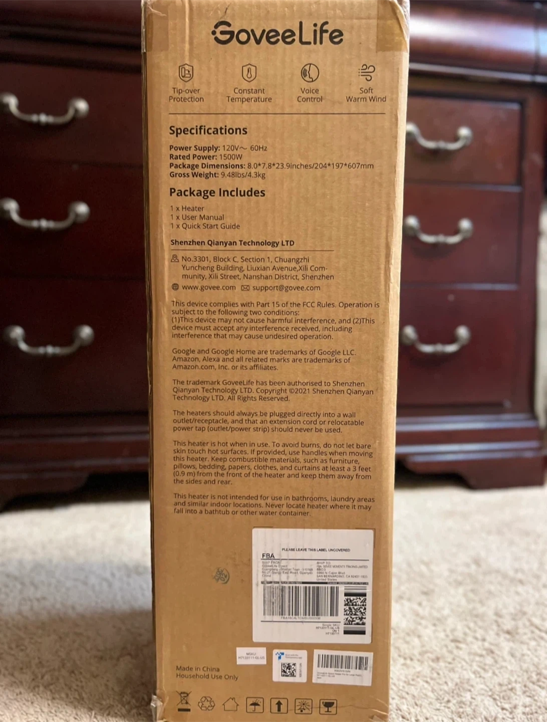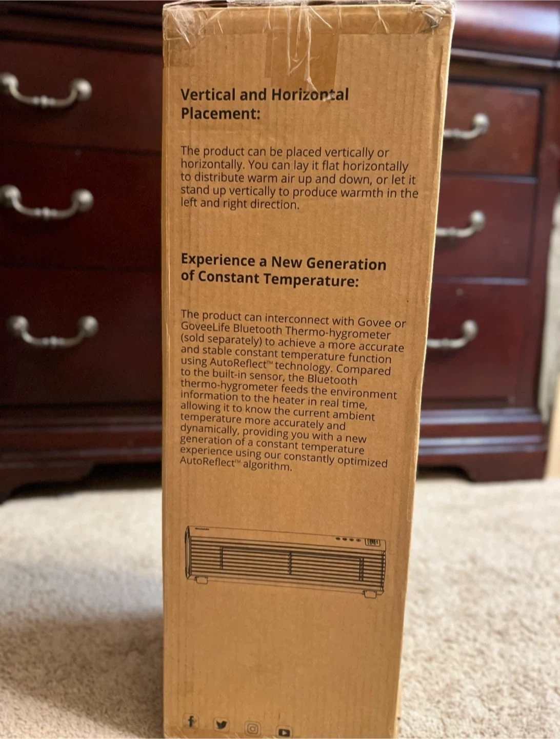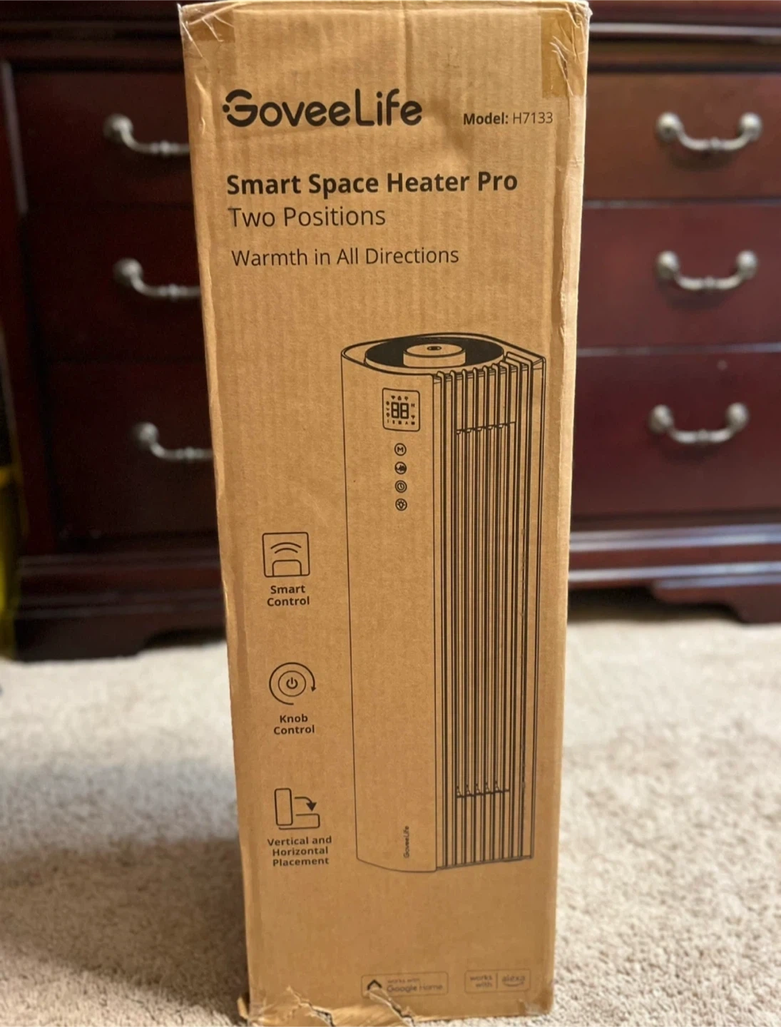 119I'm selling a GoveeLife Smart Space Heater Pro, model H7133. It's in like-new condition and comes with the original box. Key Features: - Smart Control - Knob Control - Vertical and Horizontal Placement Specifications: - Power Supply: 120V~ 60Hz - Rated Power: 1500W - Package Dimensions: 8.0*7.8*23.9inches / 204*197*607mm - Gross Weight: 9.48lbs/4.3kg Package includes: - 1 x Heater - 1 x User Manual - 1 x Quick Start Guide
