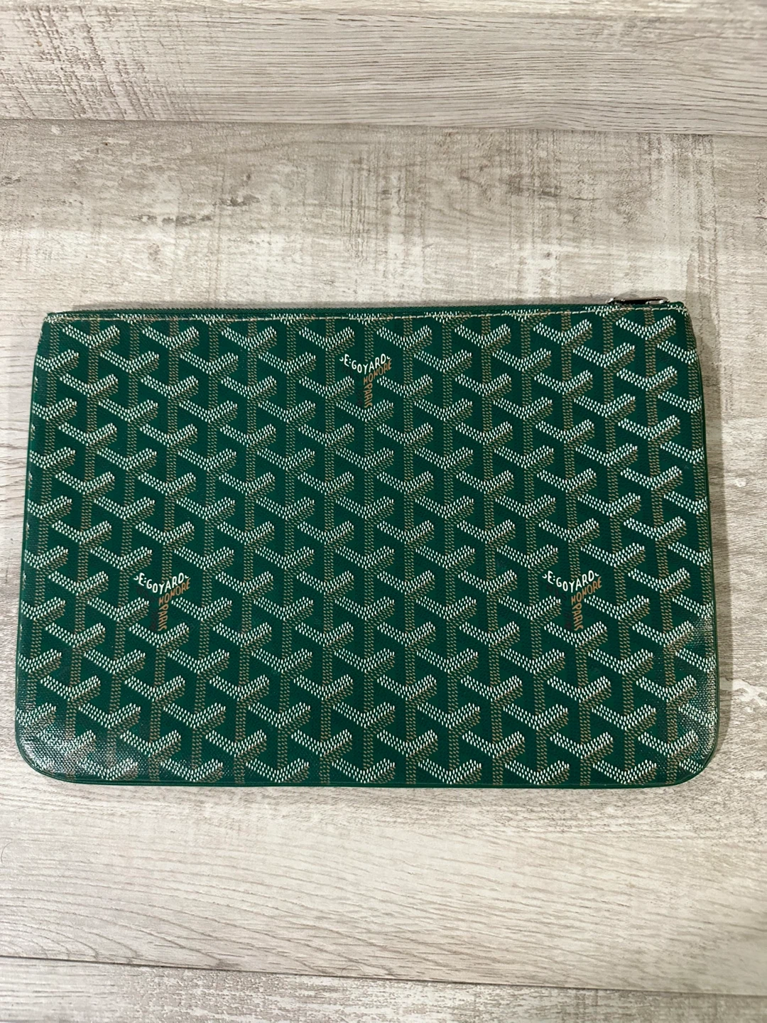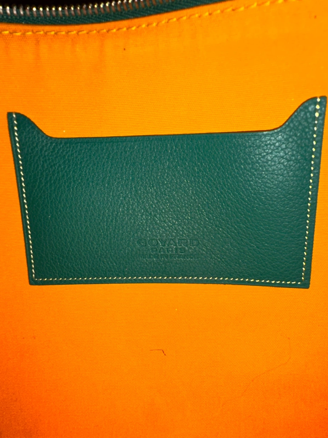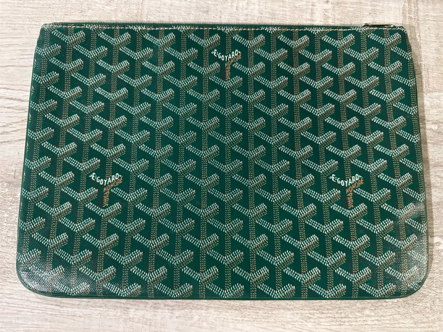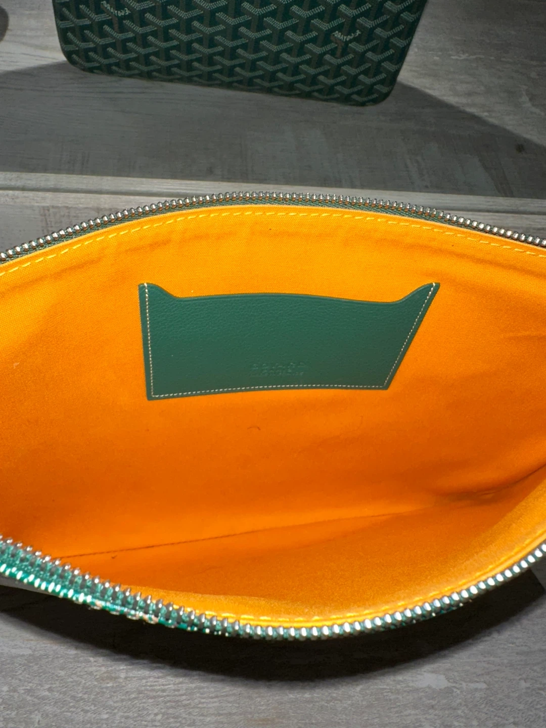Selling a Goyard pouch in classic green Goyardine coated canvas with orange interior lining. It's in great condition and perfect for carrying your essentials. Feel free to ask any questions!