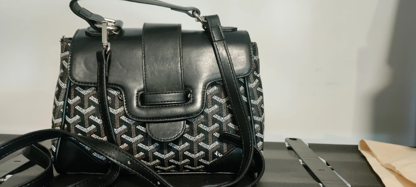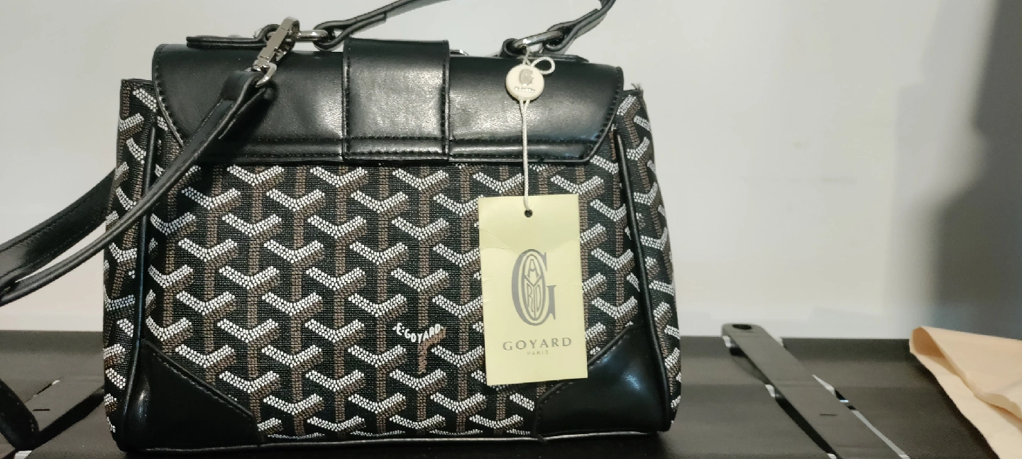 Selling a Goyard mini handbag in black. It's in great condition and ready for a new home! The bag features the classic Goyardine pattern and comes with a detachable shoulder strap. It's a stylish and compact accessory for any occasion