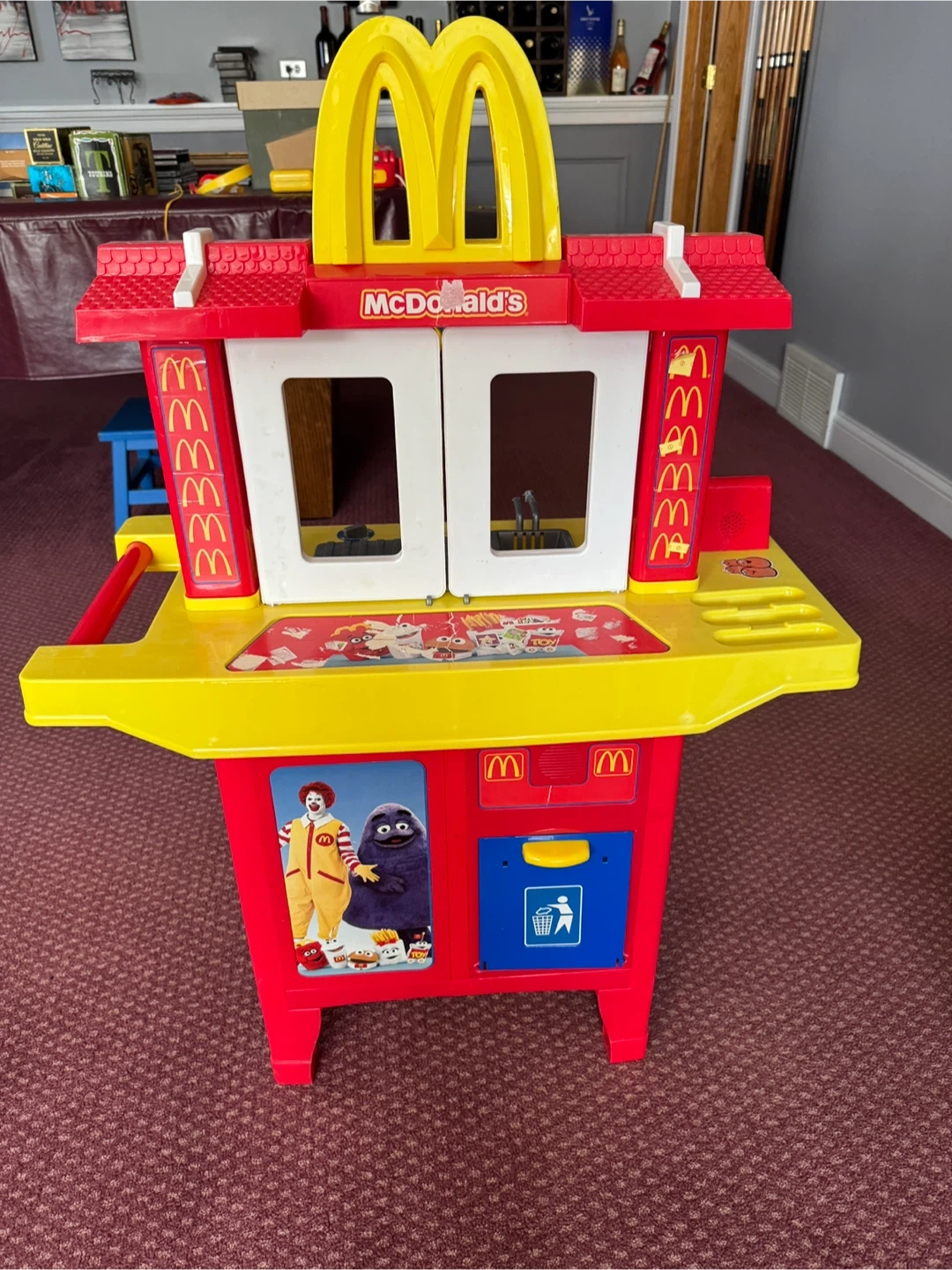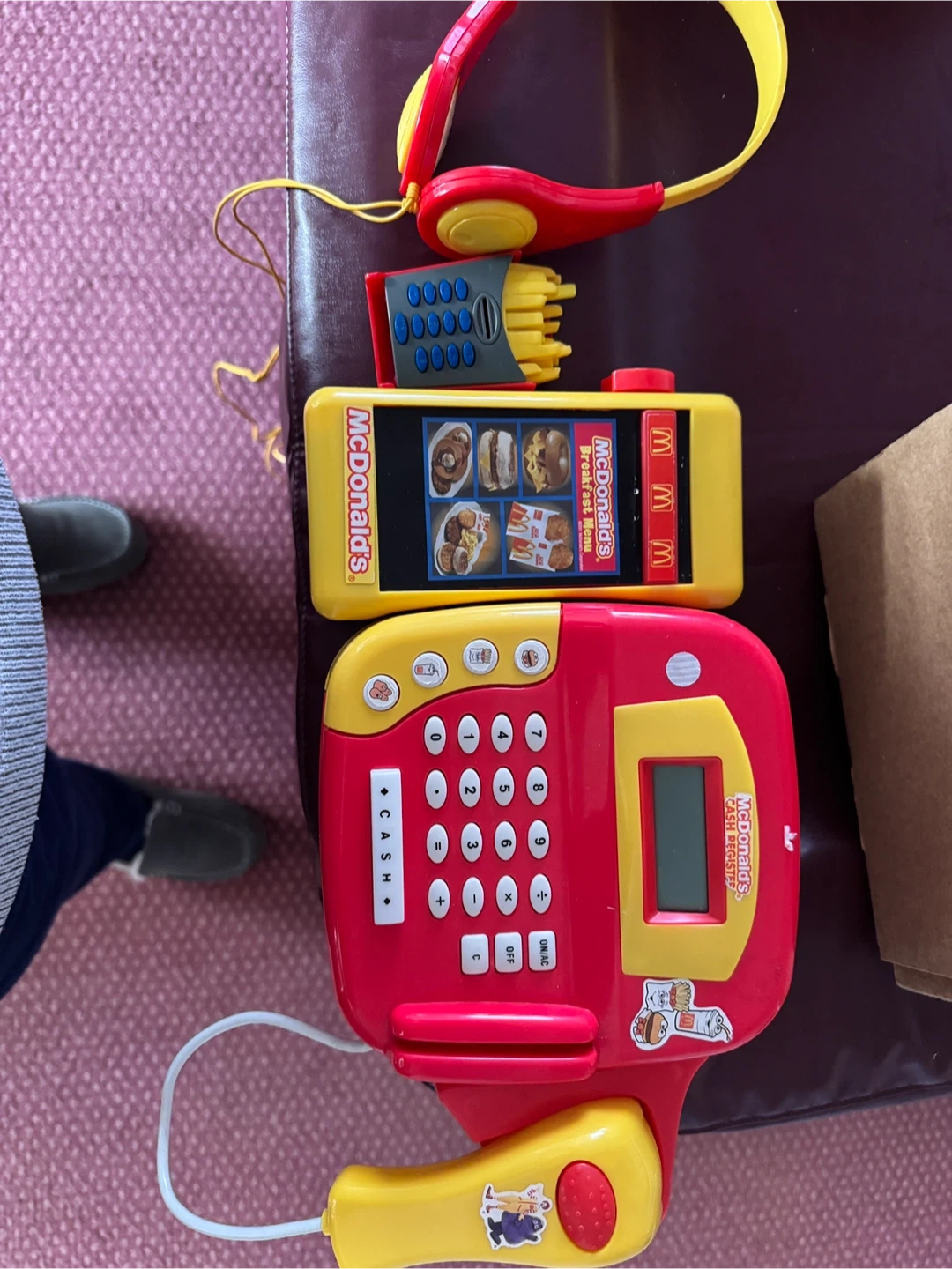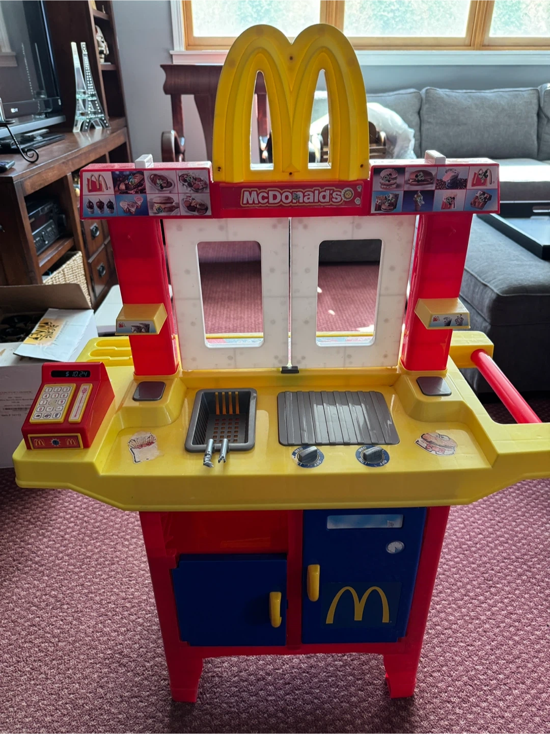 This is a fun McDonald's play kitchen playset with a cash register and accessories. It includes a headset, food order screen, and cash register. Perfect for imaginative play and hours of fun!