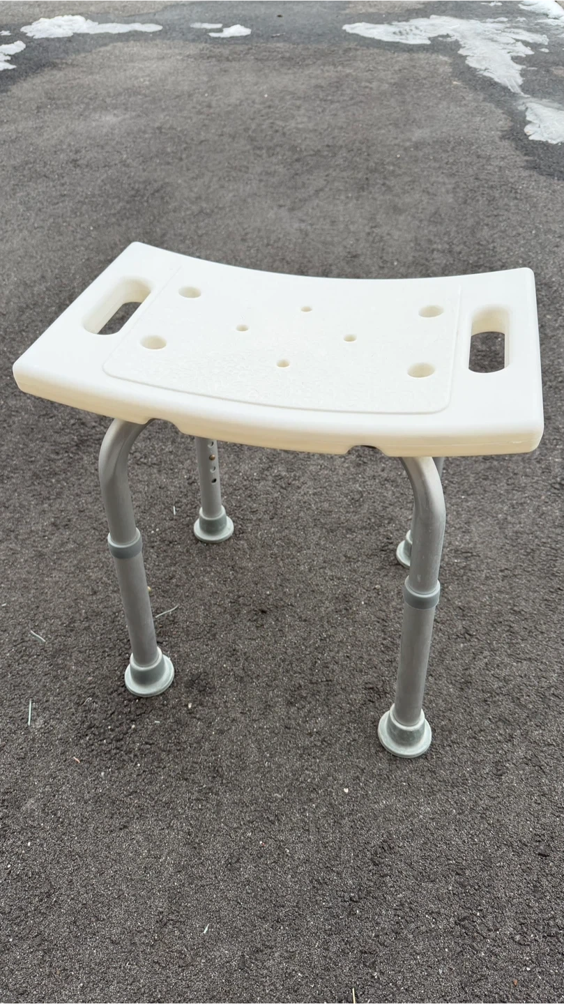Selling a bath/shower chair with adjustable height legs. It's in good condition and ready to use! The chair is white with silver legs and features a textured seat with holes for drainage and handles on either side for easy grip and stability