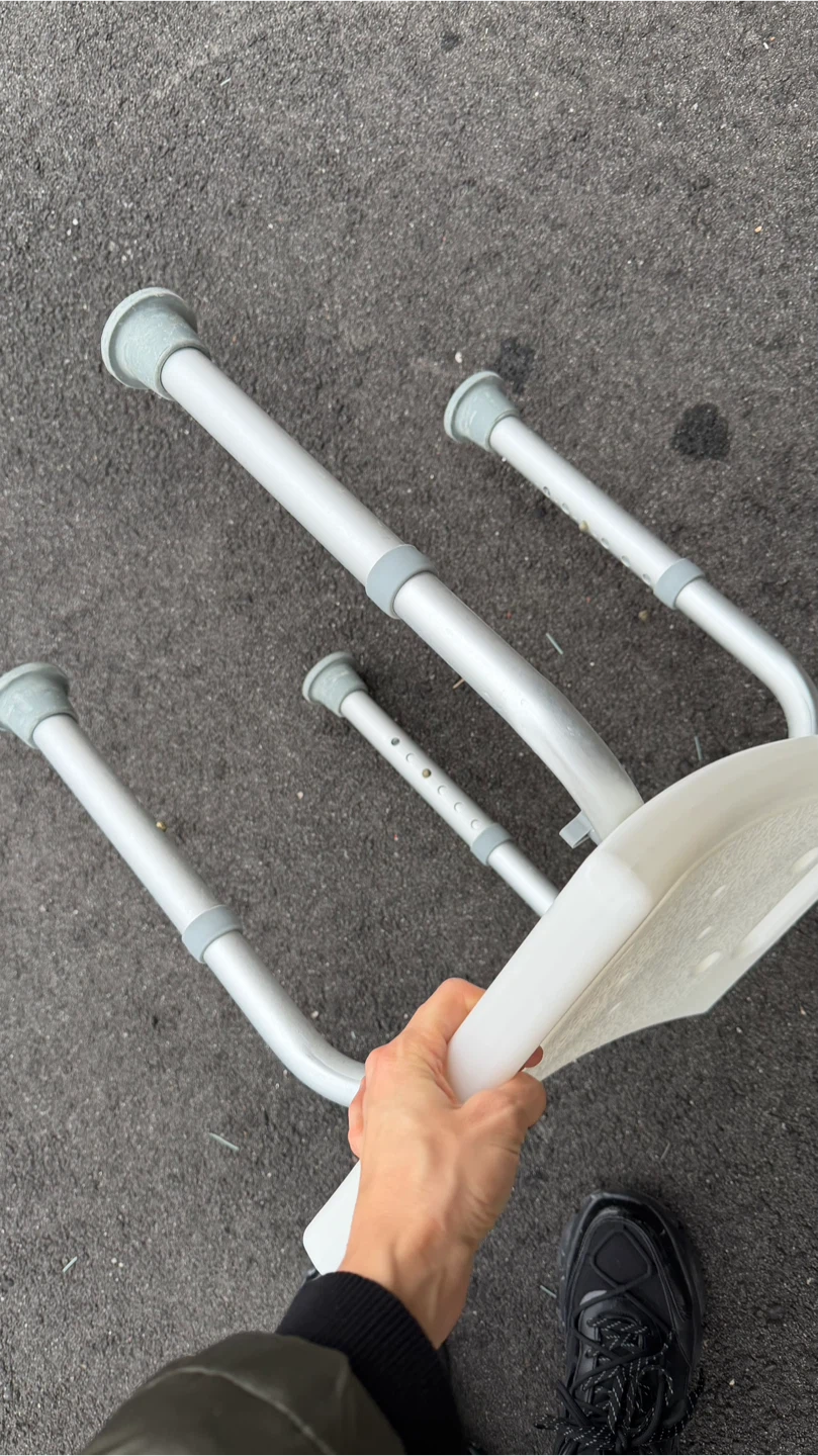 Selling a bath/shower chair with adjustable height legs. It's in good condition and ready to use! The chair is white with silver legs and features a textured seat with holes for drainage and handles on either side for easy grip and stability