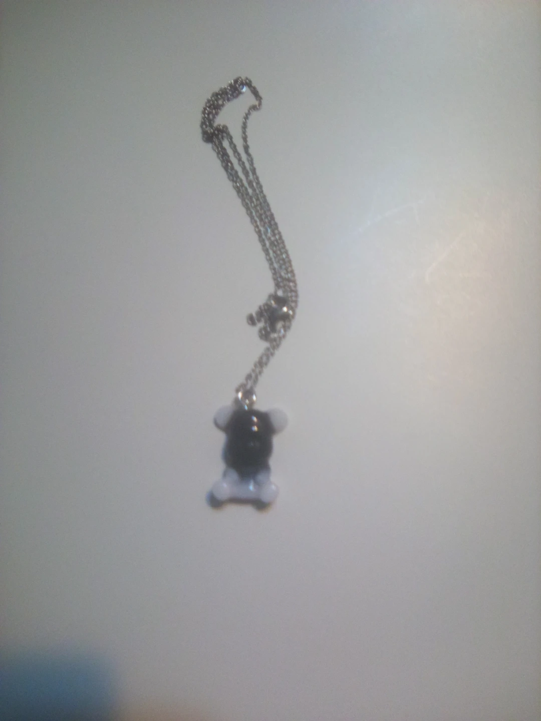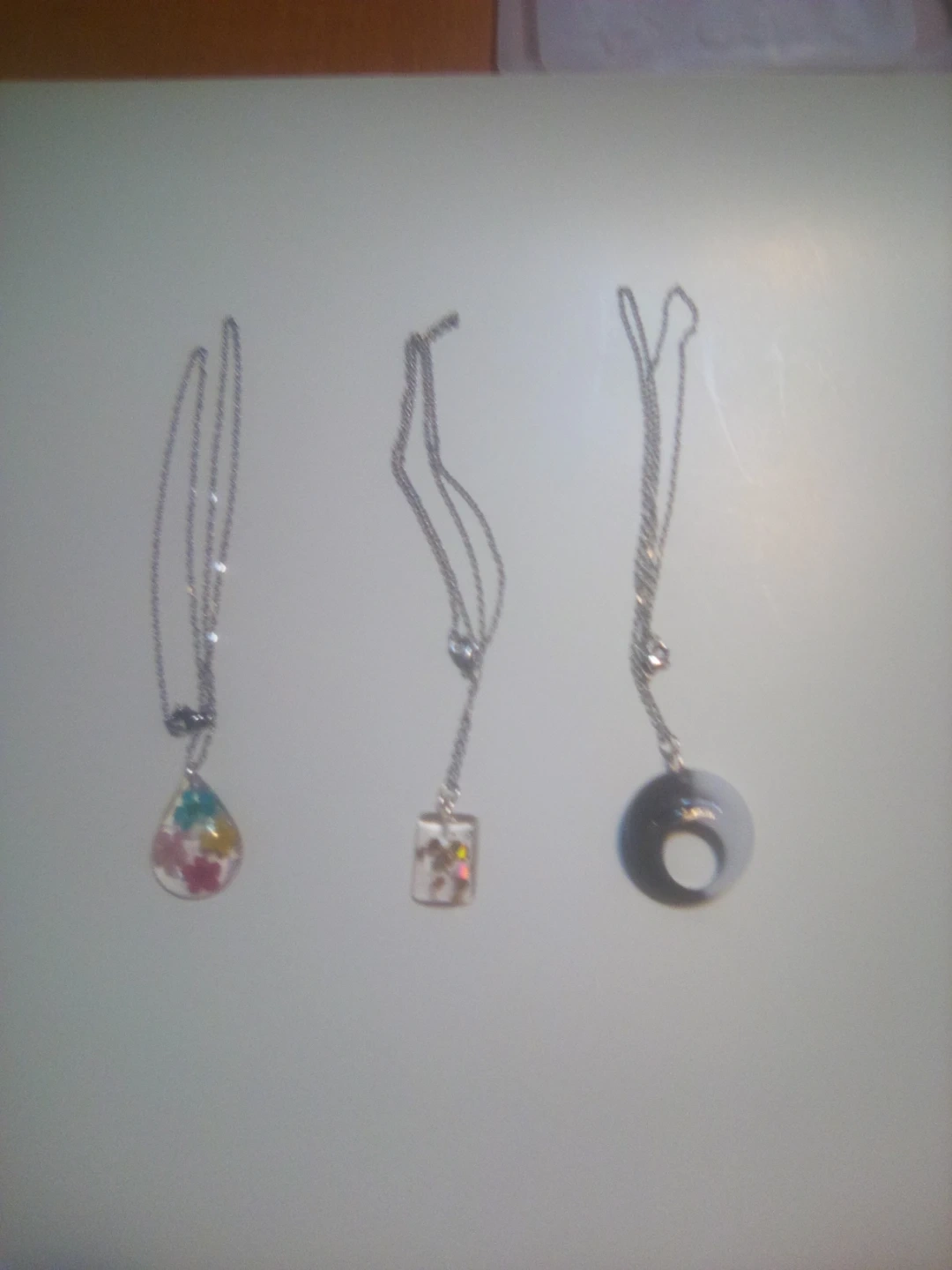 Includes a floral teardrop, a square resin pendant, a yin yang pendant, and a bear pendant. All necklaces have silver-tone chains. Each one are made of resin.