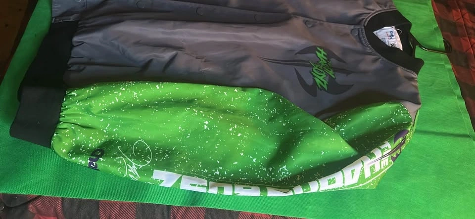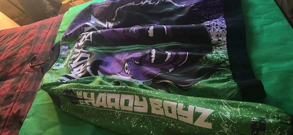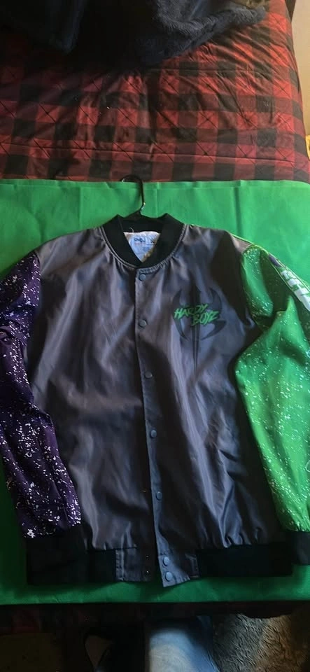 Awesome WWE Hardy Boyz bomber jacket. Has the Hardy Boyz logo on front. Gray body with cool purple and green splatter print sleeves. Snap button closure.