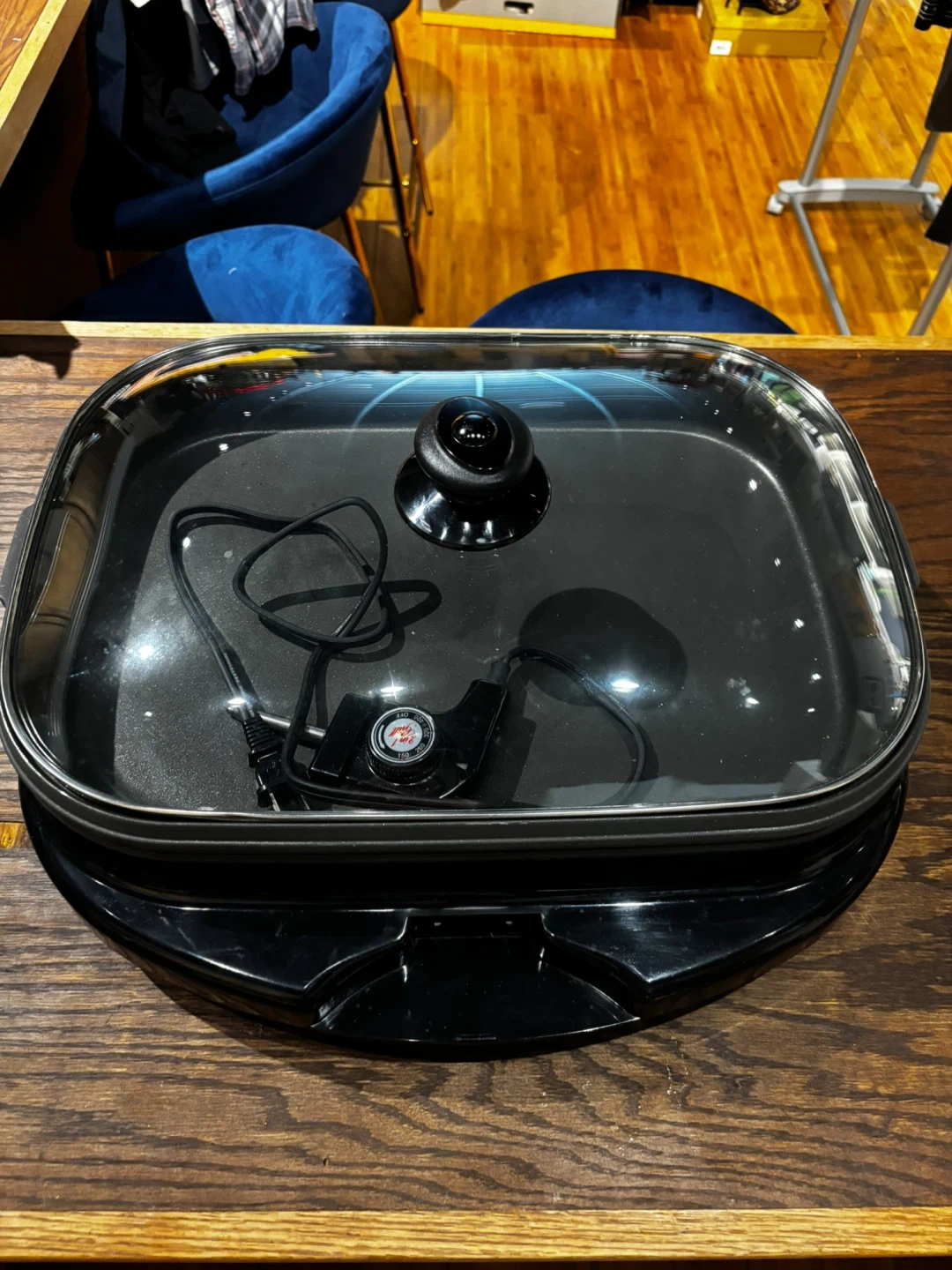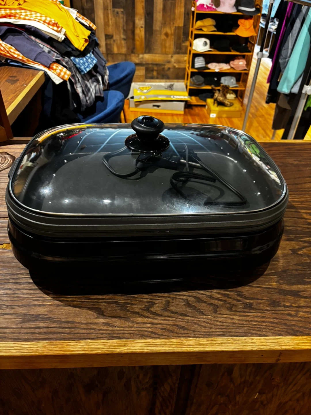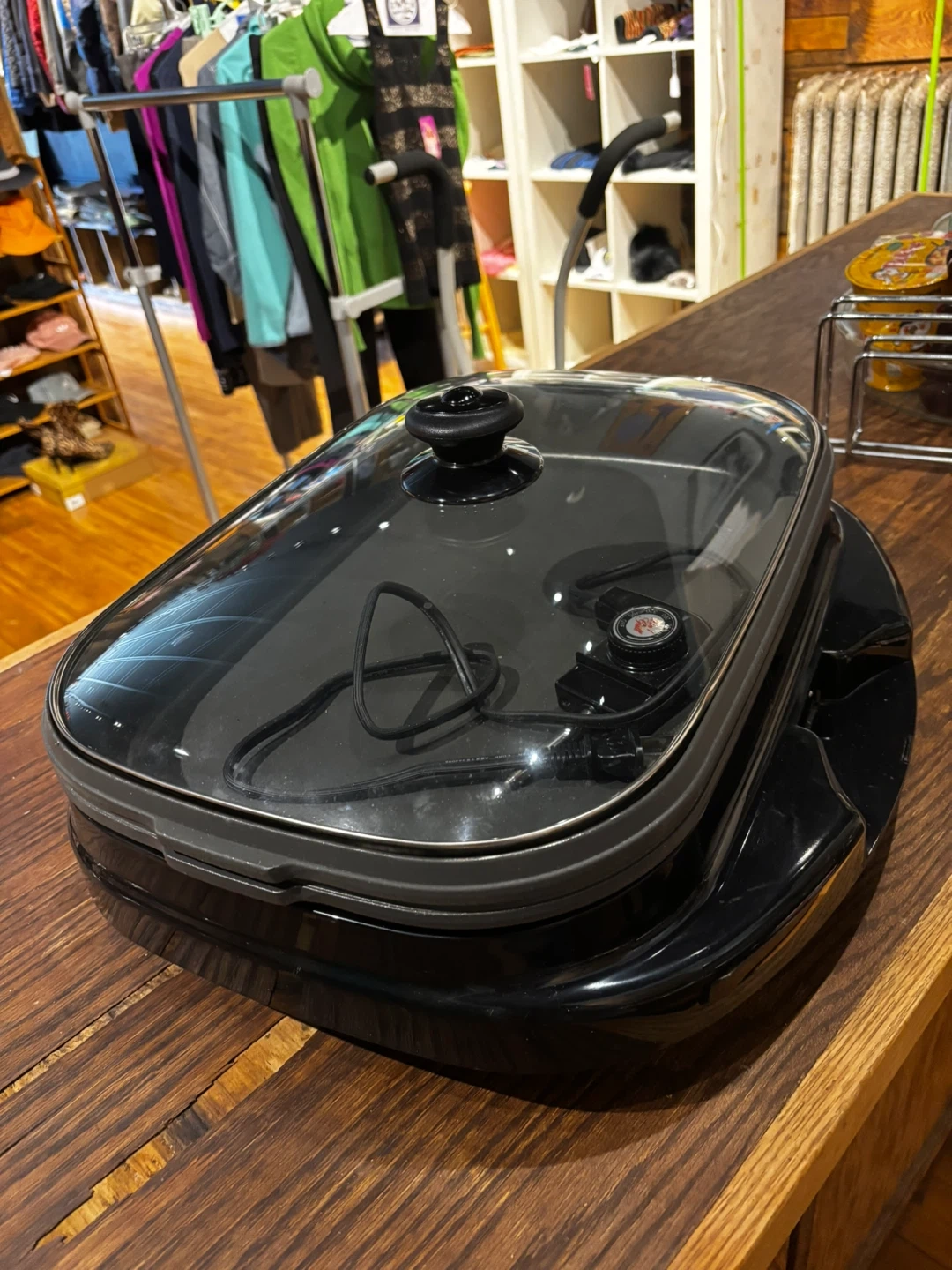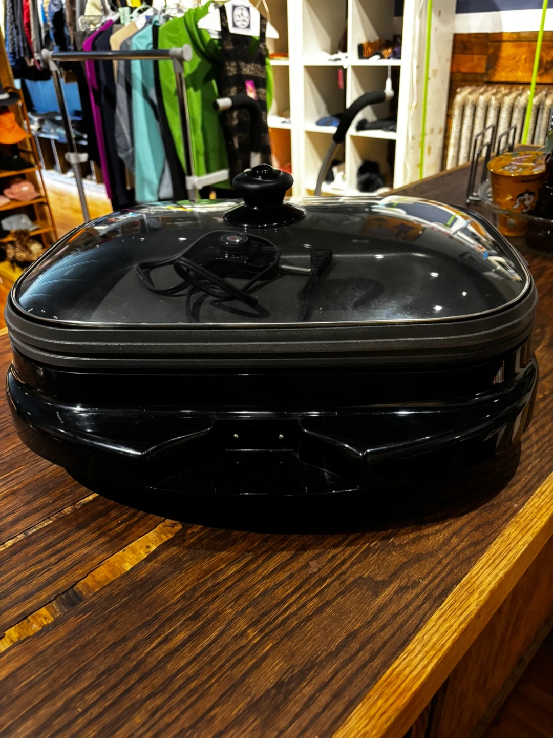 This black electric griddle features a non-stick surface and a tempered glass lid with a handle. It includes a detachable temperature control probe. Perfect for cooking various meals indoors! 18-15-6”