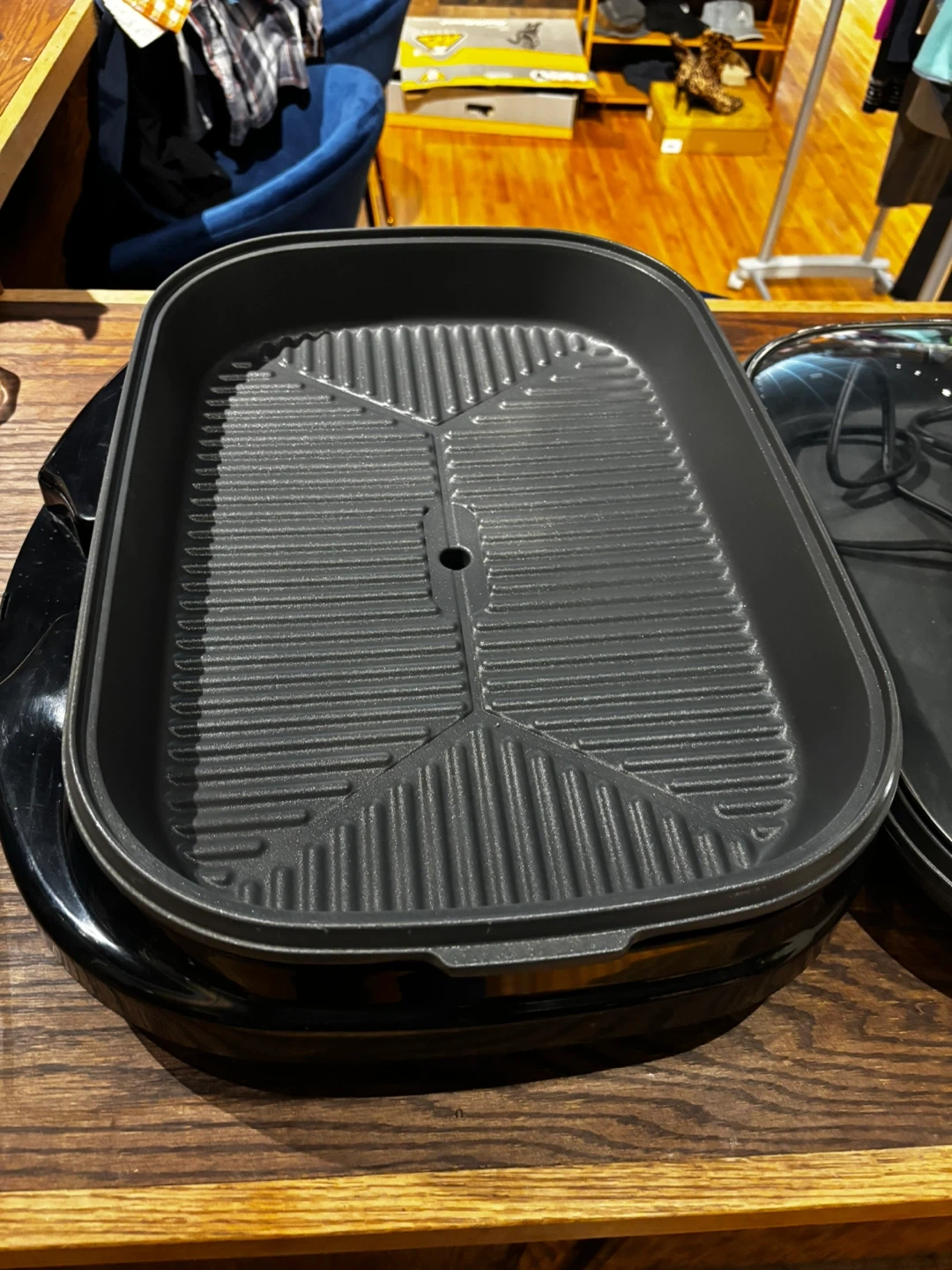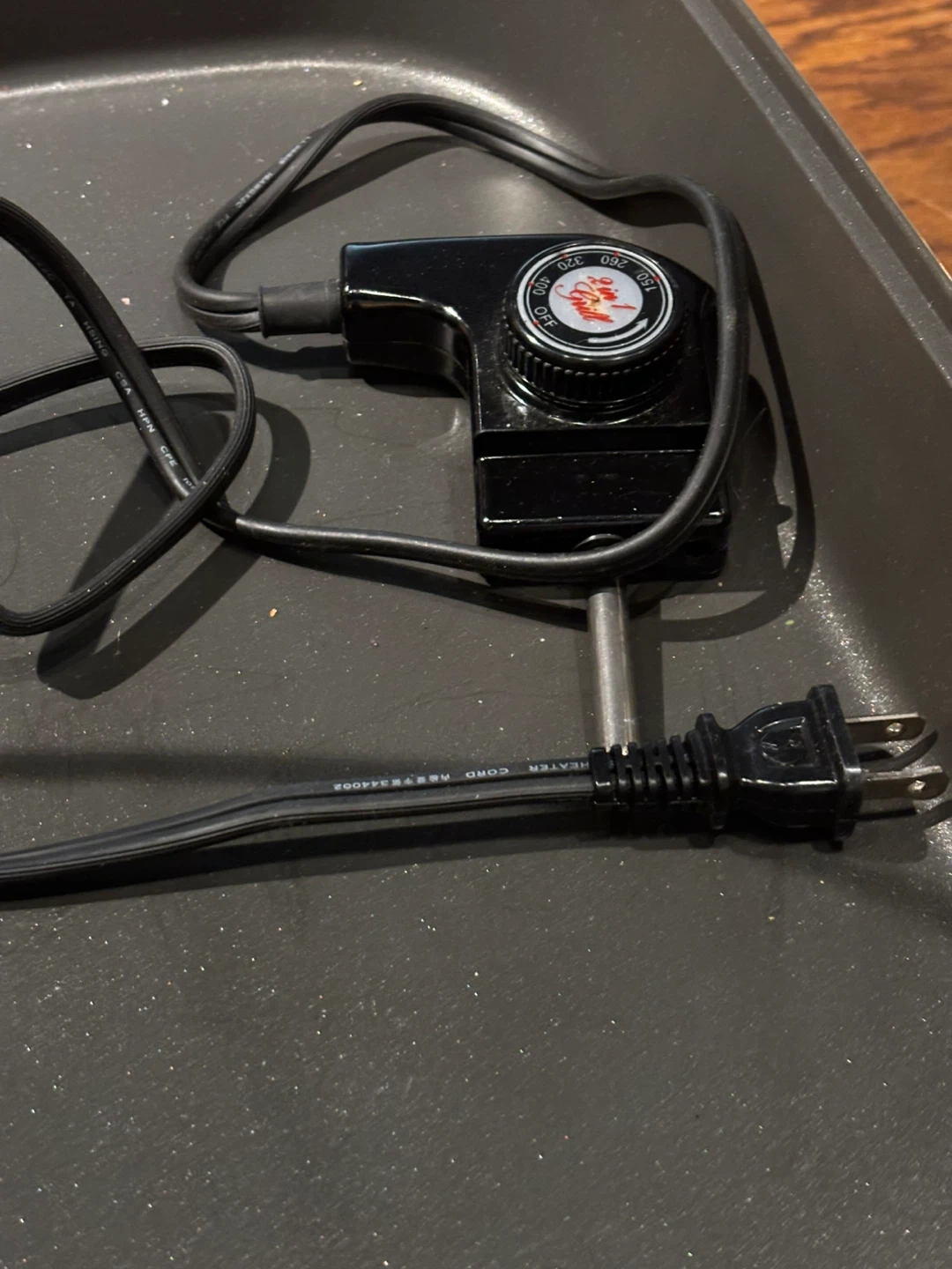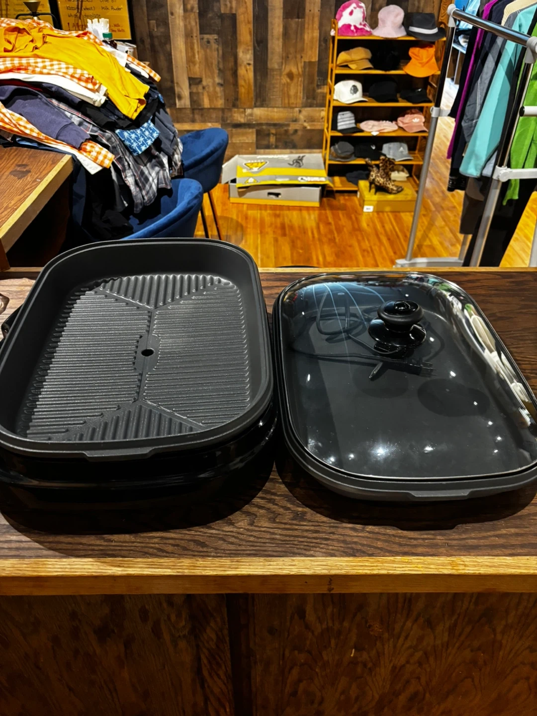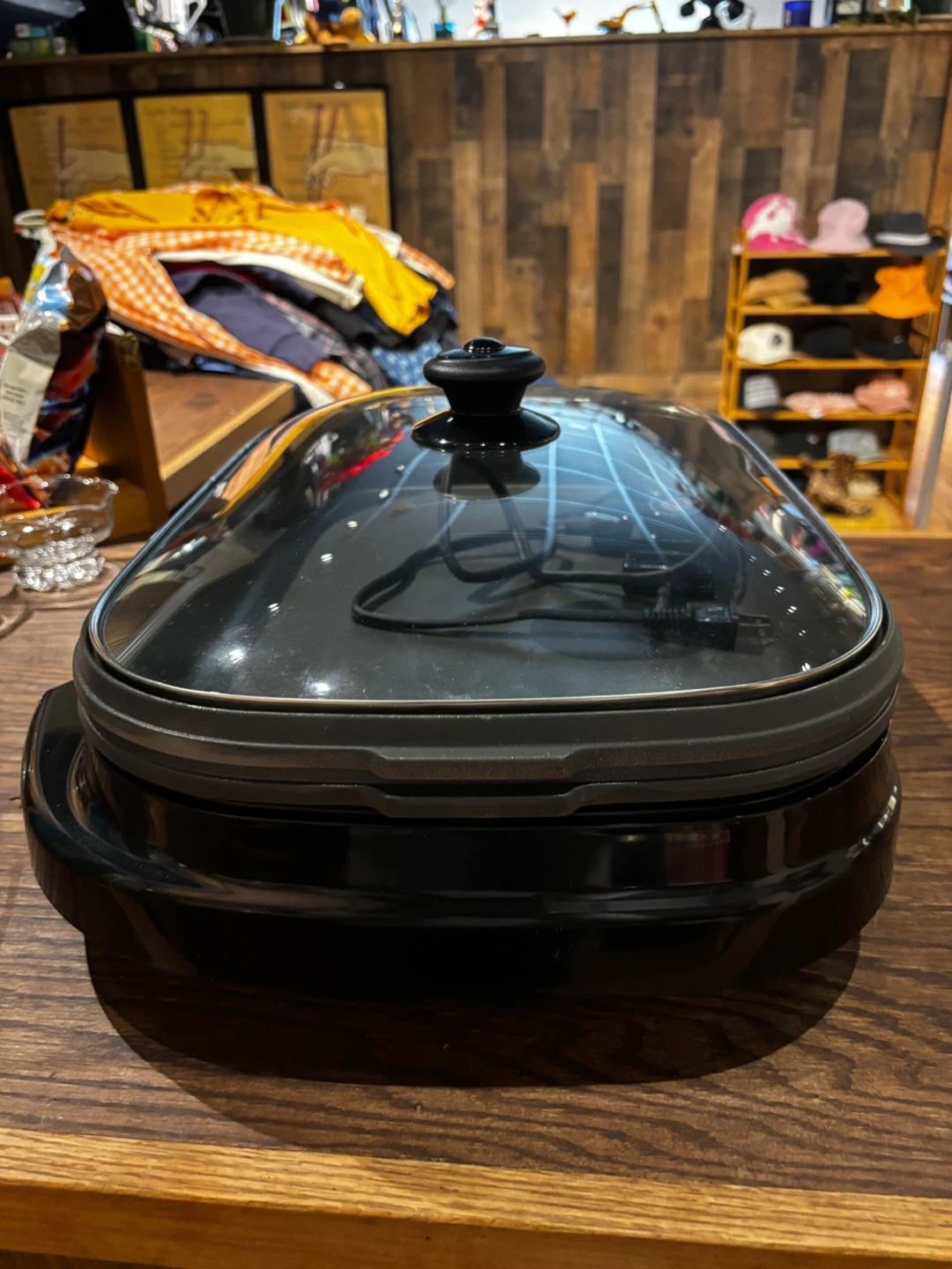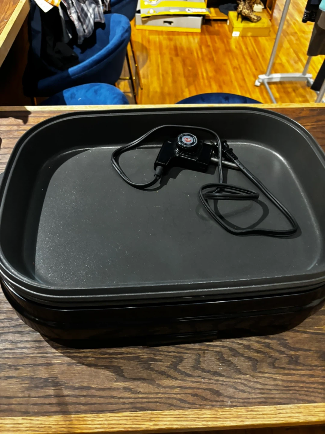 This black electric griddle features a non-stick surface and a tempered glass lid with a handle. It includes a detachable temperature control probe. Perfect for cooking various meals indoors! 18-15-6”