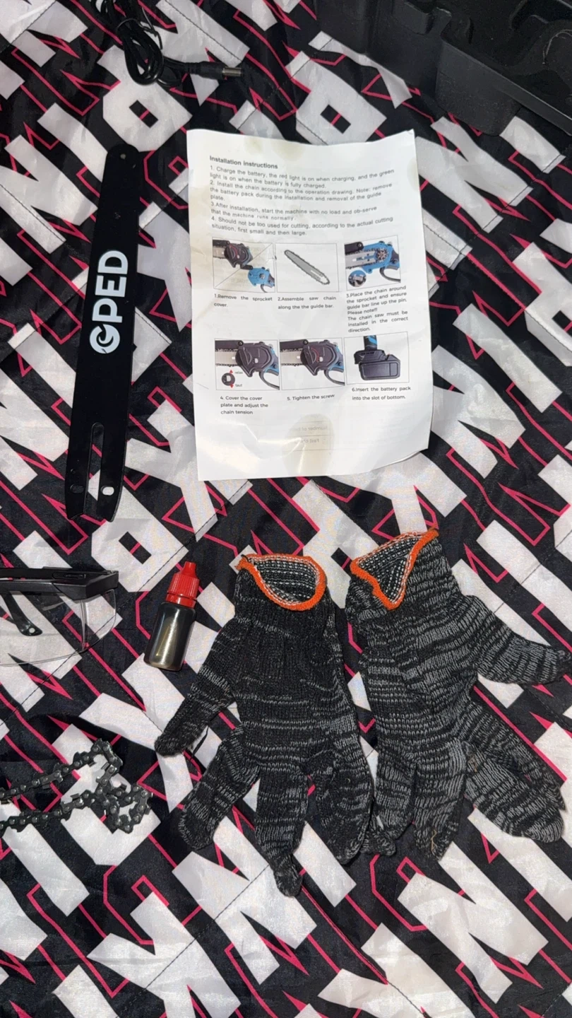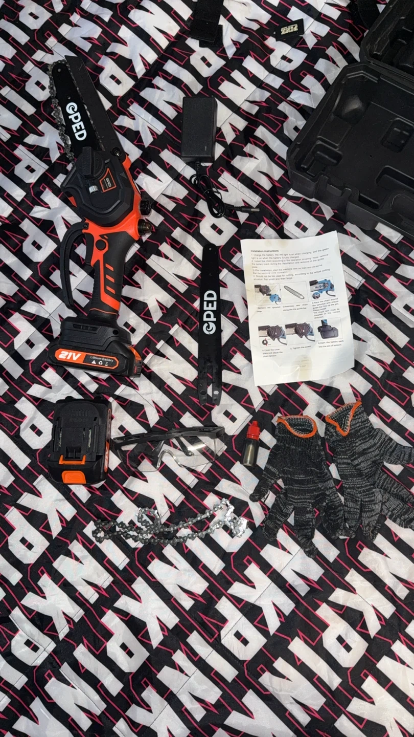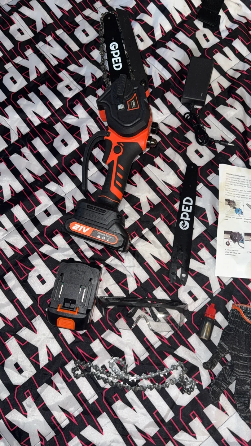 Selling a GPED mini cordless chainsaw. It comes with a 21V lithium battery, charger, safety glasses, gloves, and instructions. Great for small jobs around the yard!