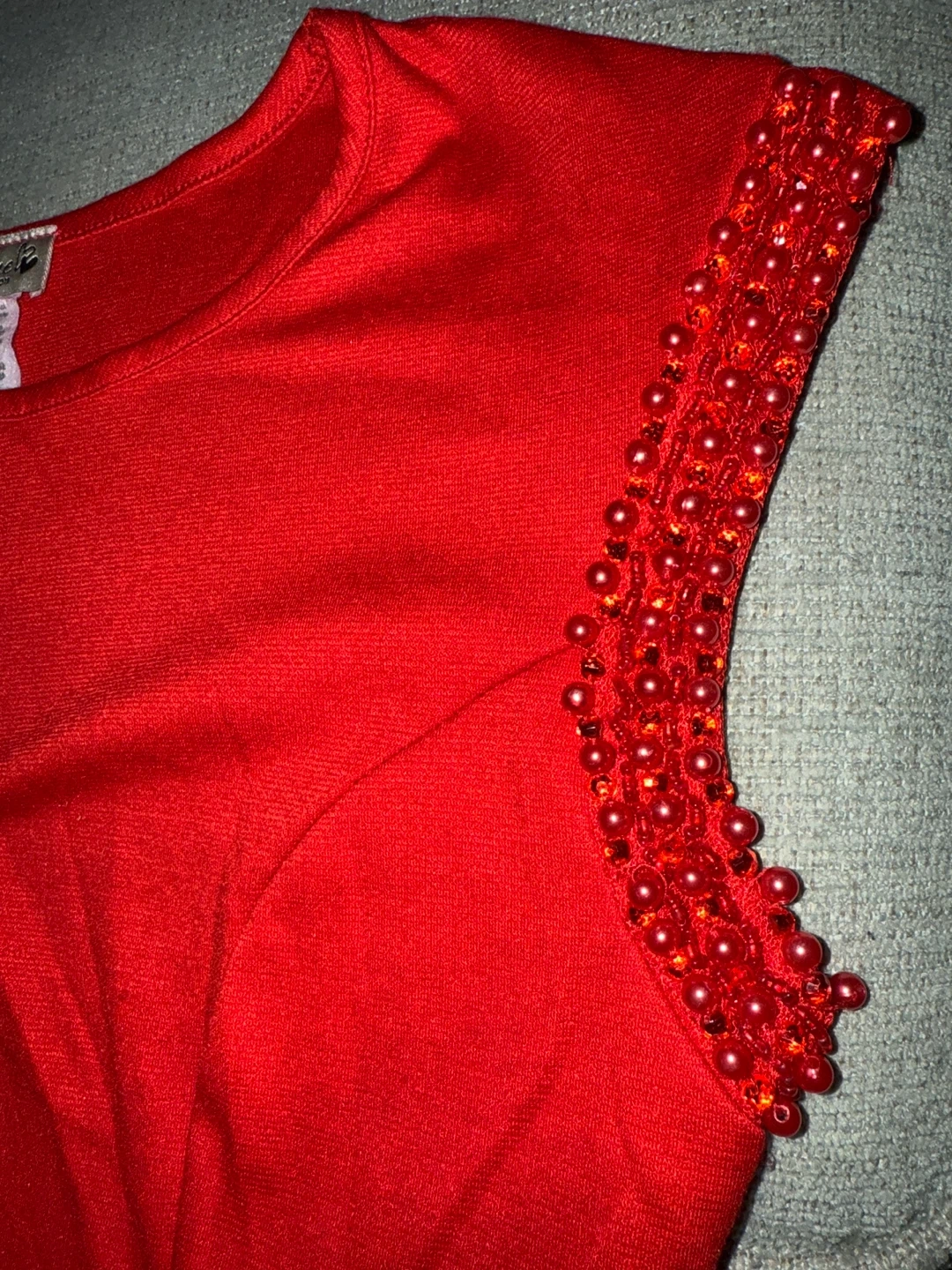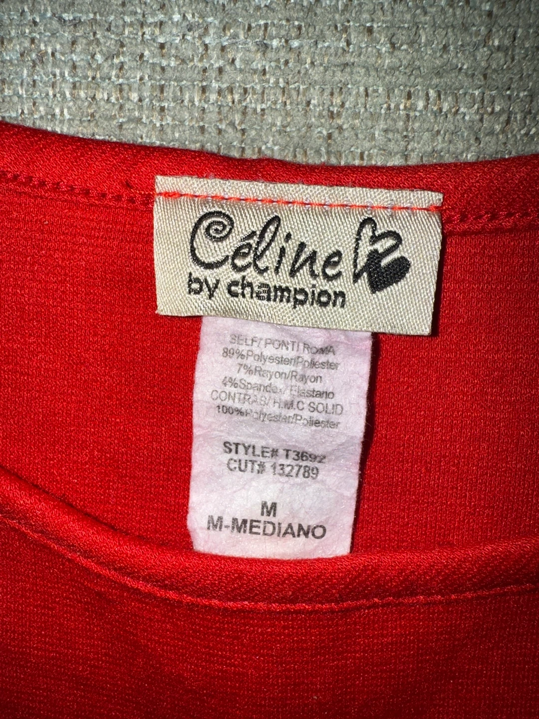 Selling a vibrant red shirt by Celine by Champion! This dress is a size medium and features a unique design with beaded embellishments on the shoulders. The dress is made of 89% polyester, 7% rayon, and 4% spandex for a comfortable and flattering fit
