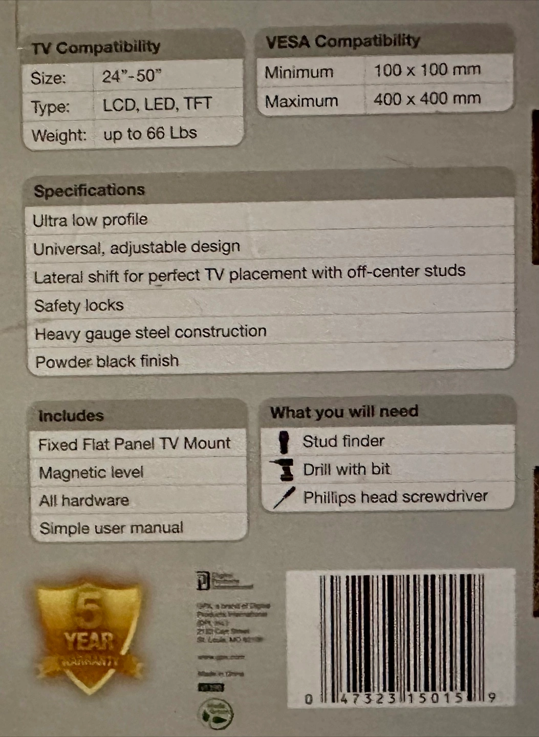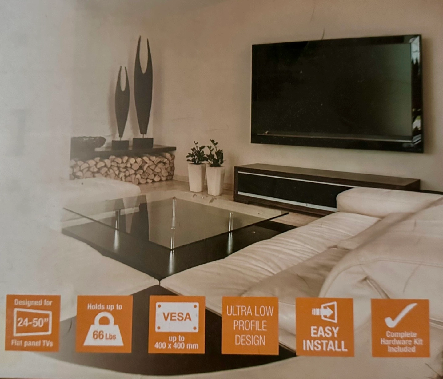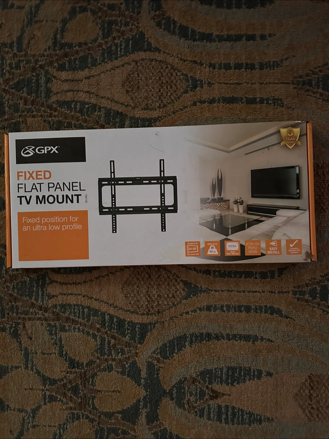 76Selling a GPX fixed flat panel TV mount designed for 24-50" flat panel TVs. It holds up to 66 lbs and is VESA compatible up to 400 x 400 mm. The mount features an ultra-low profile design and is easy to install. It also includes a magnetic level and all hardware, as well as a simple user manual ⭐️New In Box ⭐️