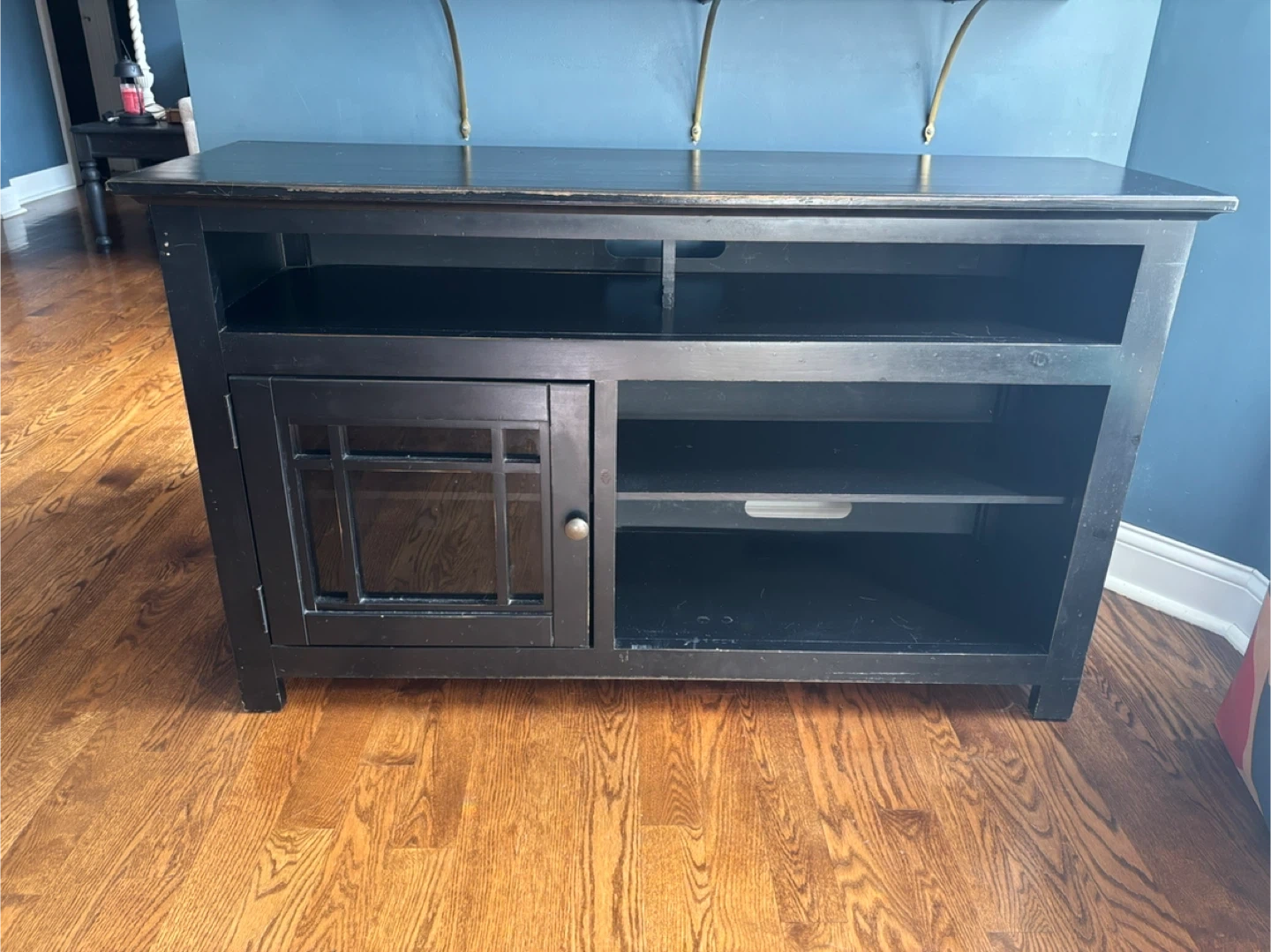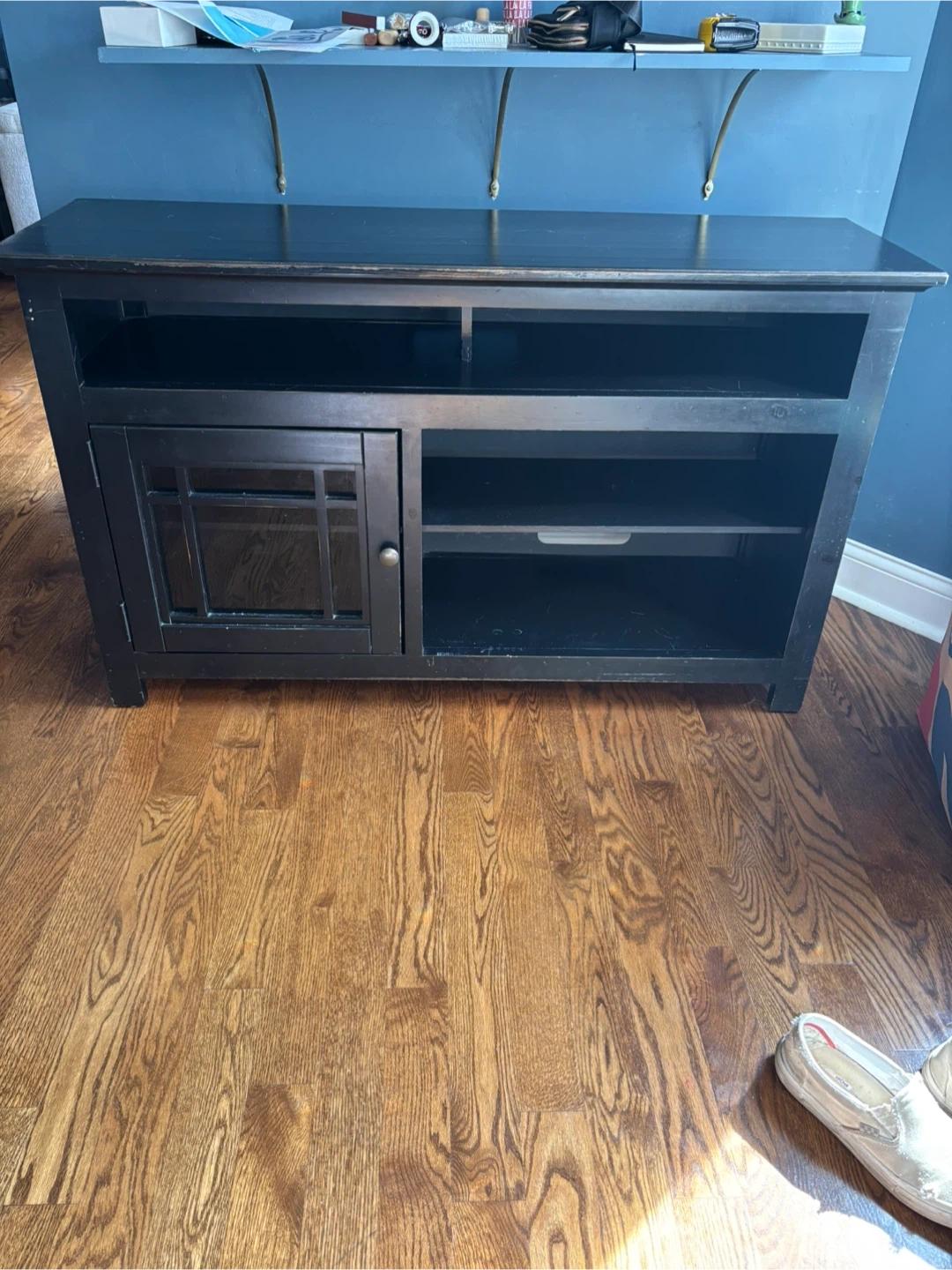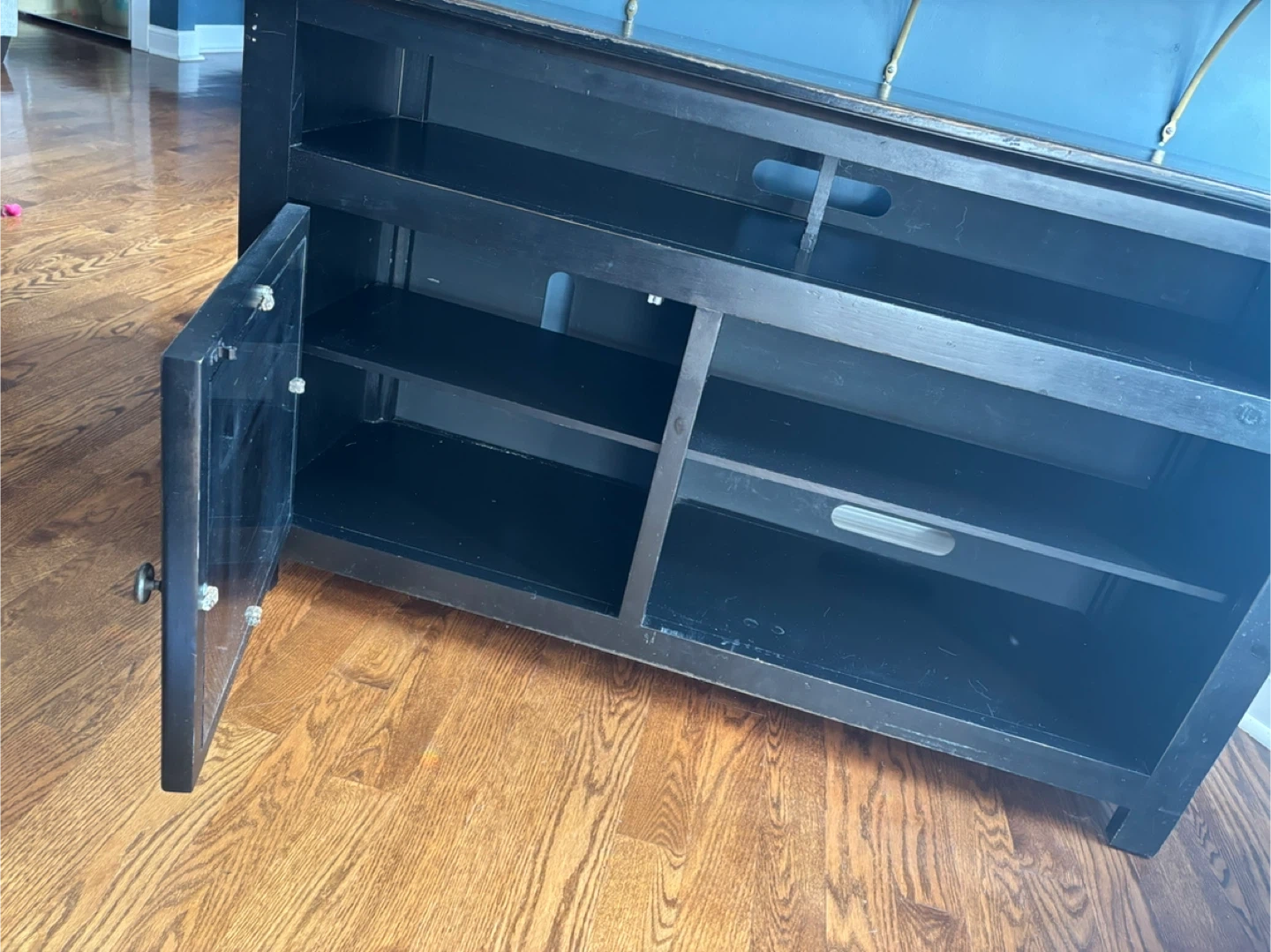 Black media console with a cabinet and open shelving. It's perfect for storing electronics and media. This unit offers ample space for your entertainment setup. Would be easy to paint if you don’t want it in black