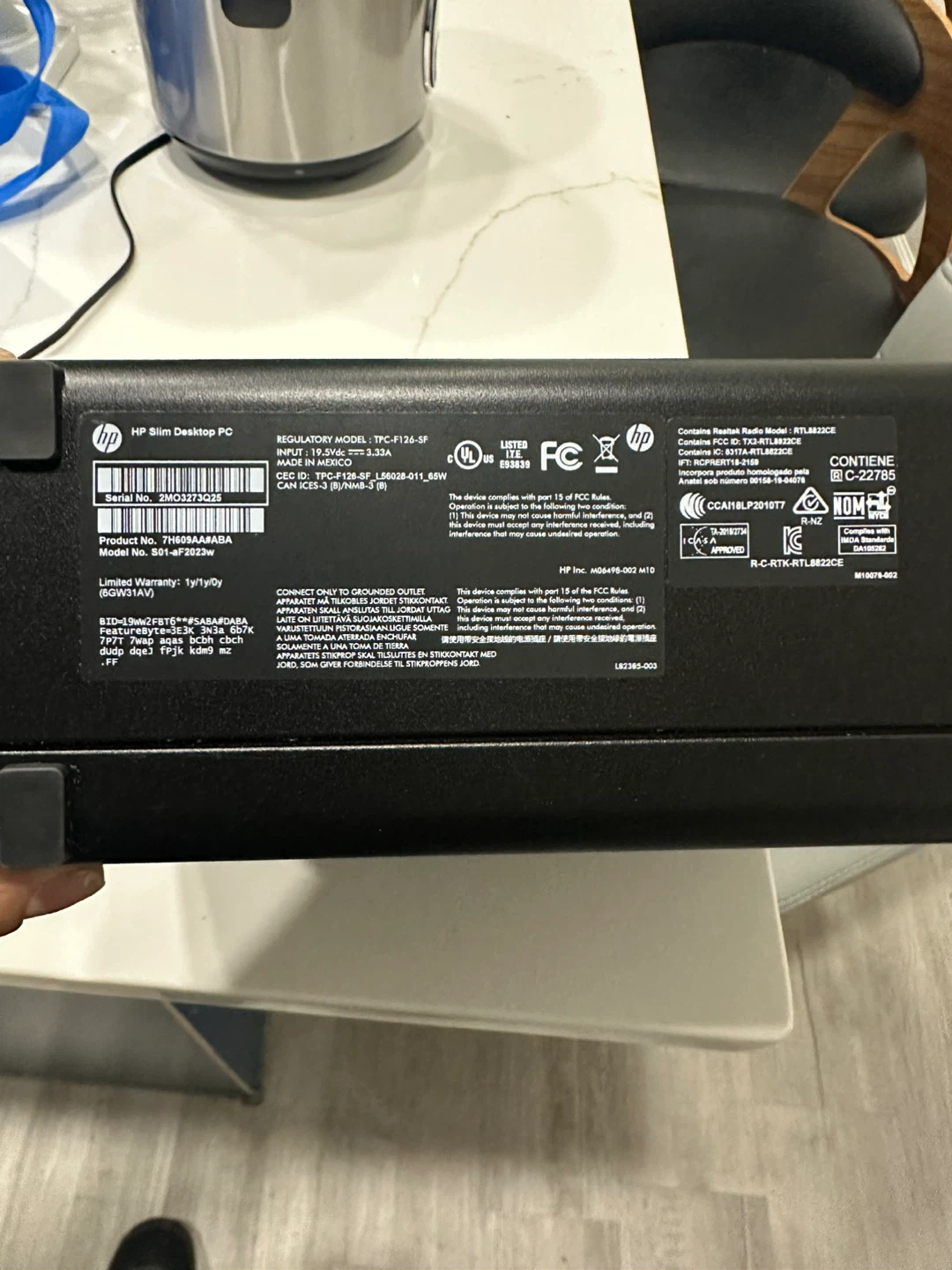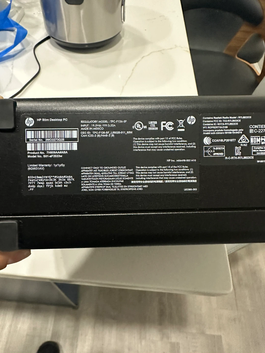 Selling an HP Slim Desktop PC. The regulatory model is TPC-F126-SF. The product number is 7H689AA#ABA and the model number is 501-aF023W. It contains Realtek Radio Model RTL8822CE.