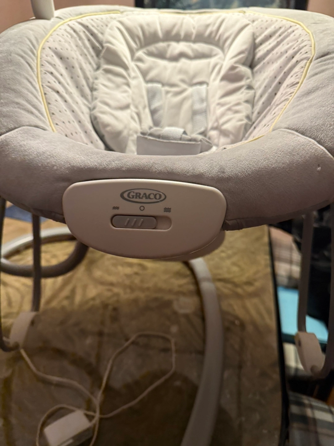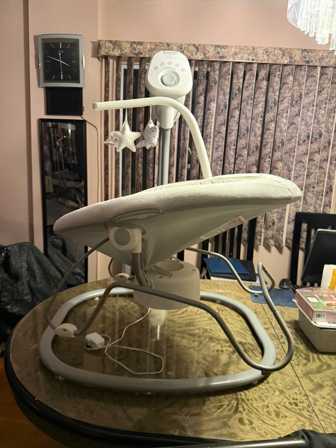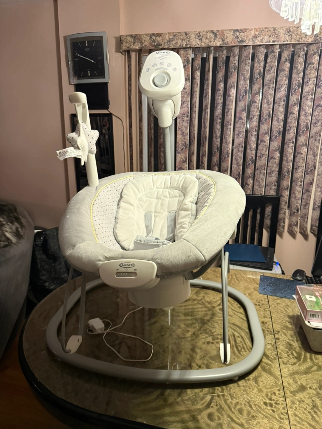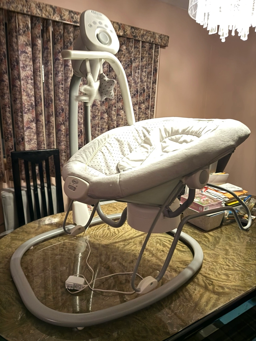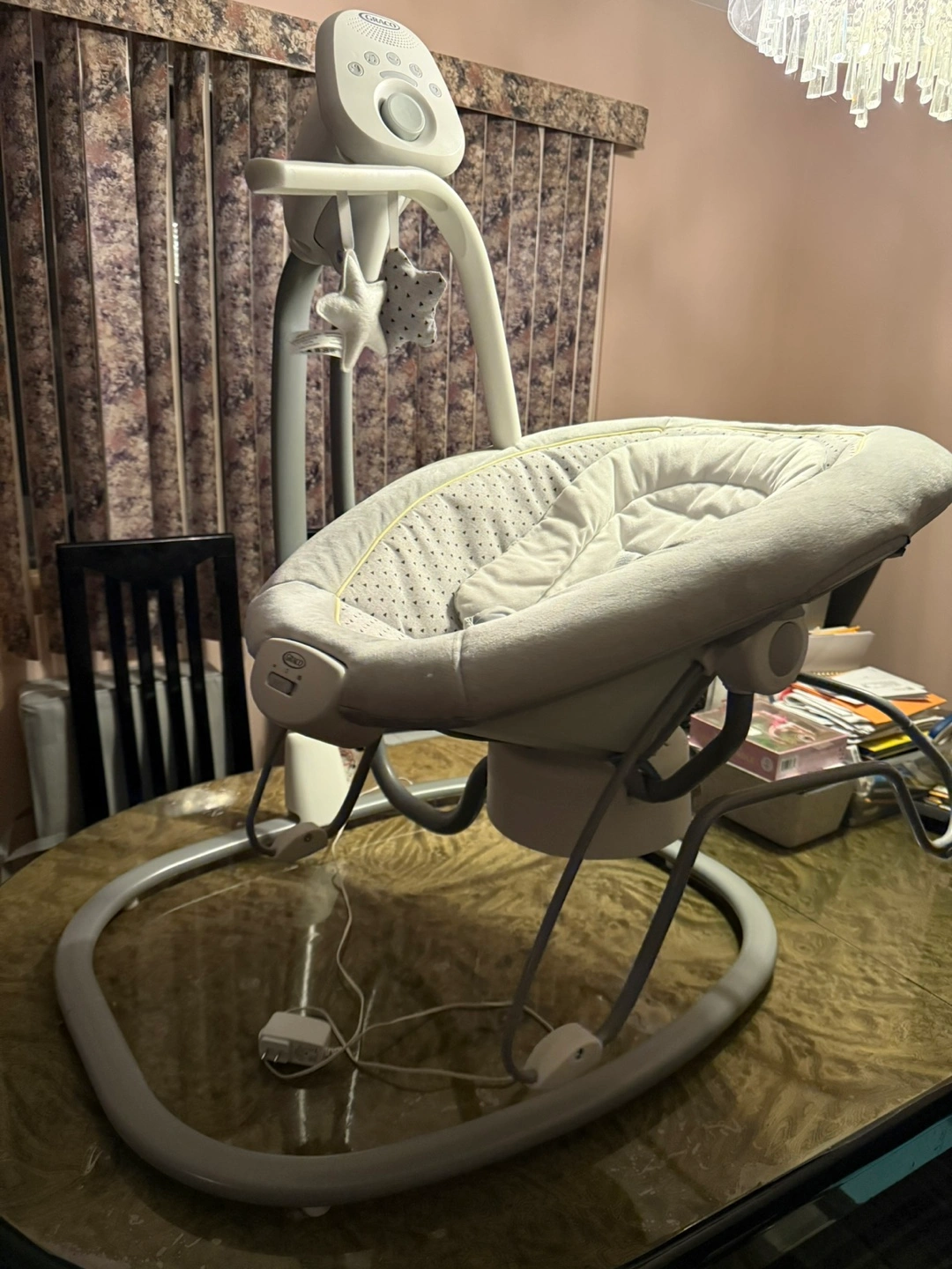 Selling a gently used Graco baby swing! It's in great condition and ready for a new little one. The swing features a comfortable seat and overhead mobile with cute star toys. It also has different speed and sound settings to soothe your baby