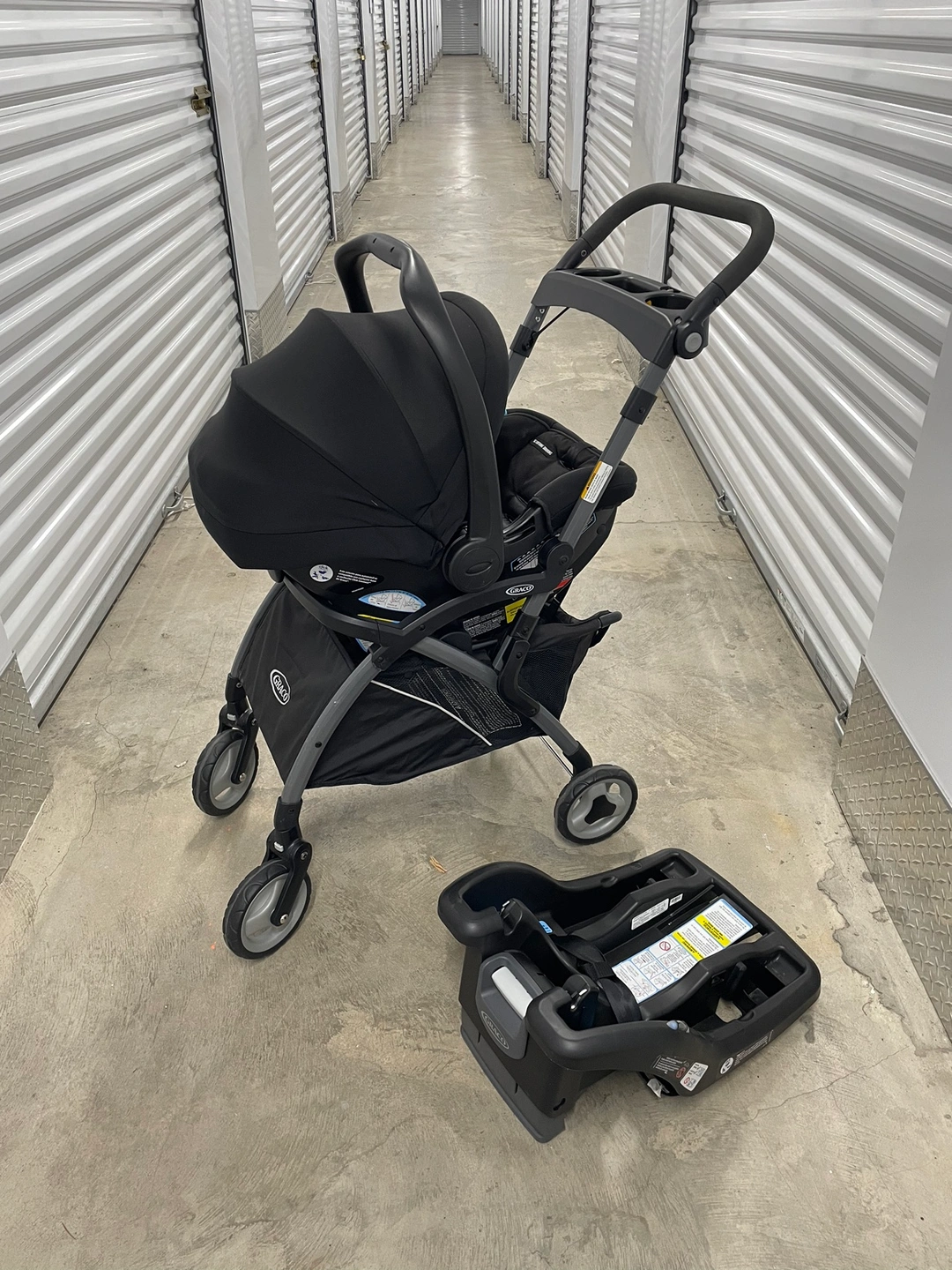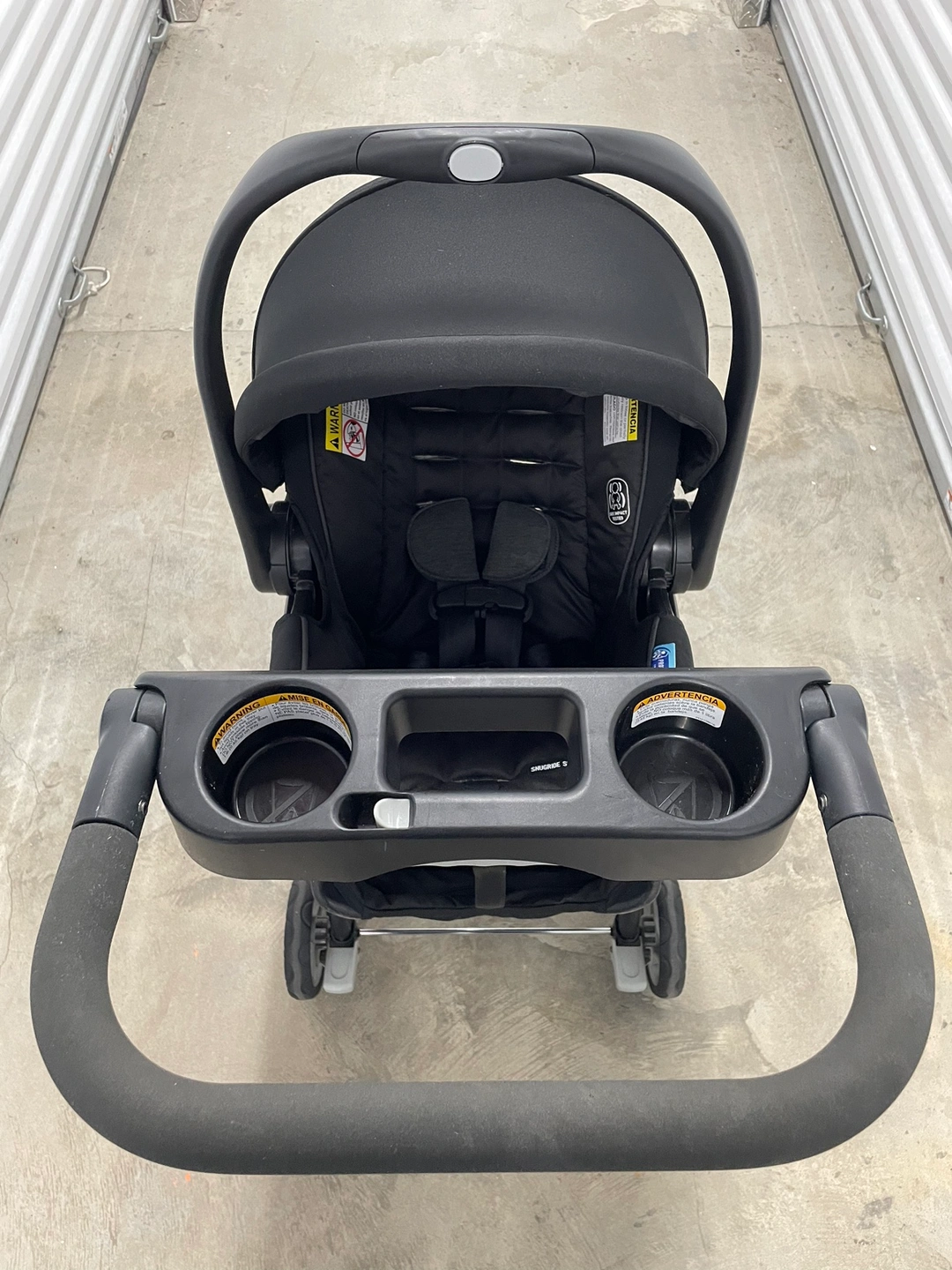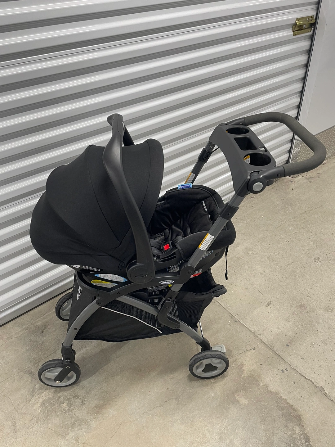Includes stroller, car seat, and base. Stroller has a cup holder and storage basket. Car seat and stroller are in great condition. CLEAN.