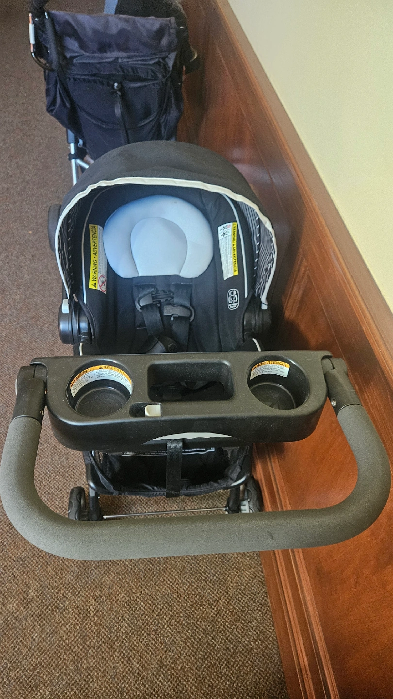 Selling a Graco travel system with the base in excellent condition, used once. It features a convenient parent tray with two cup holders and a storage area. The stroller also has a child's tray. Convenient for travel & erfect for walks.